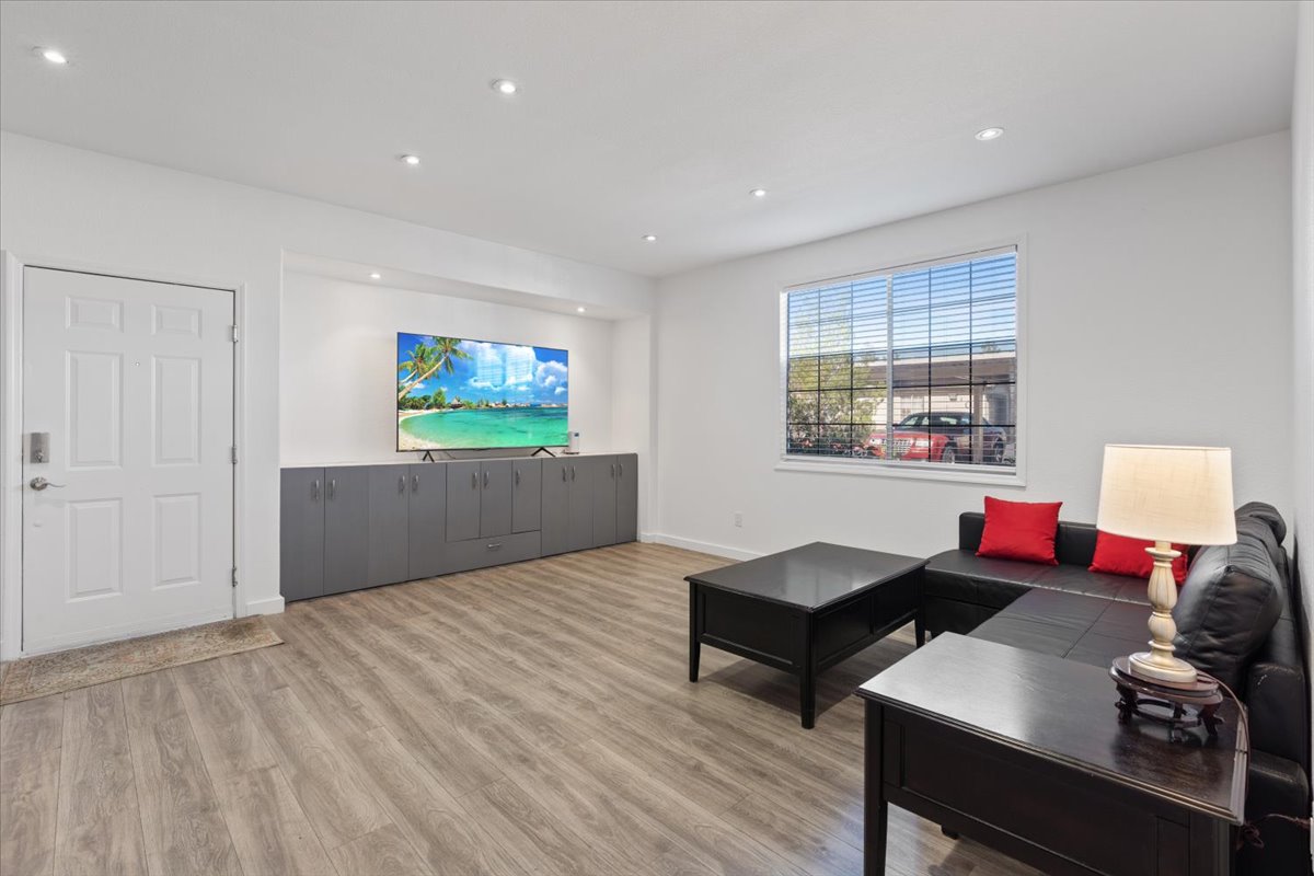 It is equipped with easy-care laminate flooring that extends throughout the home. The condo features custom LED lighting, creating a bright and welcoming ambiance. The spacious kitchen nook provides a perfect spot for meals, while the upgraded modern kitchen features stainless steel appliances, white cabinetry, an upgraded backsplash, a professional center hood, a black single-basin sink with a custom pull-out faucet, and granite countertops.
