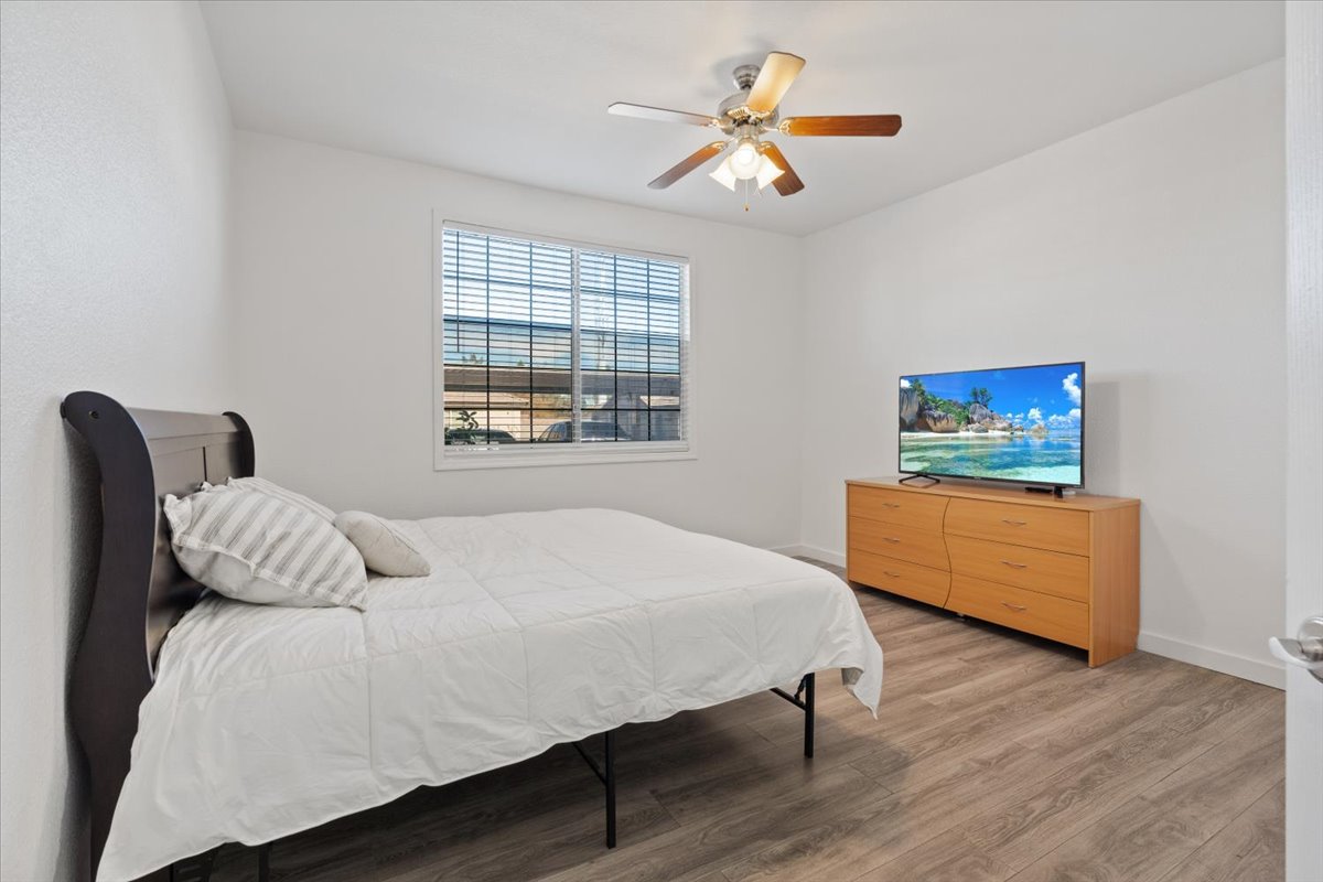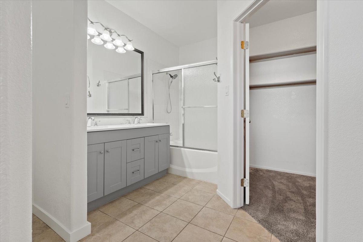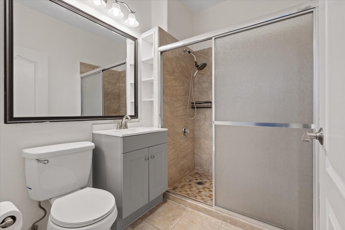 The primary bedroom offers ample space, featuring a large walk-in closet, and an ensuite bath. The primary bathroom is equipped with a large garden tub/shower, and brand new double sink furniture vanity. The guest bathroom has also been renovated, showcasing a walk-in shower with a new furniture vanity.