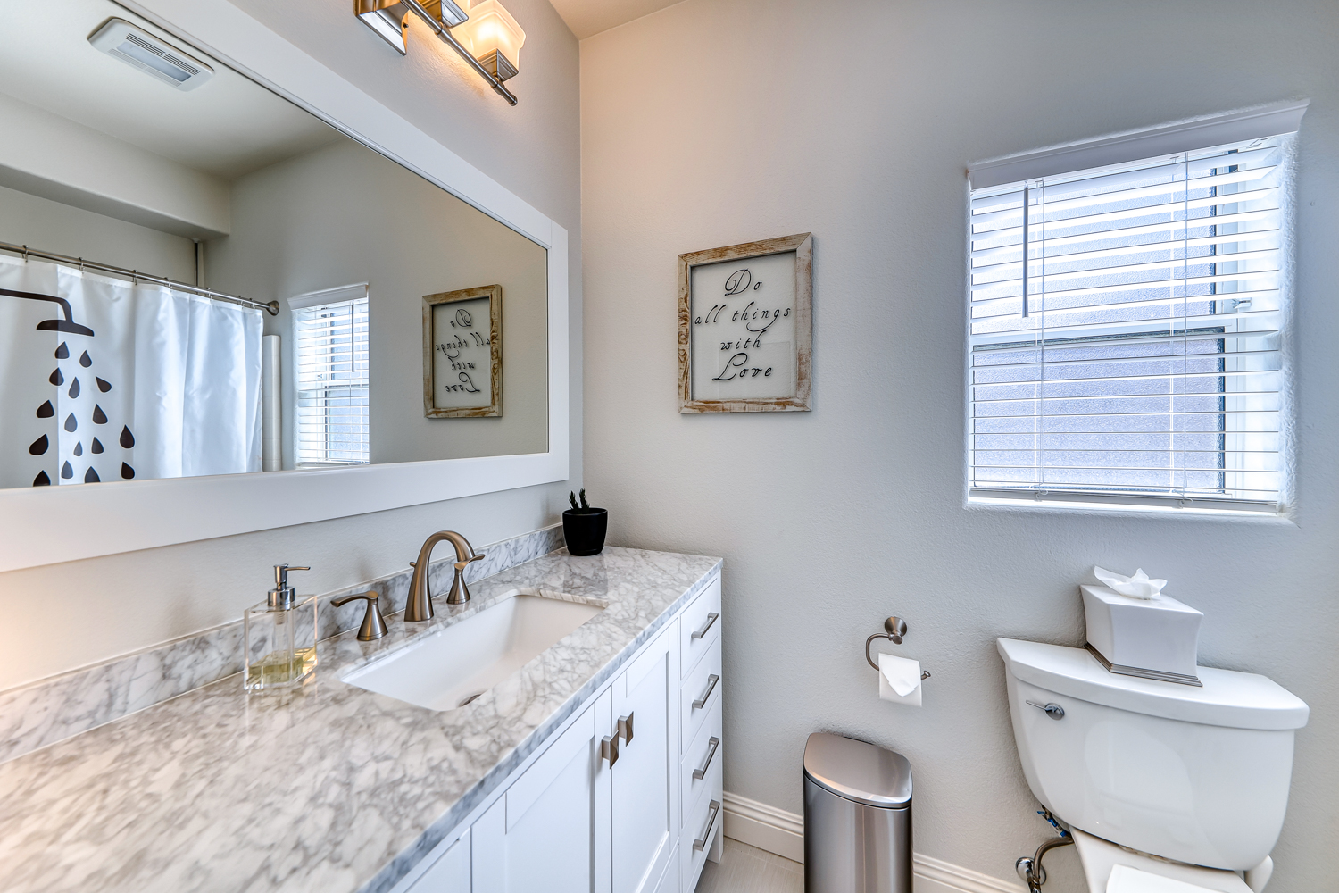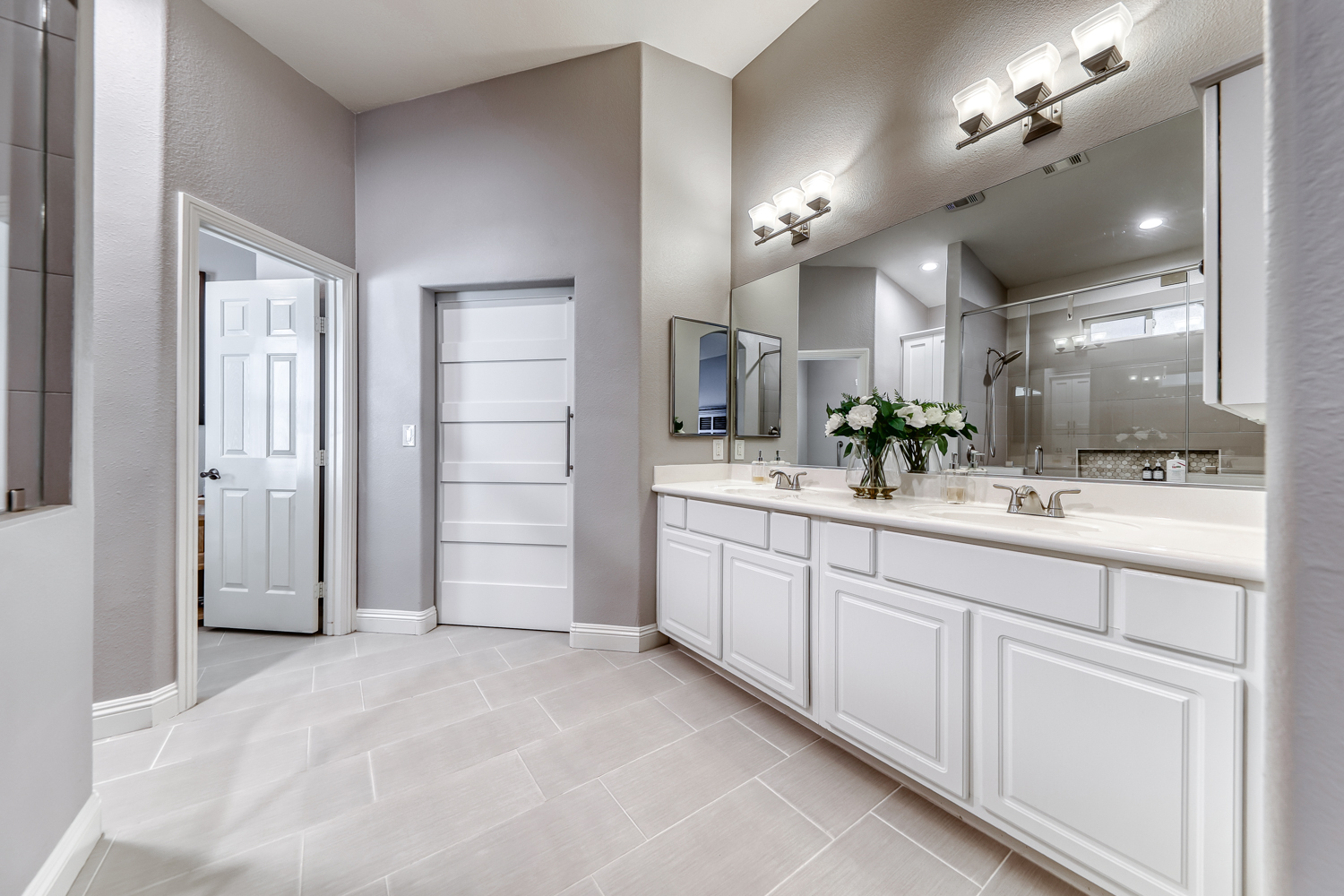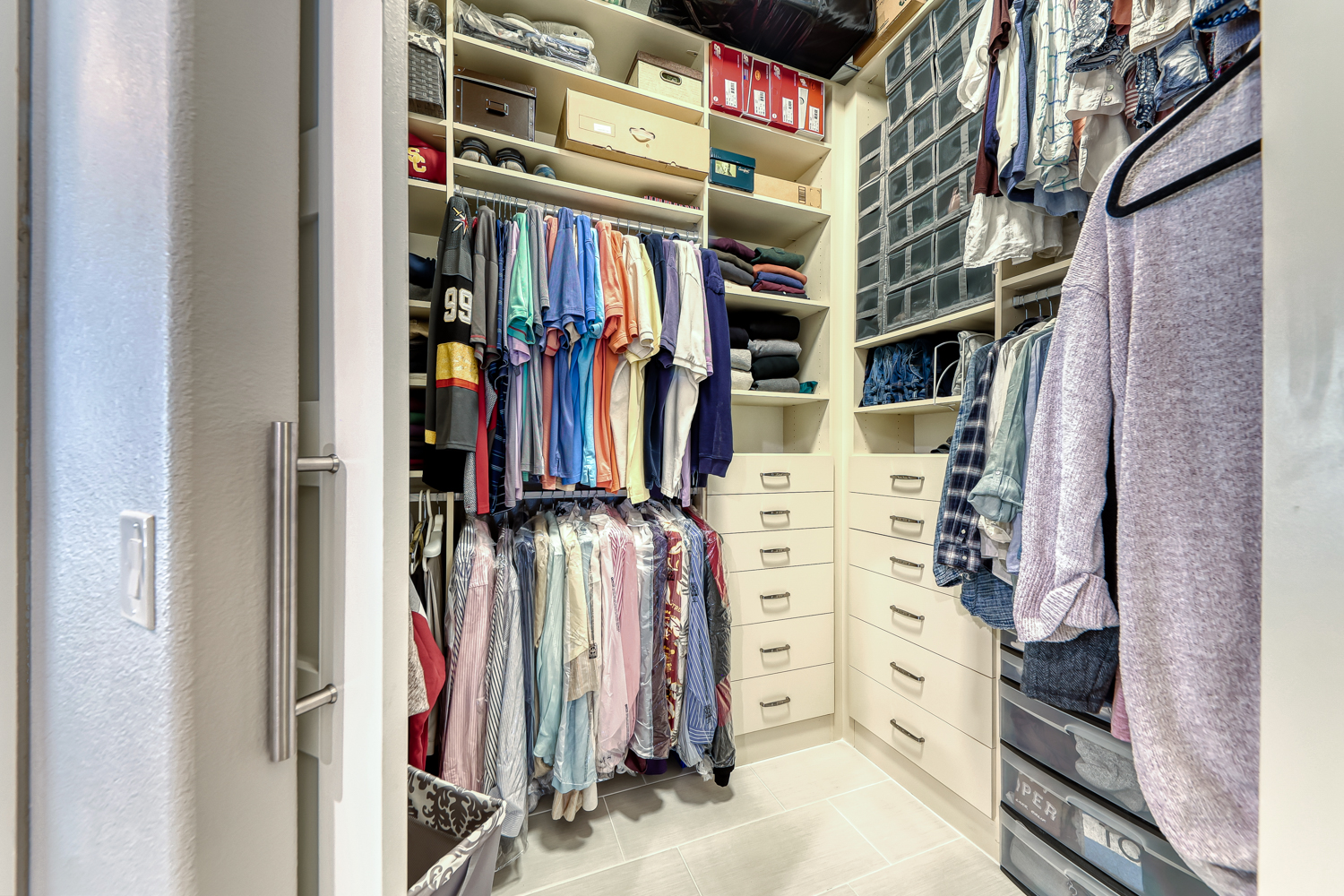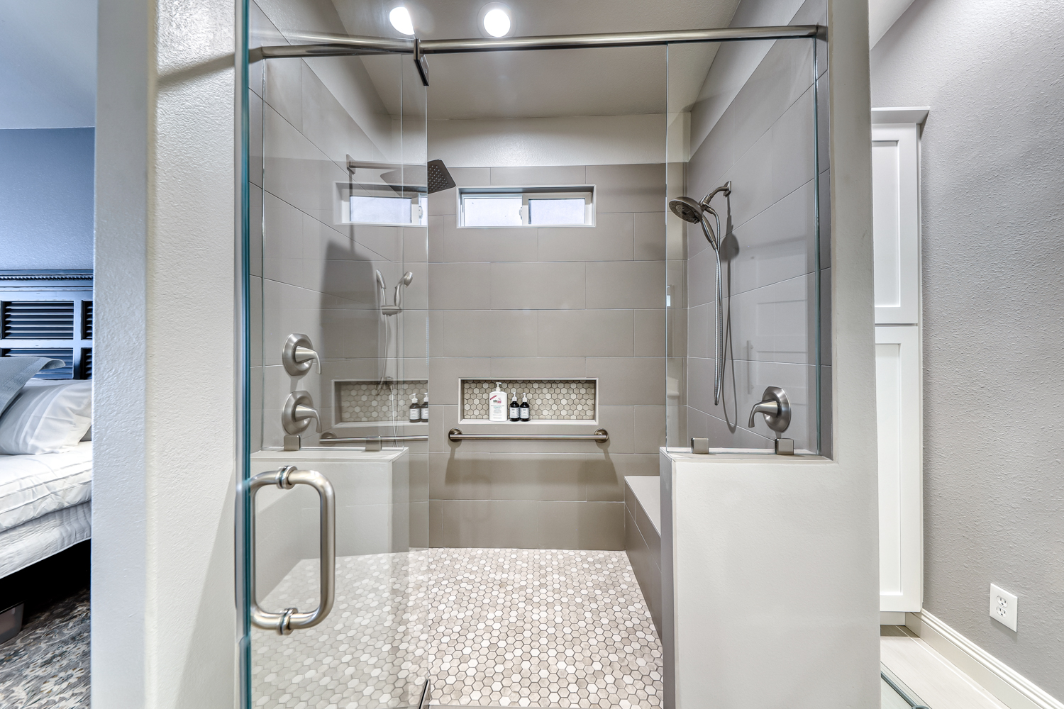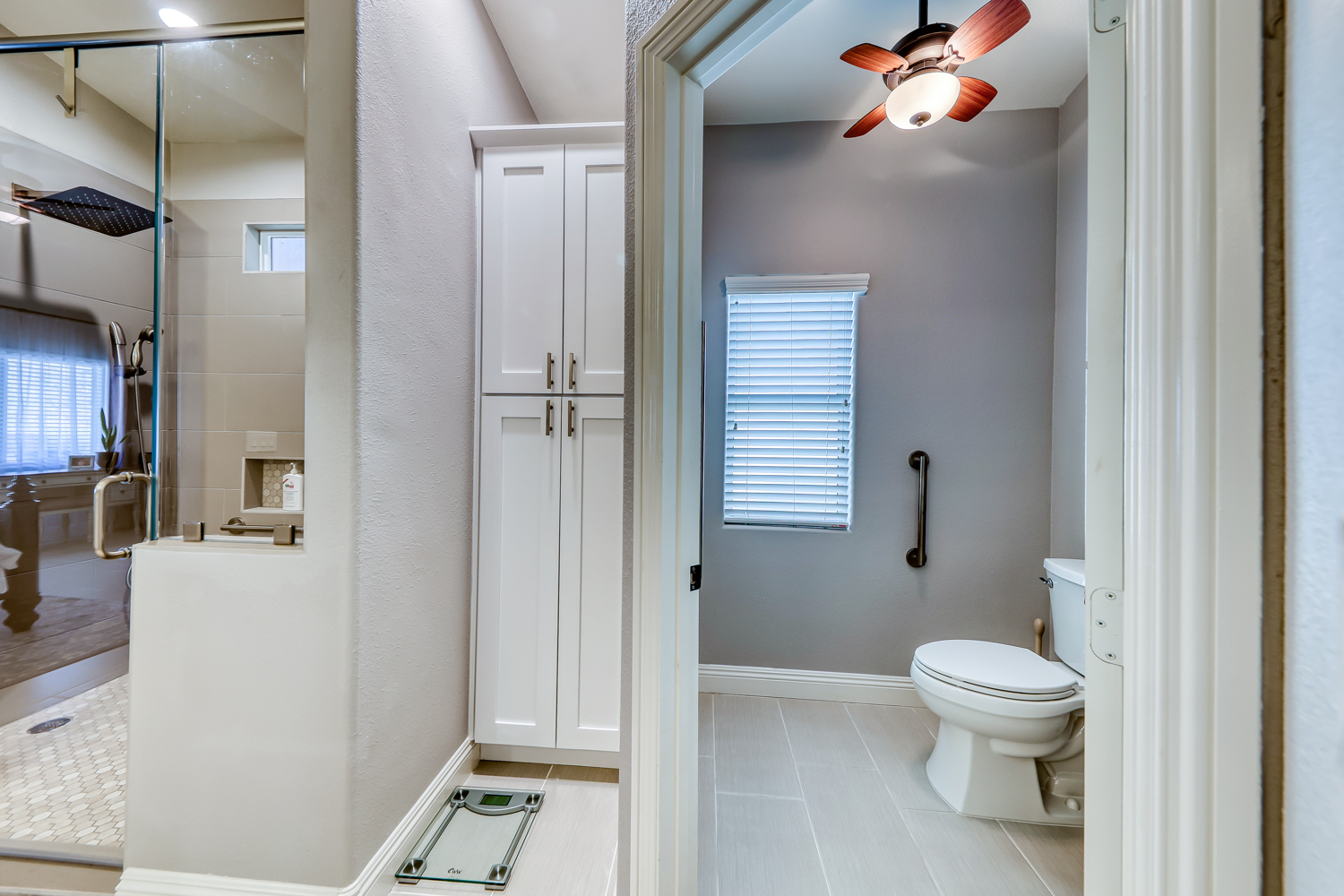 The Modern renovated bathroom features an oversized custom built-in Shower, a customized walk-in closet with plenty of built-in storage, plus a Barn door entry.