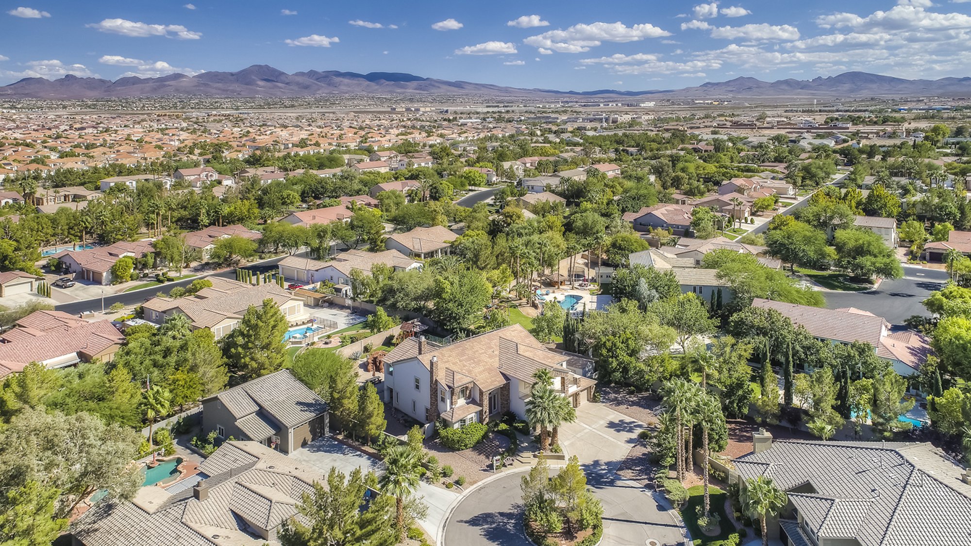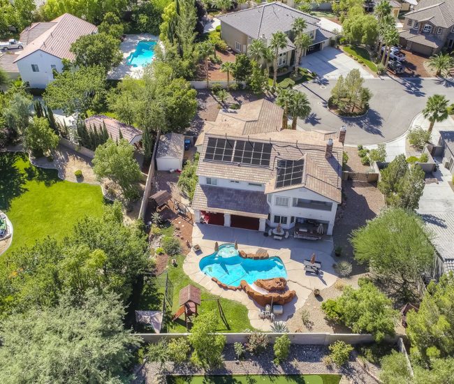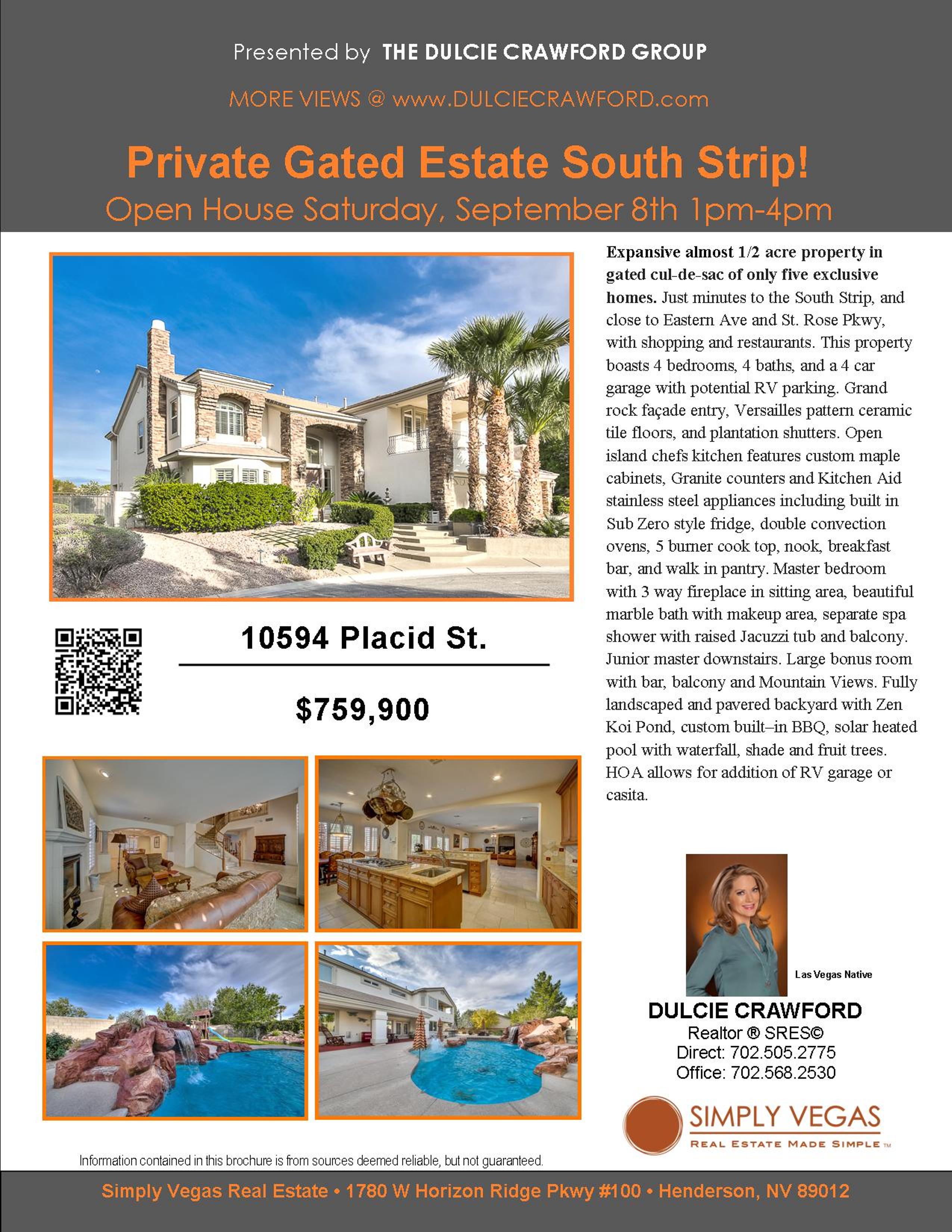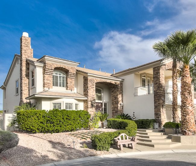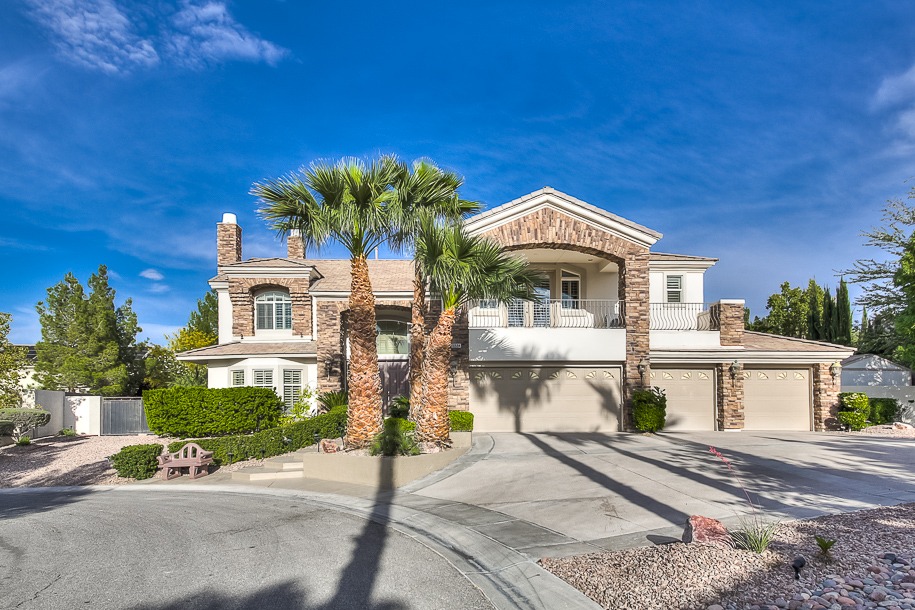 Expansive almost 1/2 acre property in gated cul-de-sac of only five exclusive homes. Just minutes to the South Strip, and close to Eastern Ave and St. Rose Pkwy, with shopping and restaurants. This property boasts 4 bedrooms, 4 baths, and a 4 car garage with potential RV parking. Grand rock facade entry, Versailles pattern ceramic tile floors, and plantation shutters. Open island chefs kitchen features custom maple cabinets, Granite counters and Kitchen Aid stainless steel appliances including built in Sub Zero style fridge, double convection ovens, 5 burner cook top, nook, breakfast bar, and walk in pantry. Master bedroom with 3 way fireplace in sitting area, beautiful marble bath with makeup area, separate spa shower with raised Jacuzzi tub and balcony. Junior master downstairs. Large bonus room with bar, balcony and Mountain Views. Fully landscaped and pavered backyard with Zen Koi Pond, custom built–in BBQ, solar heated pool with waterfall, shade and fruit trees. HOA allows for addition of RV garage or casita. Resort residence priced at $759,900