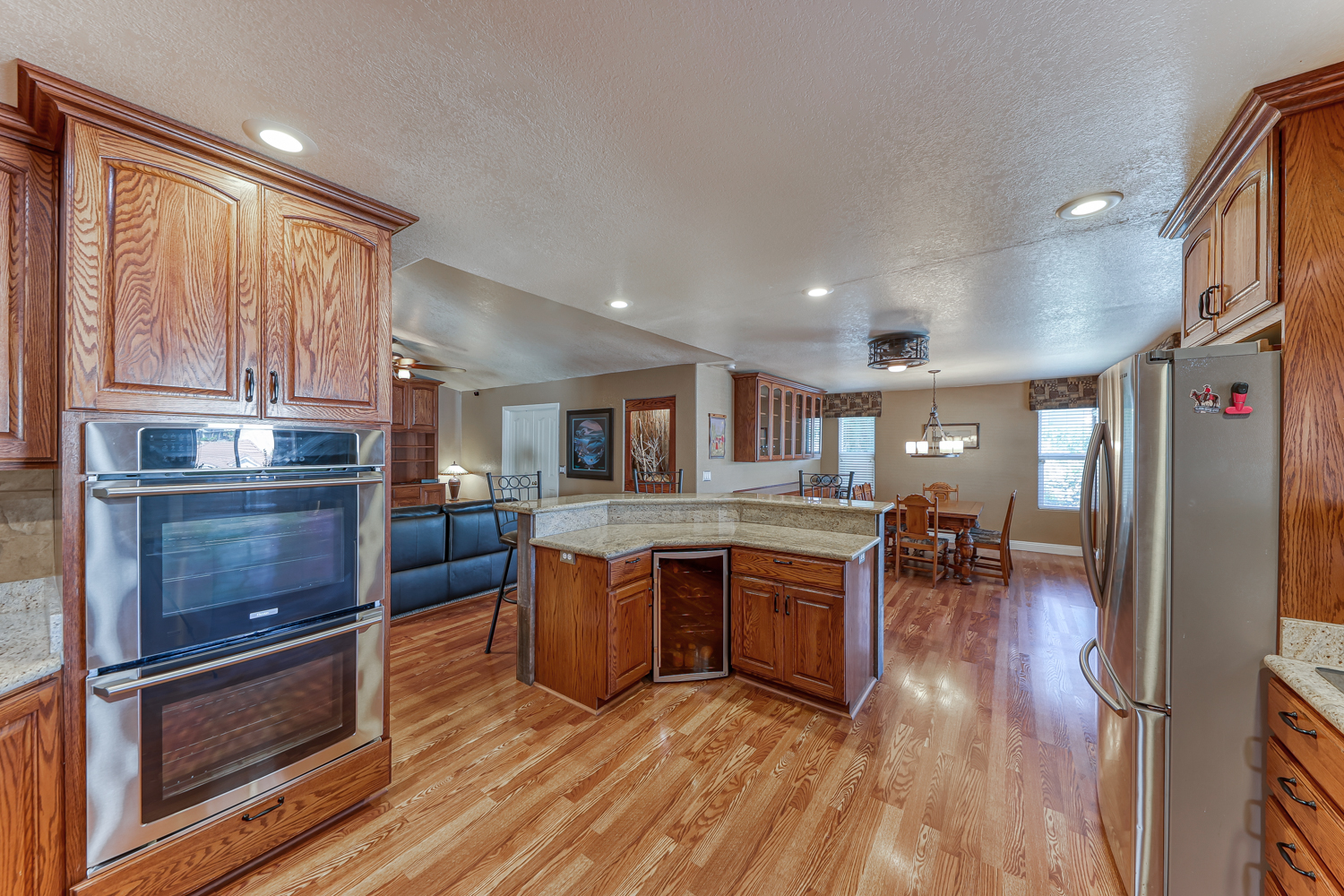 Functional family room is wide open to the breakfast bar kitchen that also leads over to a large dining room. The kitchen features granite countertops and custom cabinets. Soft-close doors and 42-in cabinets on the upside. Newer stainless steel appliance package including Electrolux convection double ovens and microwave and KitchenAid dishwasher. Plus a wine fridge.