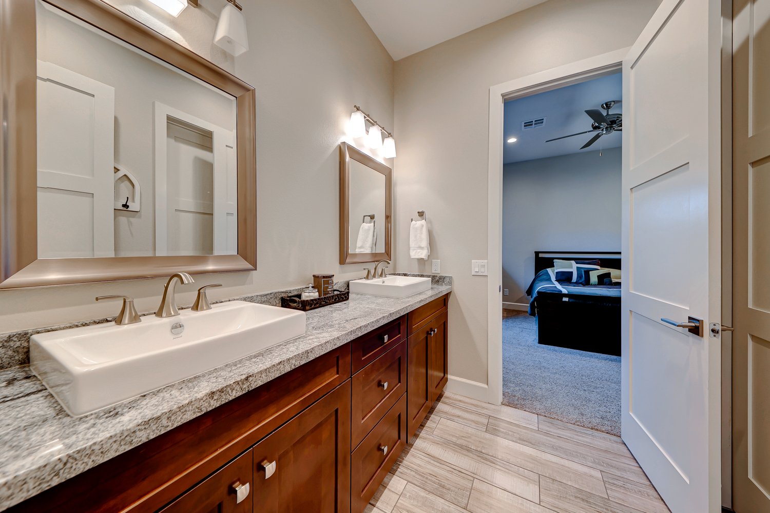The primary suite is on its own separate wing of the property. The private entryway leads either to the spacious bedroom with a private entrance to the rear patio area, or the luxury primary ensuite bathroom that features a large his & her custom closet, spacious double vanities, a spa-style soaking tub, and the custom walk-in shower with body jets and rain shower.