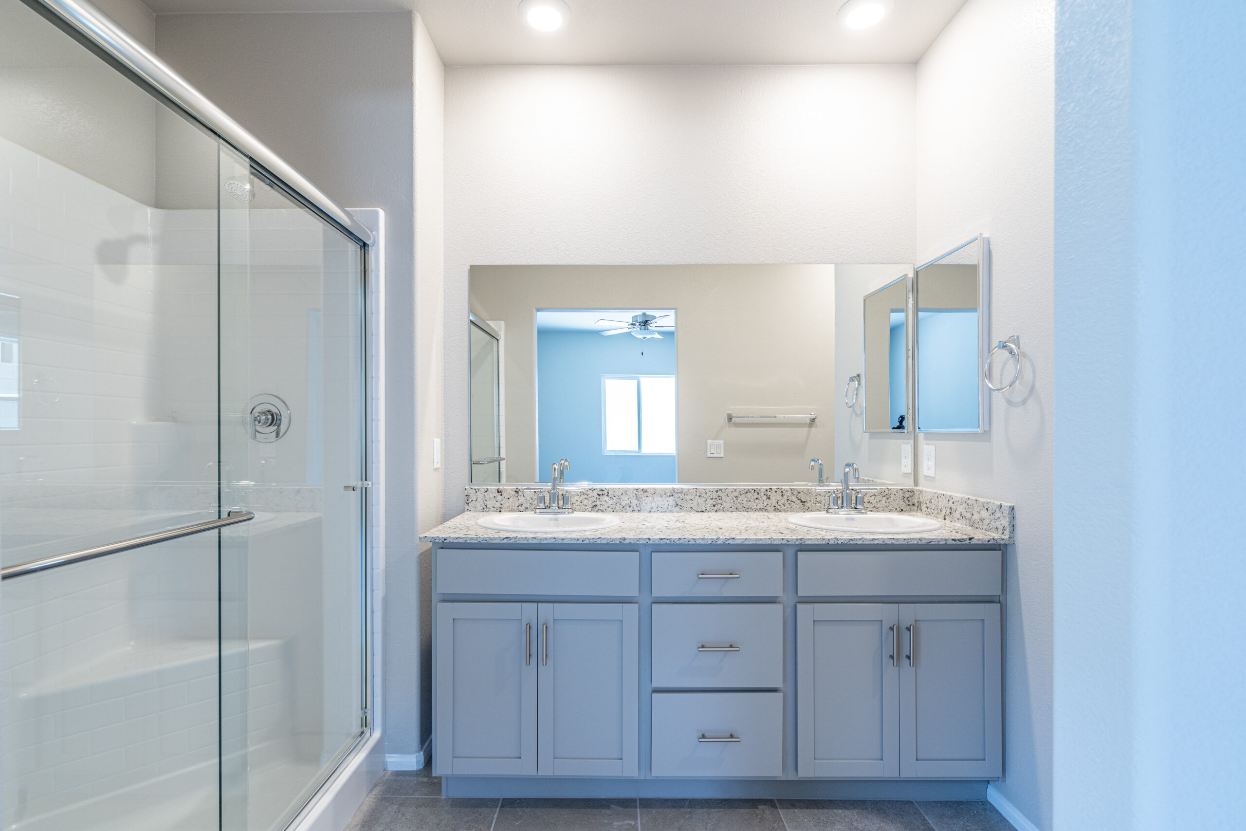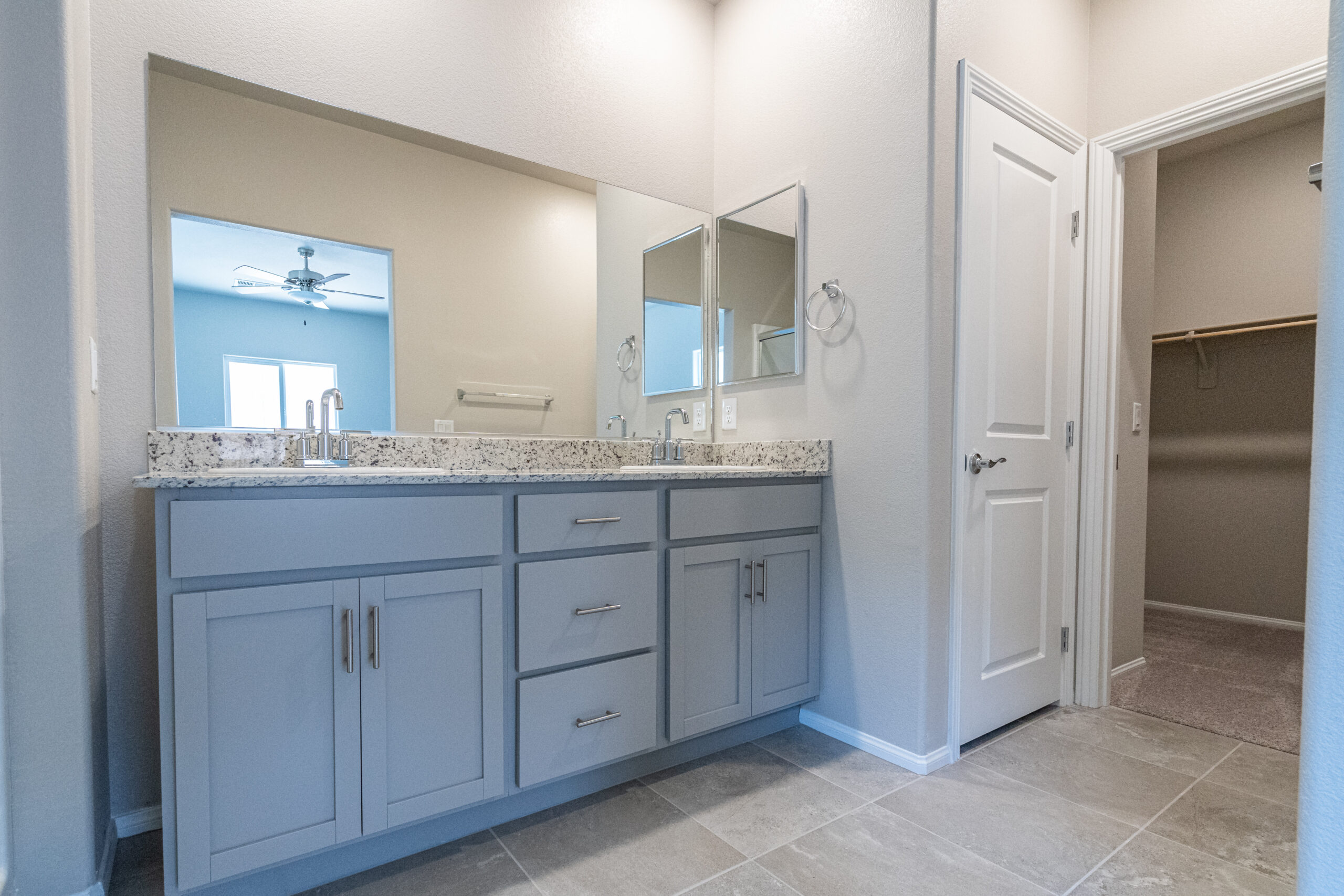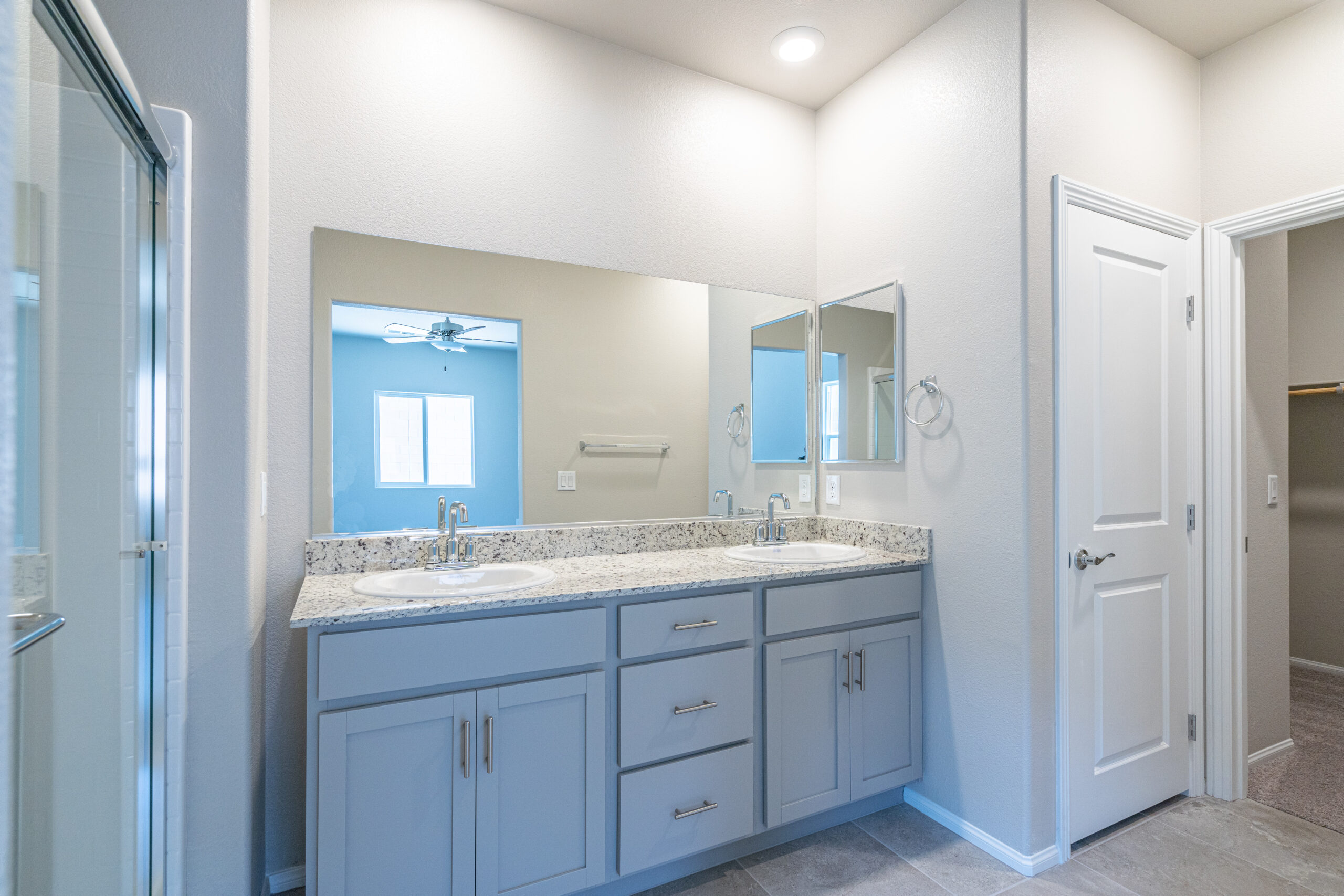 Primary Bedroom is spacious and includes an en suite bath with Granite counters on European height vanities, walk-in shower & closet. Ceiling fans at primary & family room.