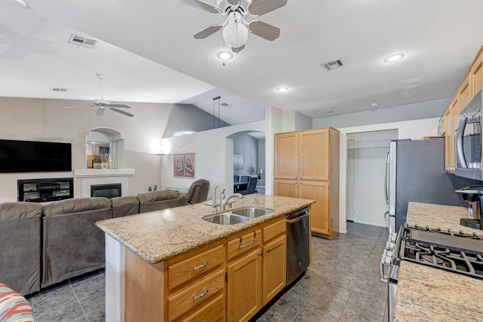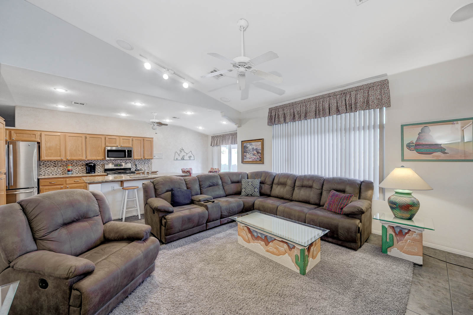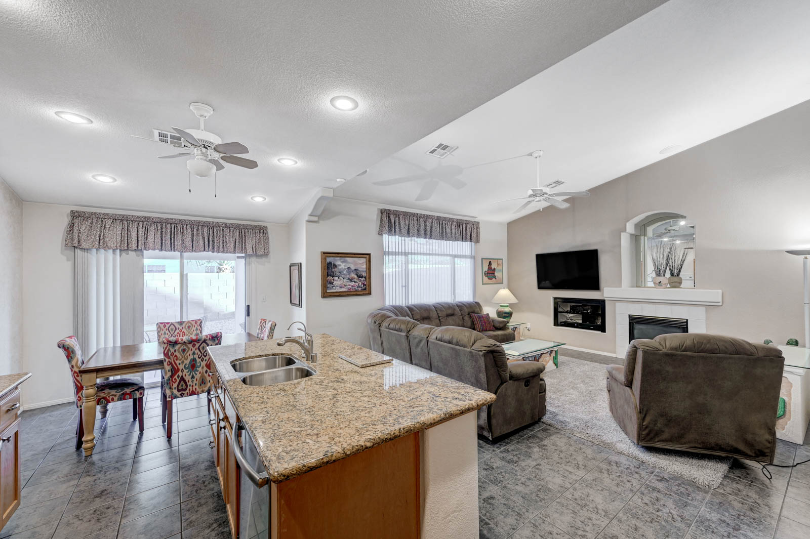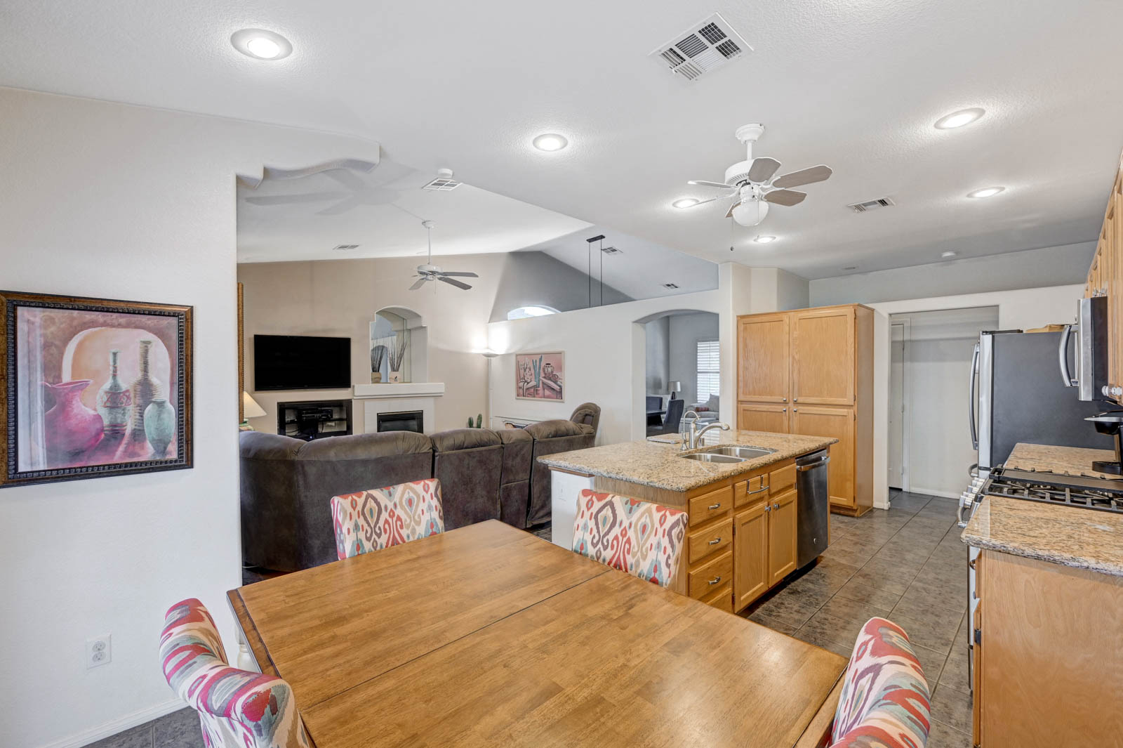 Front living room w/ dining area & separate family room w/ Gas fireplace & ceiling fans in all bedrooms.