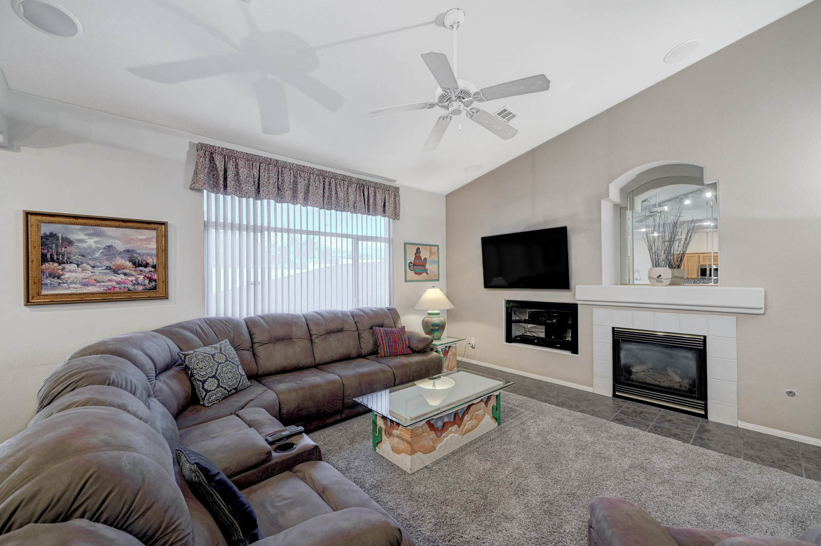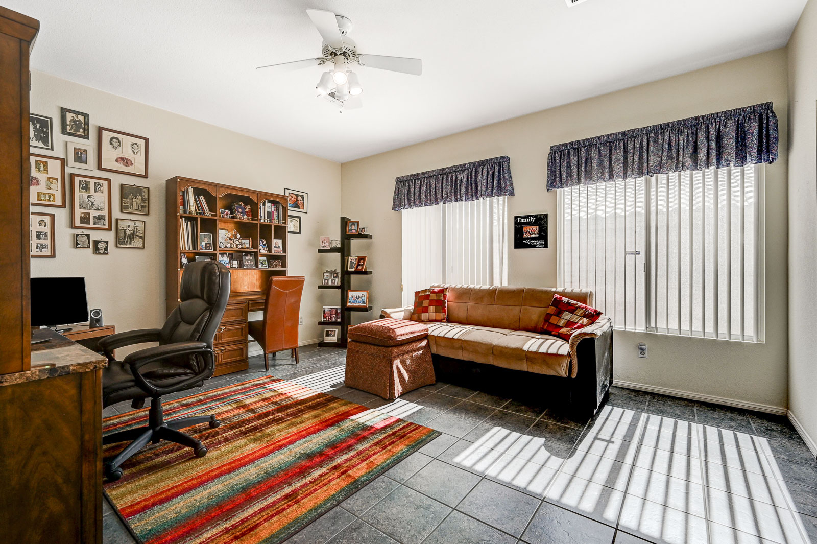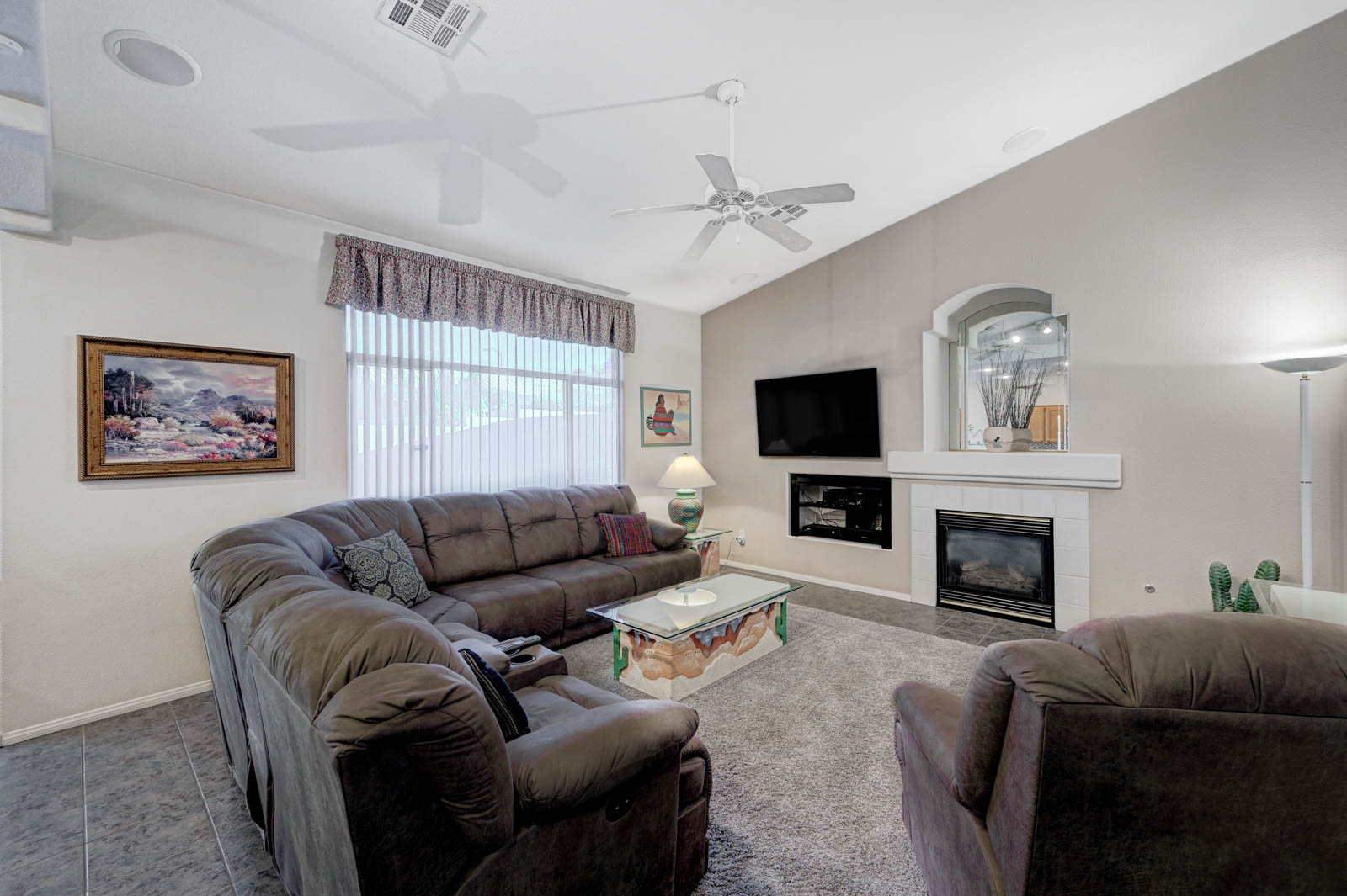 Front living room w/ dining area & separate family room w/ Gas fireplace & ceiling fans in all bedrooms.