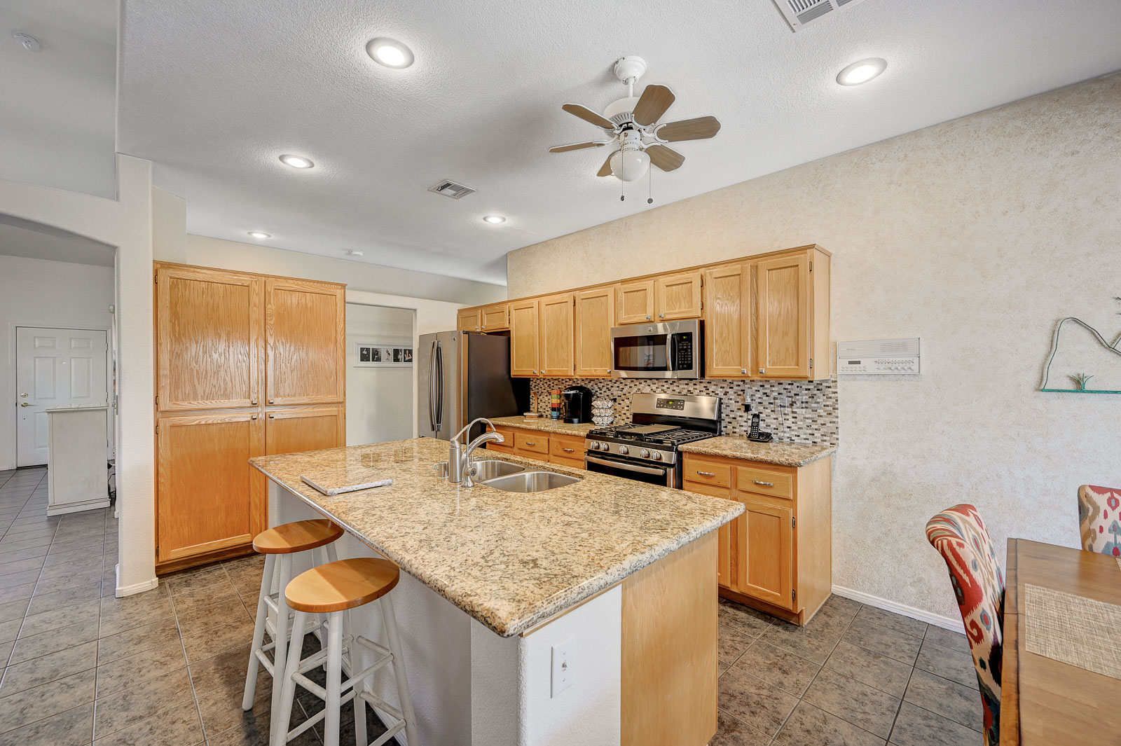Island Kitchen has upgraded Granite countertops with upgraded backsplash. Upgraded 42 Inch Oak cabinets and upgraded newer GE Stainless Steel appliances including Refrigerator.
