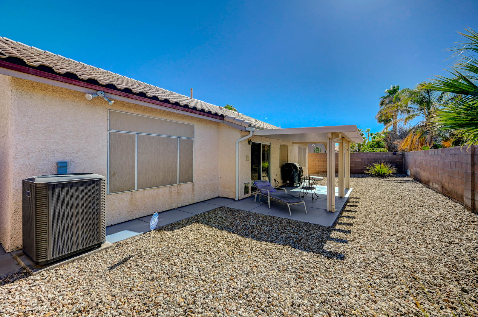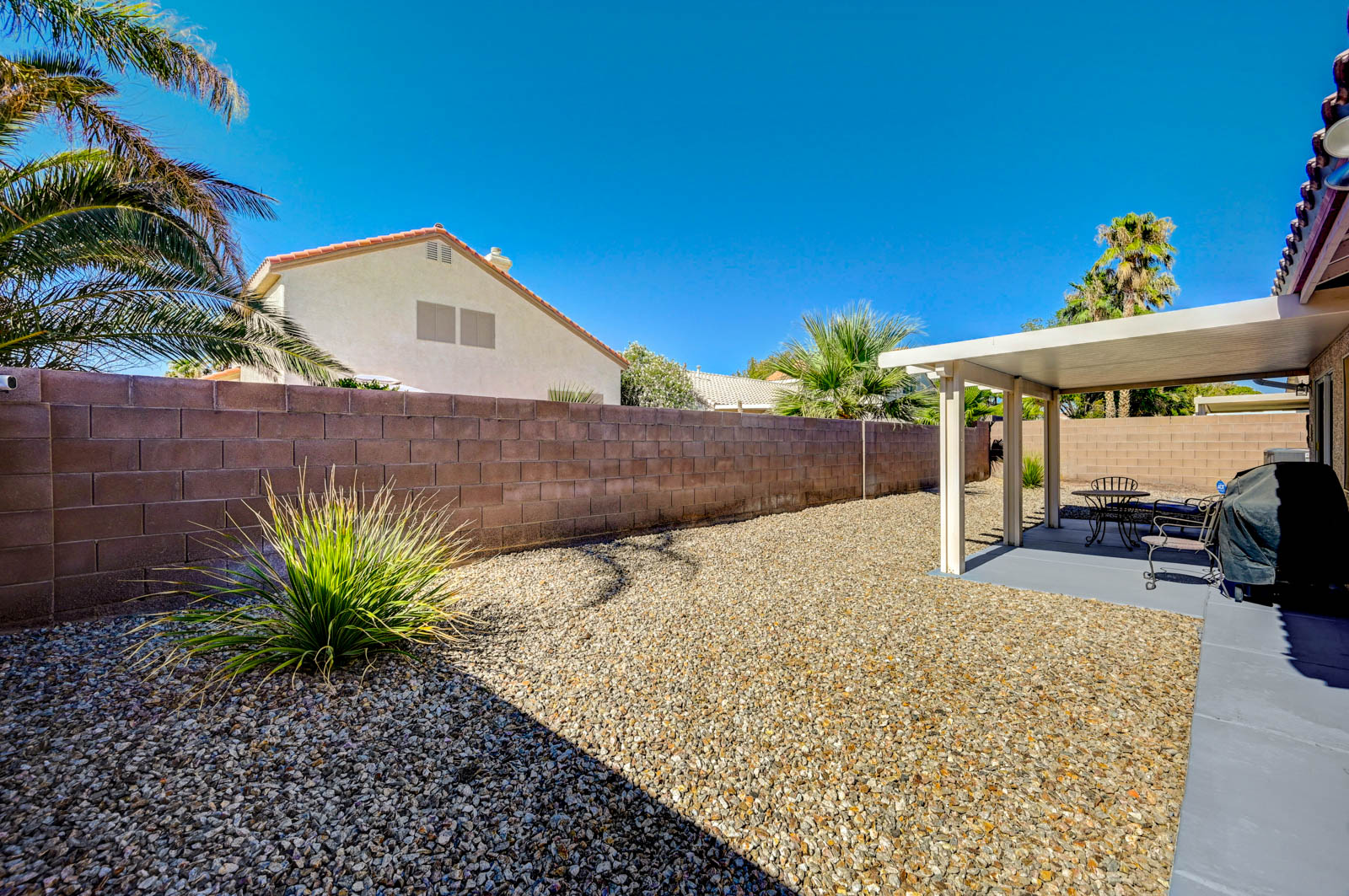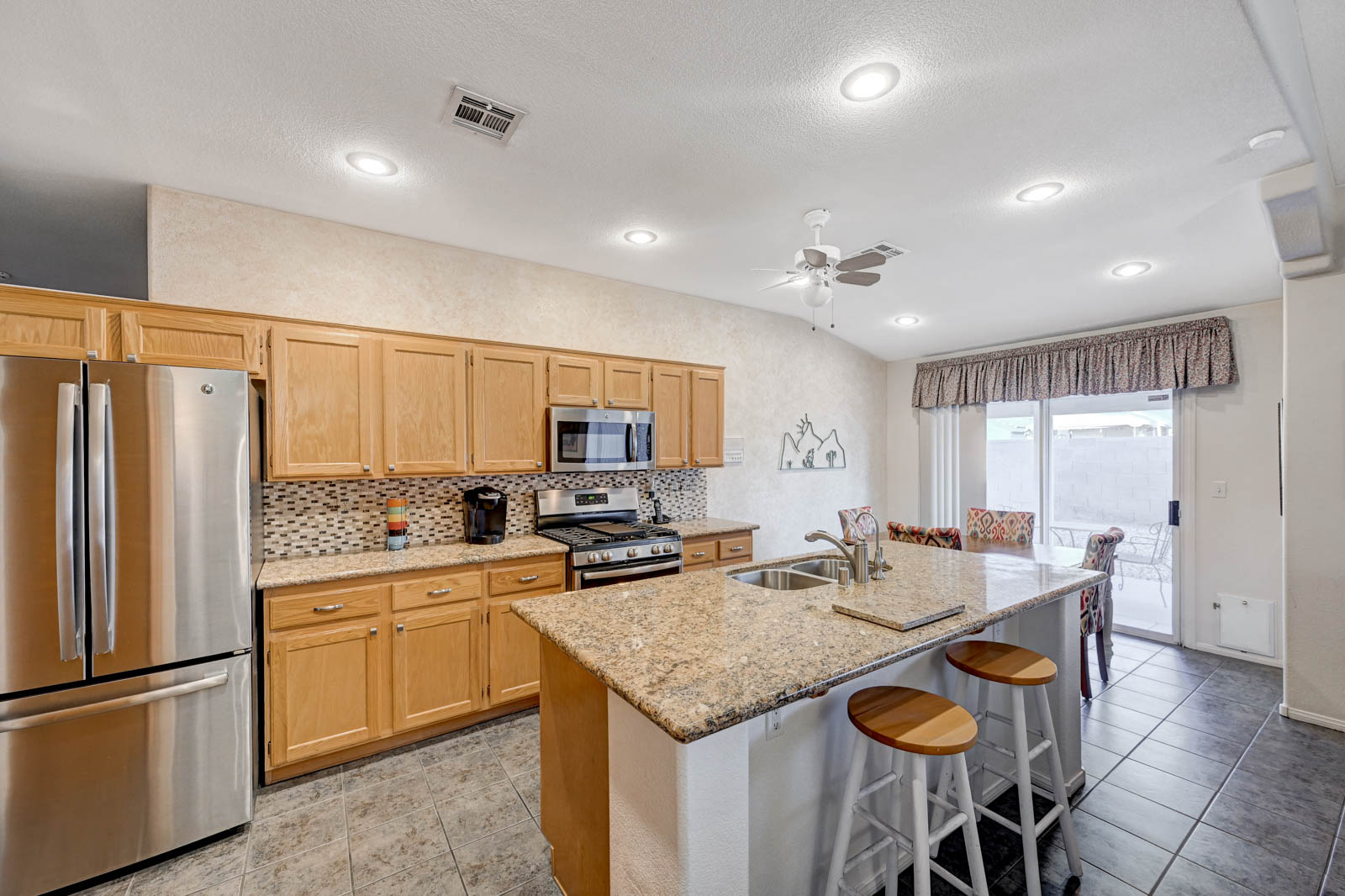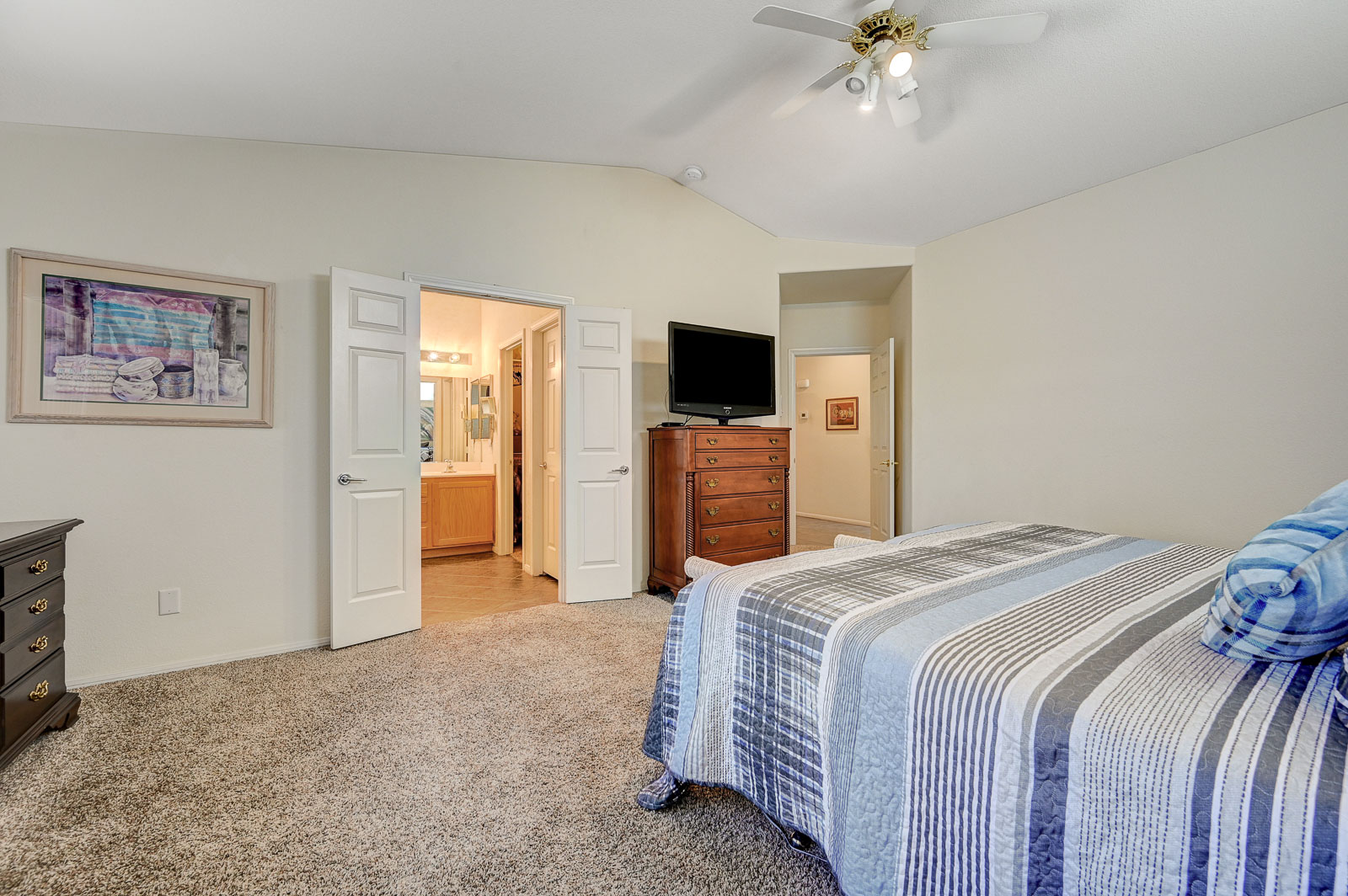 Primary Bedroom suite w/ ceiling fan & walk-in closet, EnSuite primary bath with double Sinks, soaking Tub and Walk-in Shower, Private yard with full length patio cover and low maintenance desert landscaping.