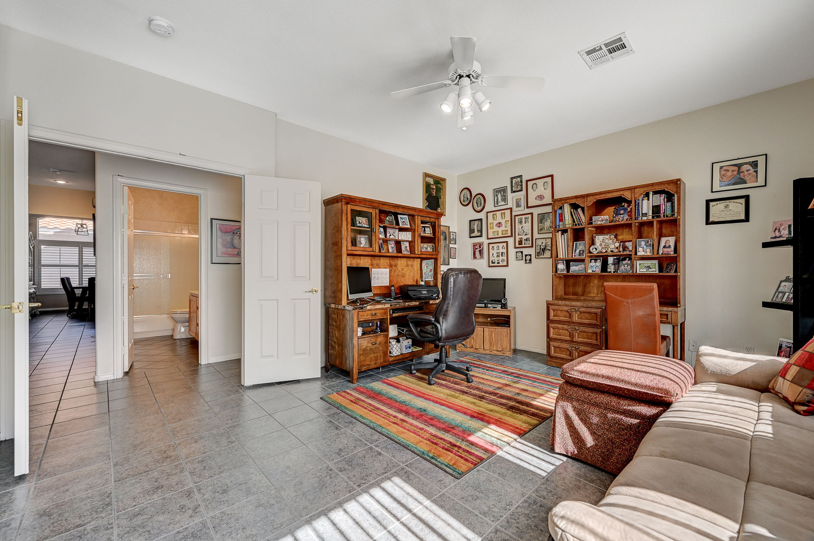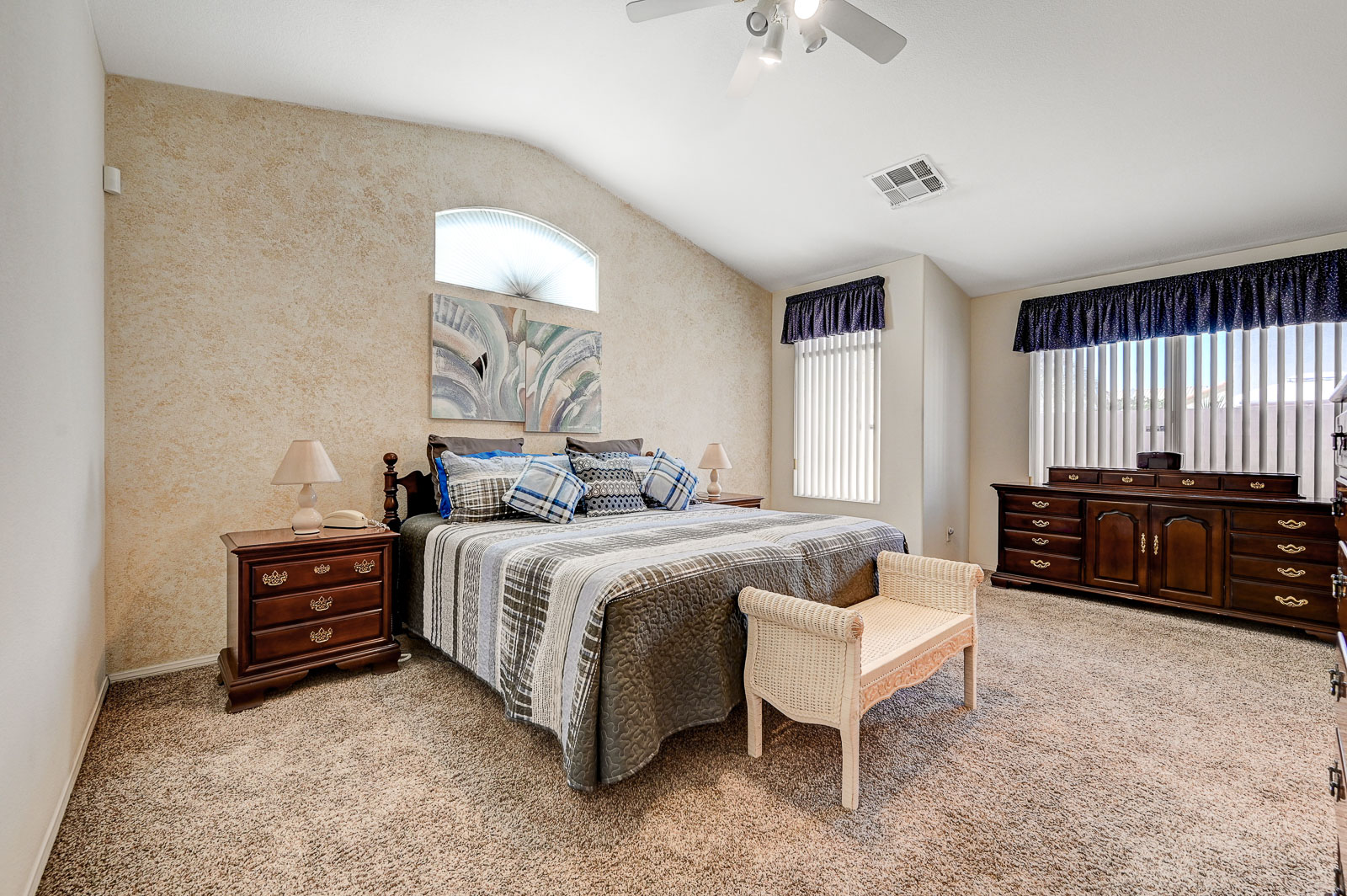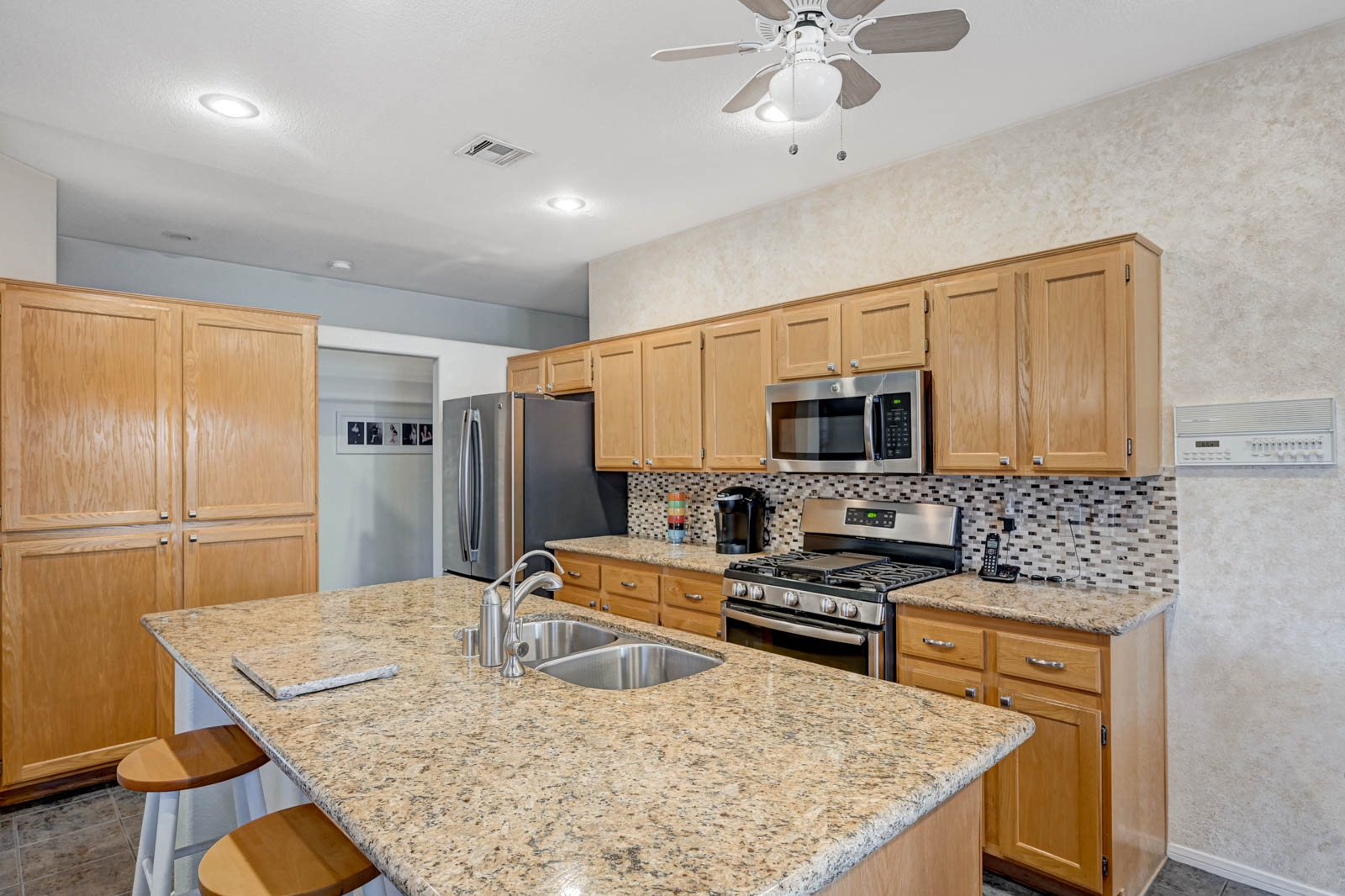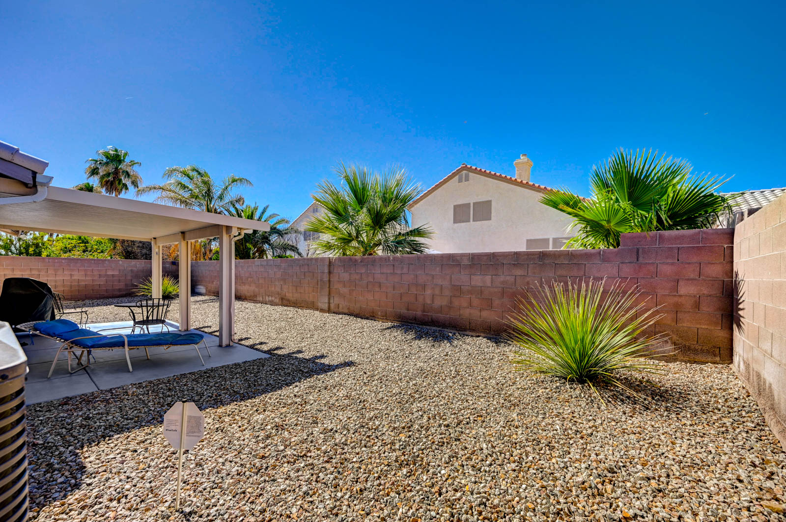 Primary Bedroom suite w/ ceiling fan & walk-in closet, EnSuite primary bath with double Sinks, soaking Tub and Walk-in Shower, Private yard with full length patio cover and low maintenance desert landscaping.