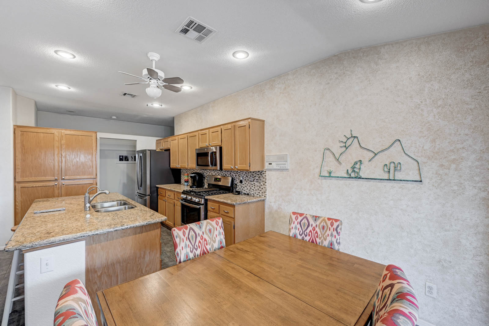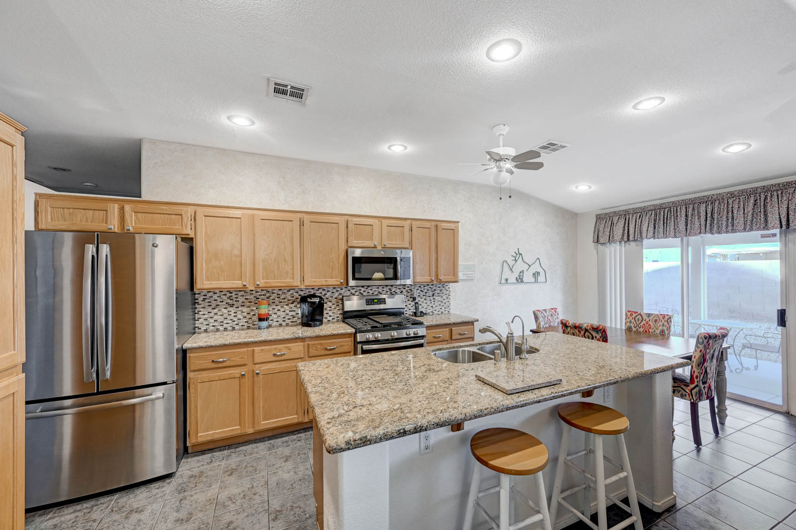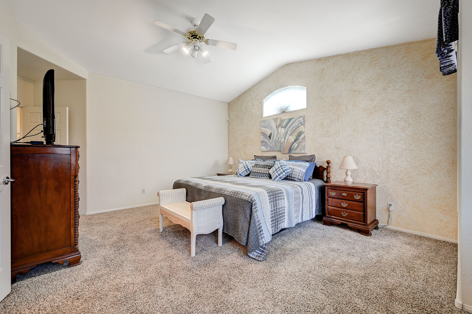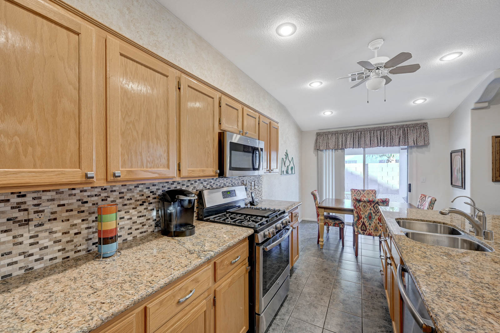 Primary Bedroom suite w/ ceiling fan & walk-in closet, EnSuite primary bath with double Sinks, soaking Tub and Walk-in Shower, Private yard with full length patio cover and low maintenance desert landscaping.