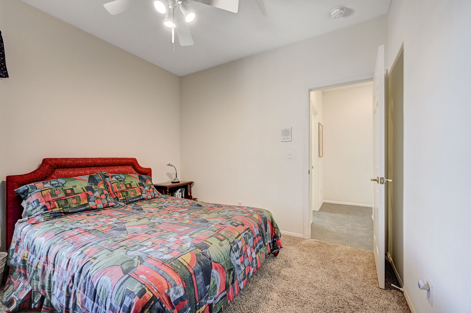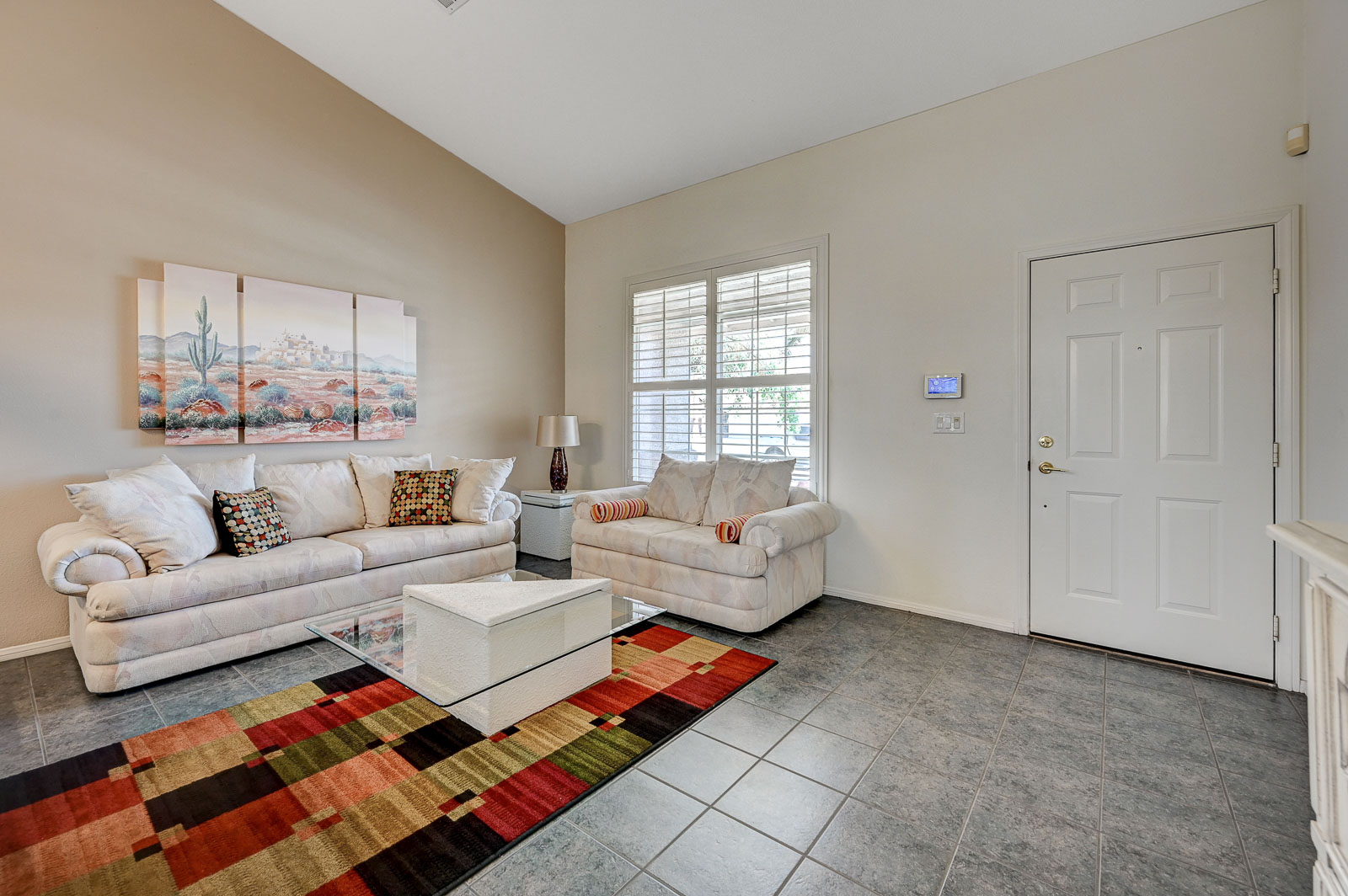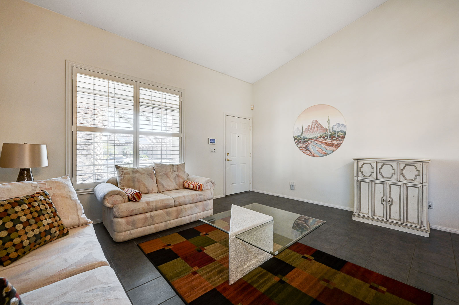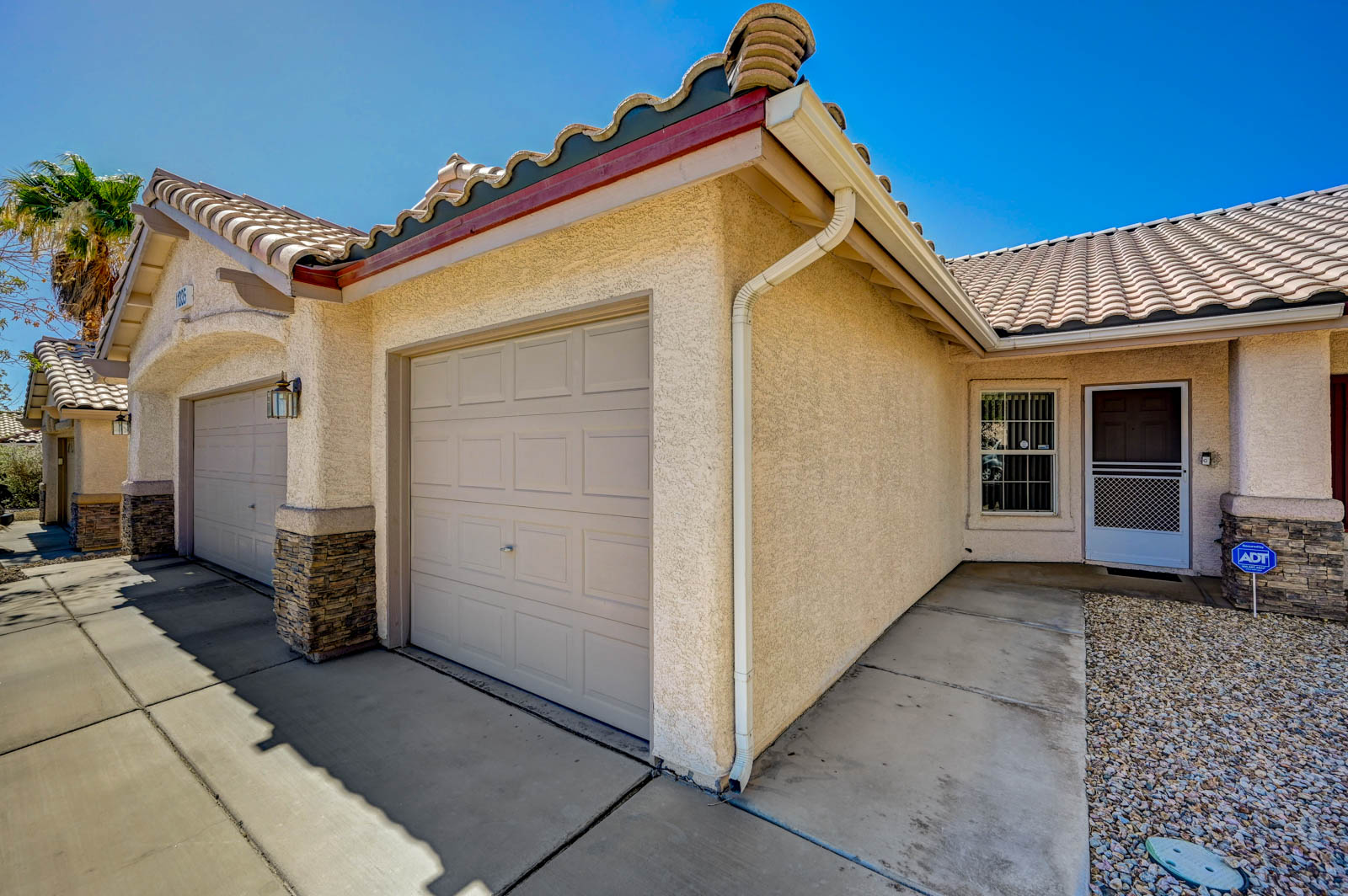 Primary Bedroom suite w/ ceiling fan & walk-in closet, EnSuite primary bath with double Sinks, soaking Tub and Walk-in Shower, Private yard with full length patio cover and low maintenance desert landscaping.
