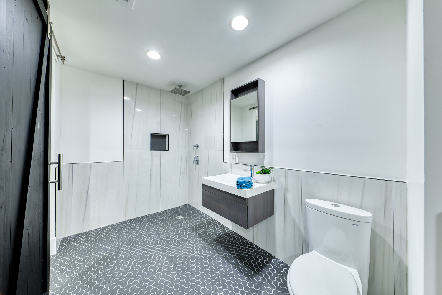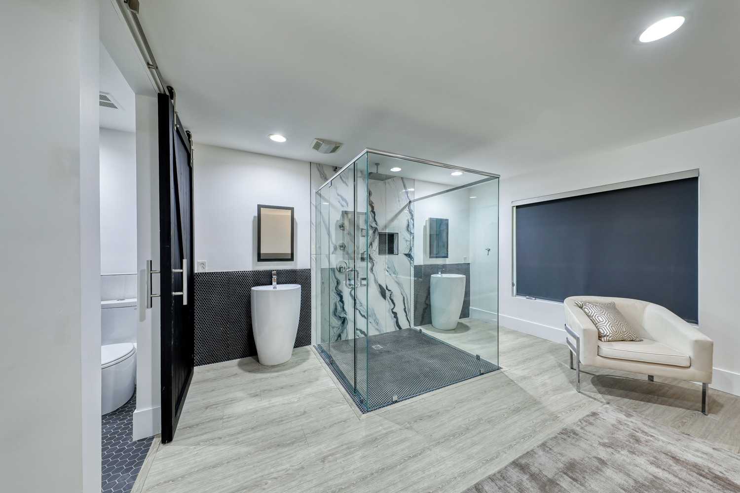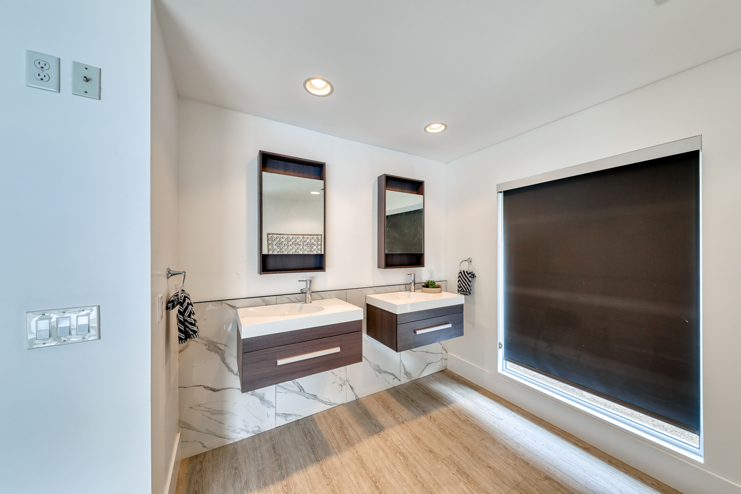 Two Main Ensuite bedrooms are spacious & luxurious w/ open concept European style bathrooms & modern vanities. Main suite features a huge walk-in Rain shower in Calcutta Marble. Guest Bathroom is also a showstopper finished in black Italian Porcelain Tile.