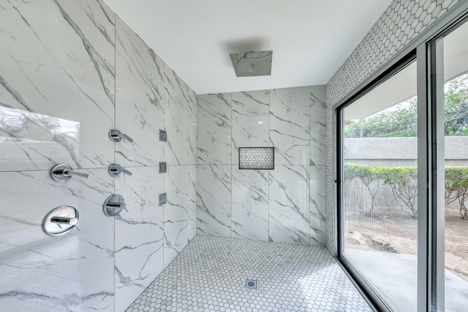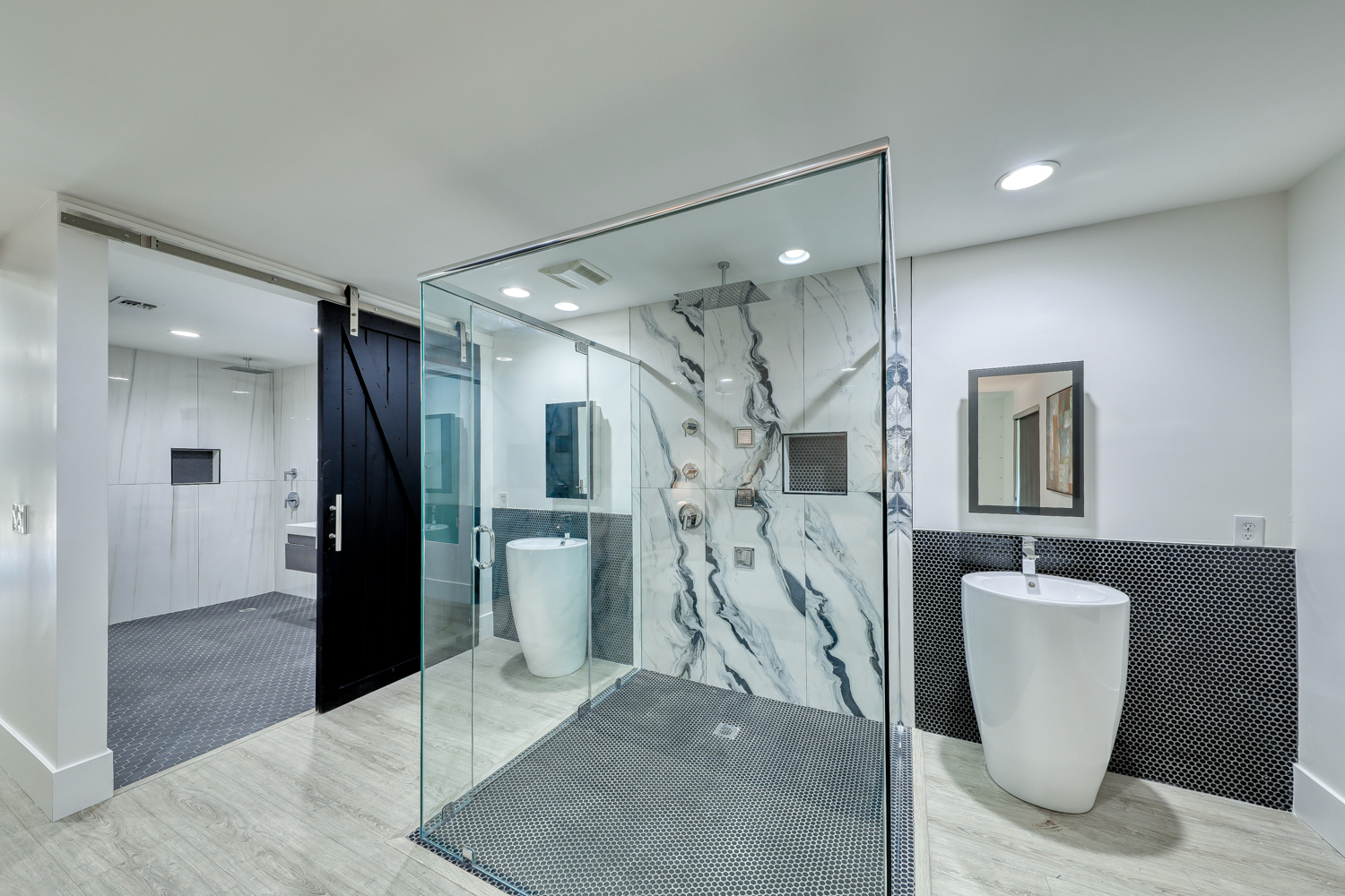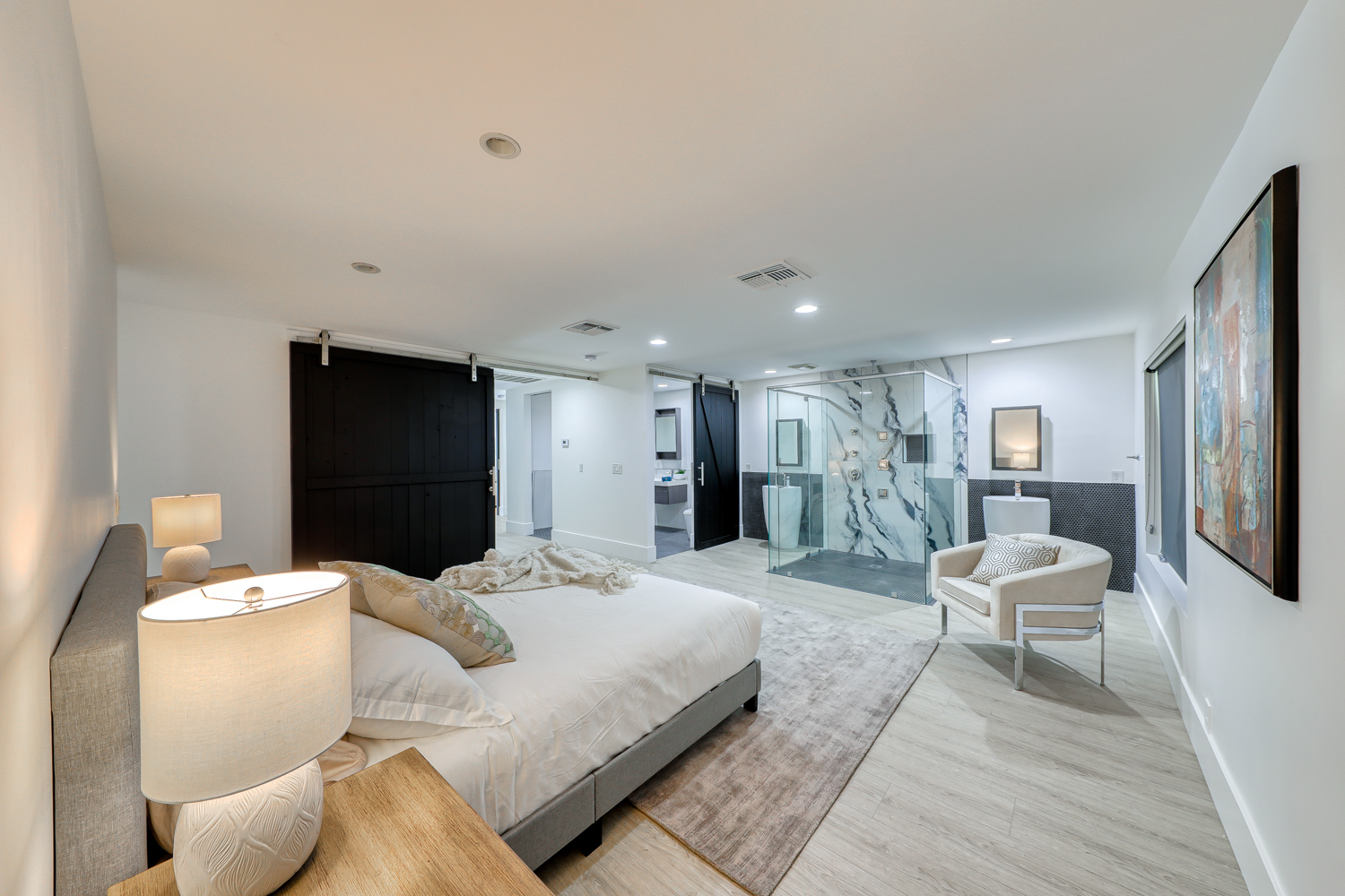 Two Main Ensuite bedrooms are spacious & luxurious w/ open concept European style bathrooms & modern vanities. Main suite features a huge walk-in Rain shower in Calcutta Marble. Guest Bathroom is also a showstopper finished in black Italian Porcelain Tile.