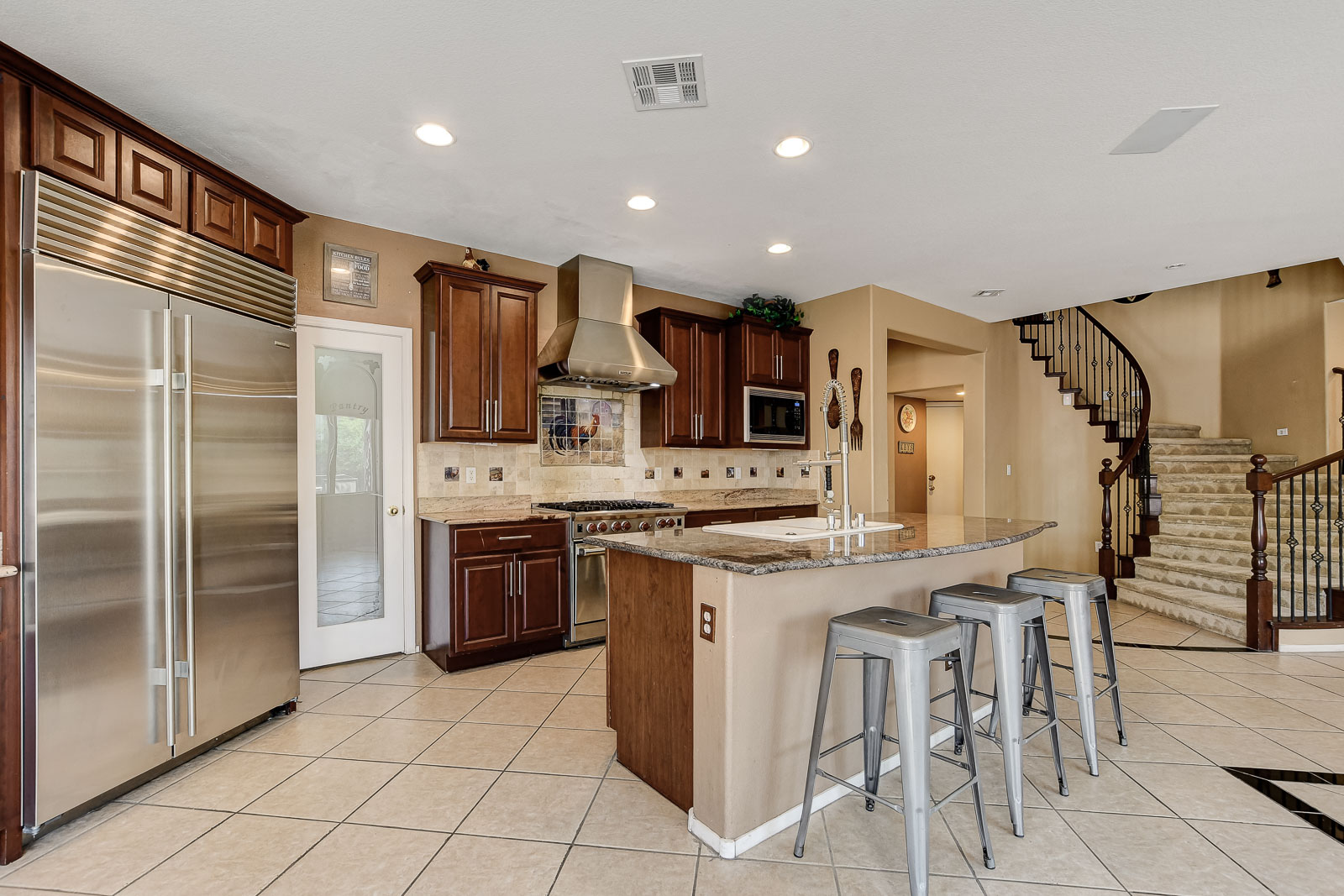 The kitchen features upgraded Granite counters, 42 inch custom Cherry cabinets with a Wolf 6 burner cooktop range plus Sub-Zero refrigerator and a Bosh dishwasher.
