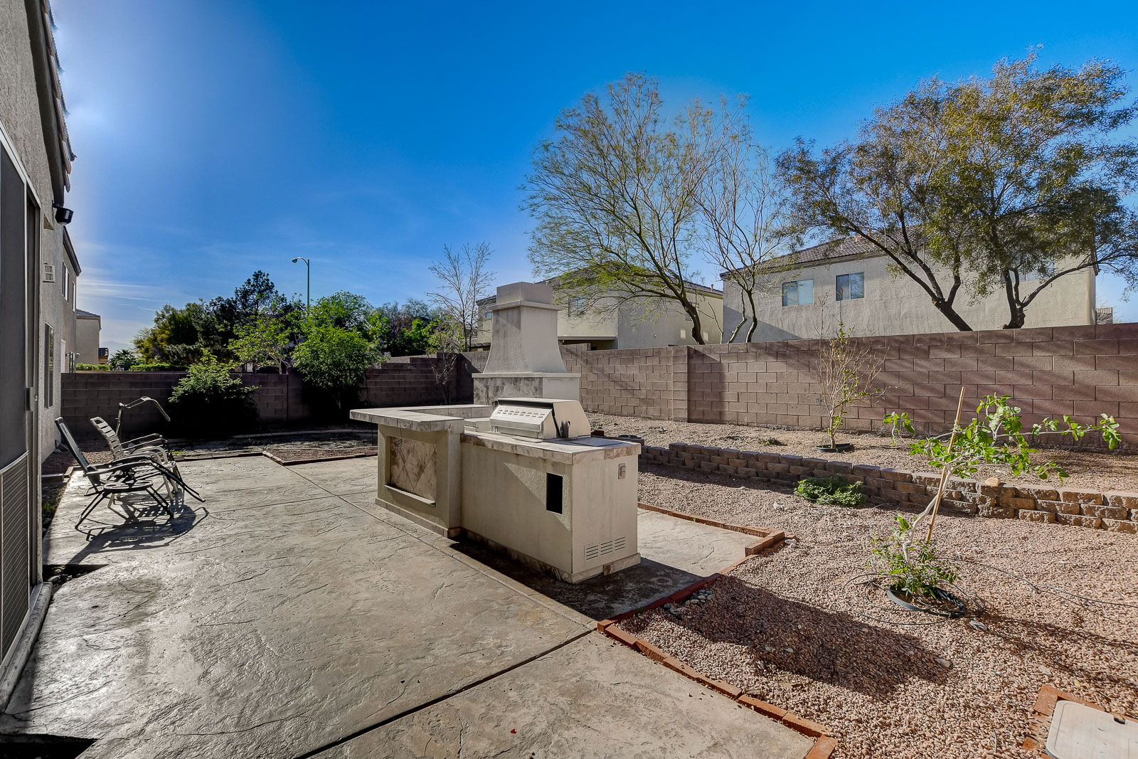 The backyard features a custom built-in barbecue space plus custom outdoor fireplace and large patio.