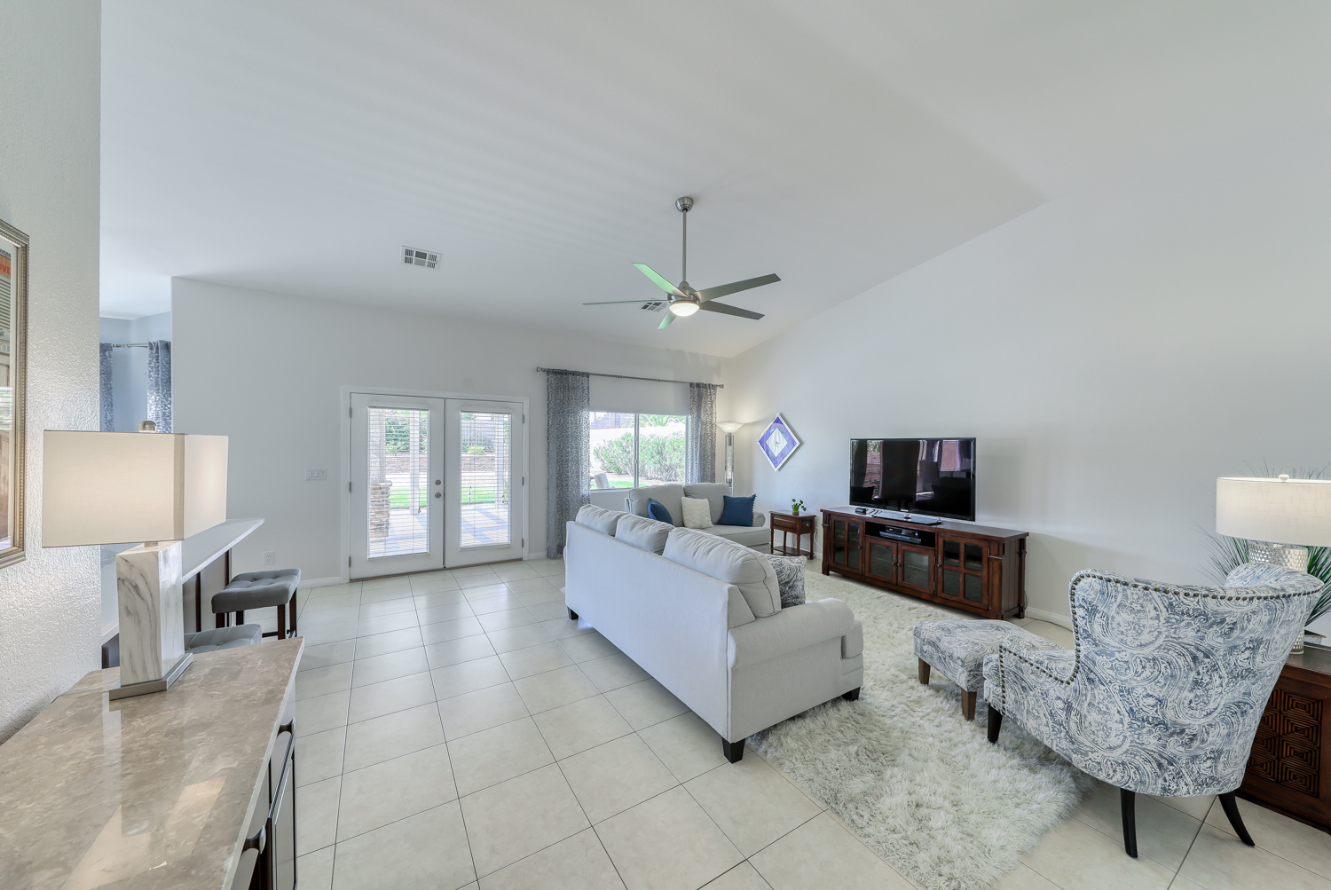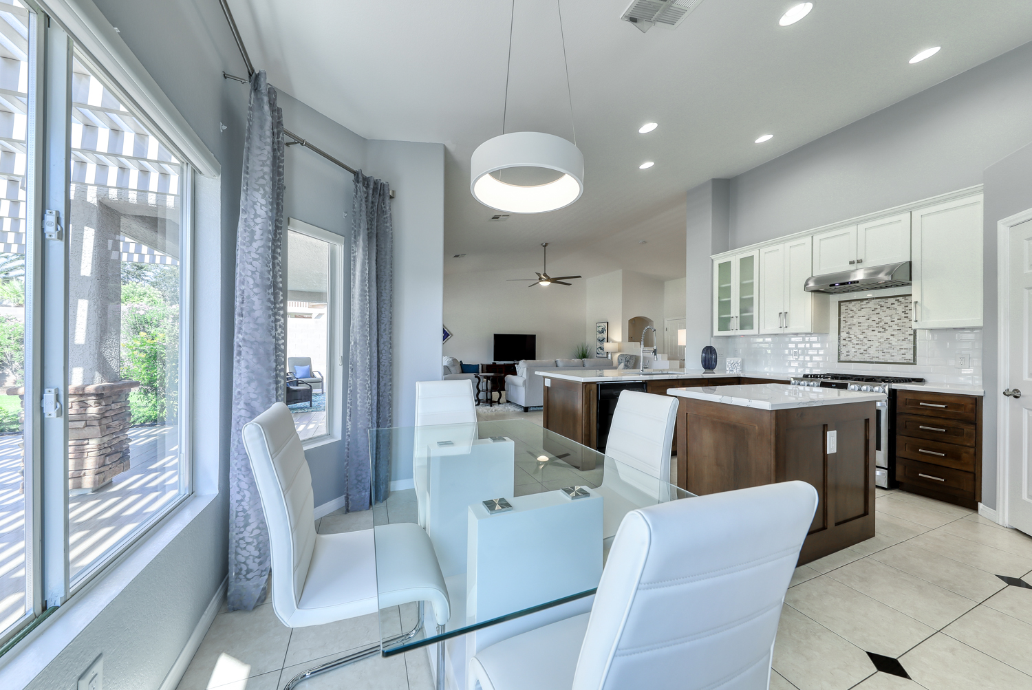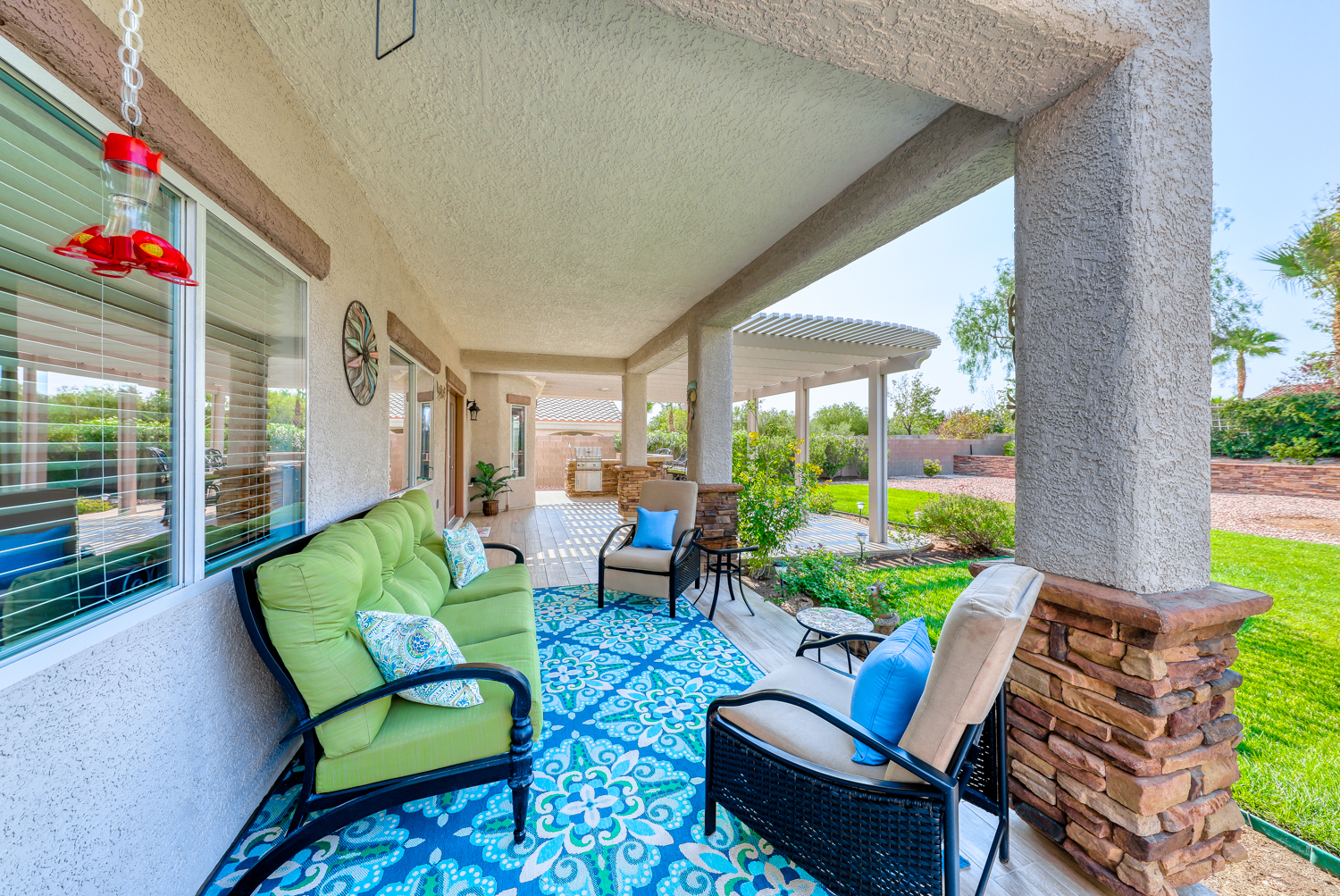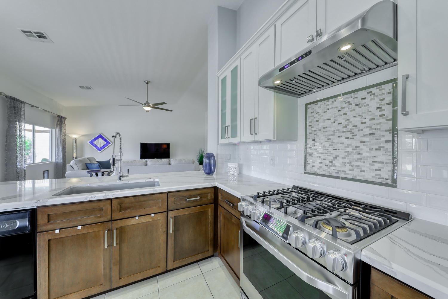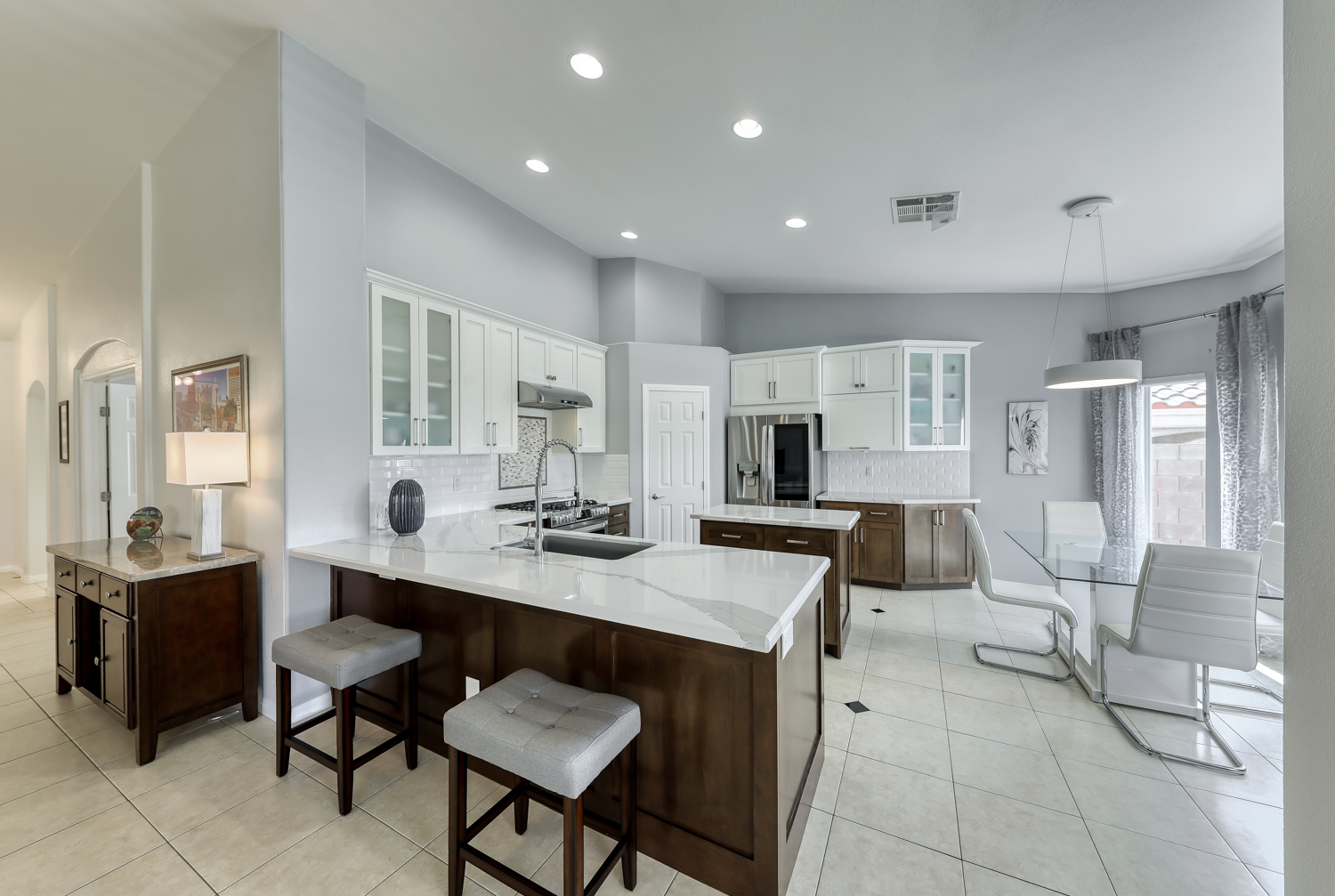 Gorgeous and unique renovated one story DR Horton home with 3 beds plus Den and 3 car garage. Classic diagonal style tile floors with stone accents. Open floor plan with Volume 10 ft ceilings , an amazing kitchen renovation with walnut custom cabinets white accents cabinets, Including soft-close drawers, LG Pro Bake Smart WiFi enabled True Convection slide-in range, including a custom hood. Gorgeous Brittanica Luxury Line quartz counter tops. Perfect size eating-in kitchen nook. Backyard is like having your own private garden with extended cover patio space and a custom built-in barbecue center including outside beverage refrigerator. Three nice-sized bedrooms including a master suite with bay window and en-suite bath with double sinks and separate tub and shower. Located within walking distance of the Anthem Hills Park and Anthem East Trail. It is also 3 blocks from Del E Webb Middle School. $484,900
