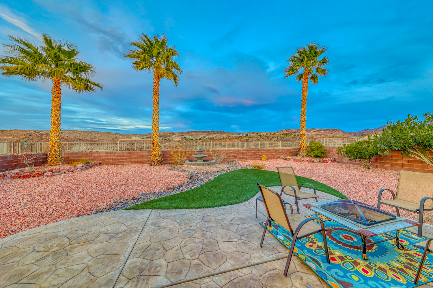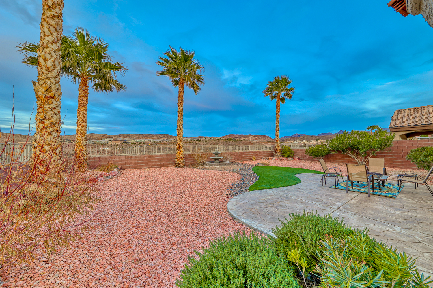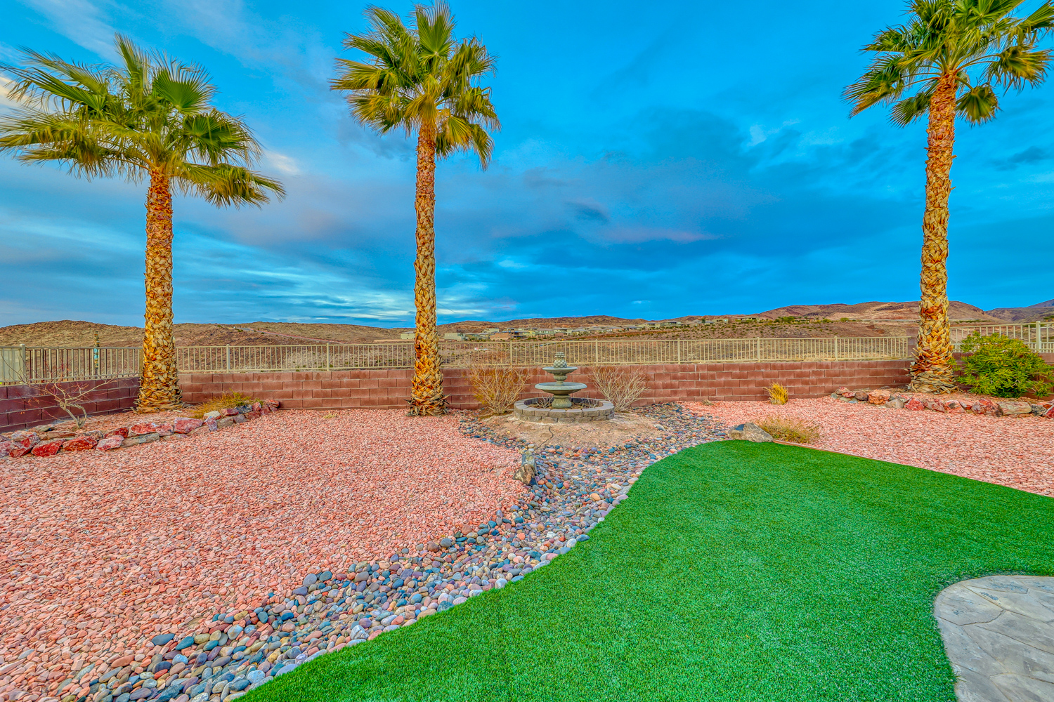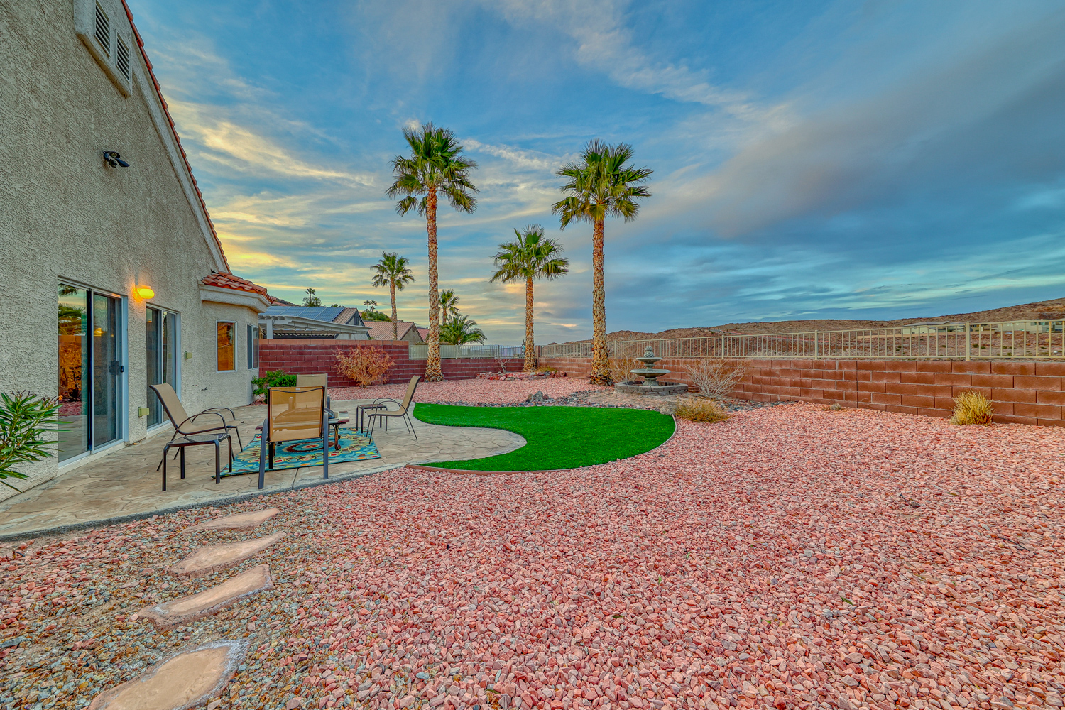 Desert style landscaping front & back, w/ easy-care artificial turf. Concrete patio area to enjoy the backyard & views of the city lights of downtown Las Vegas.