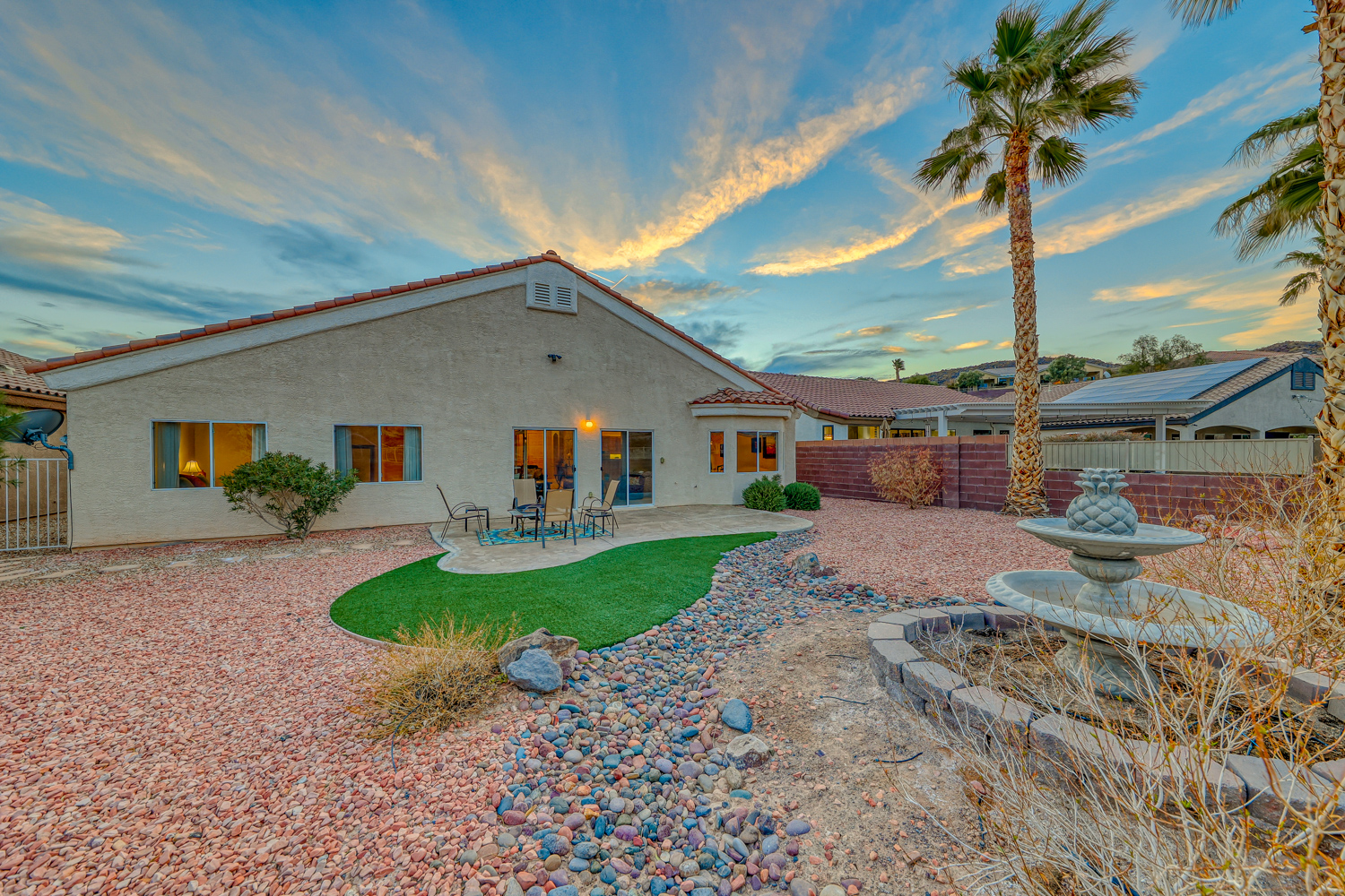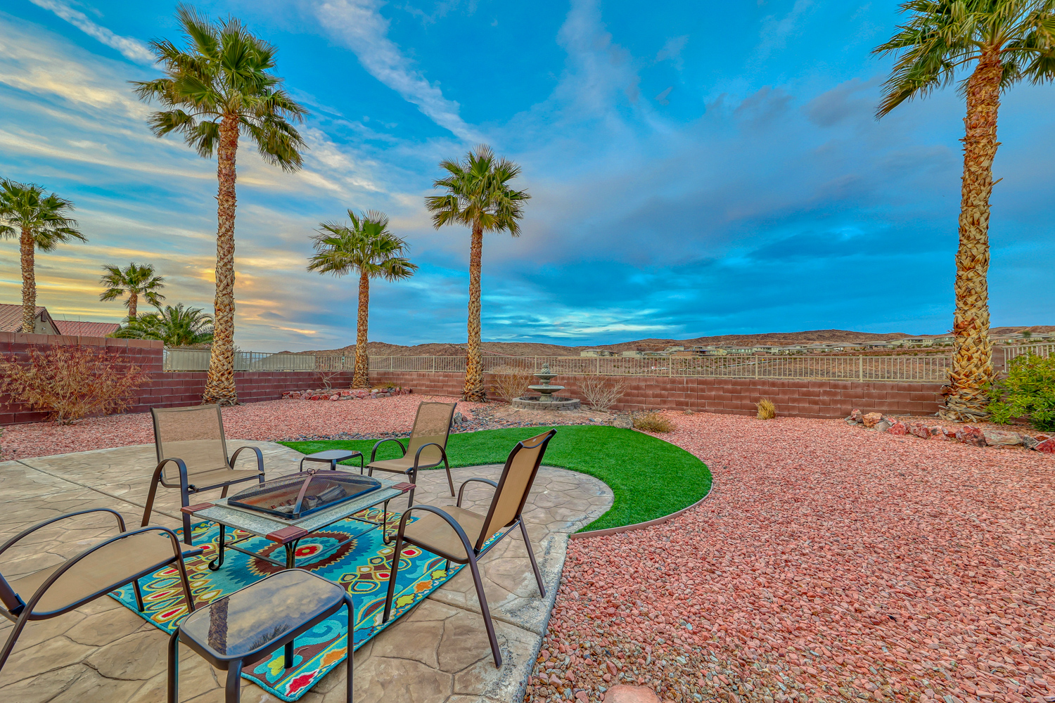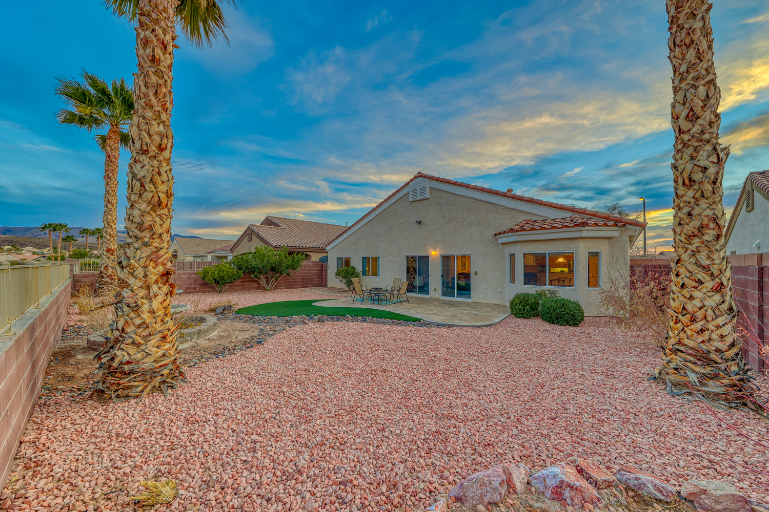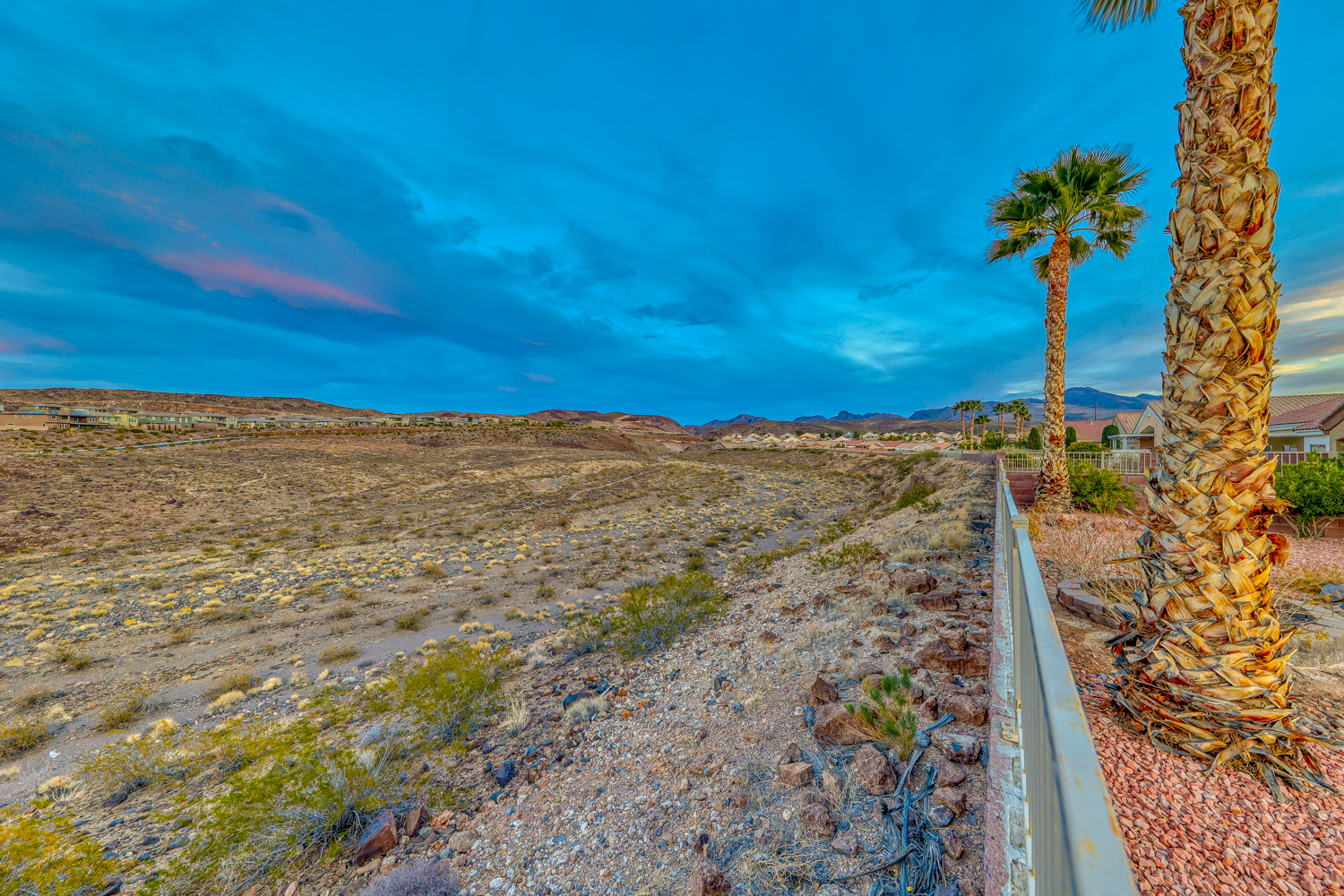 Desert style landscaping front & back, w/ easy-care artificial turf. Concrete patio area to enjoy the backyard & views of the city lights of downtown Las Vegas.
