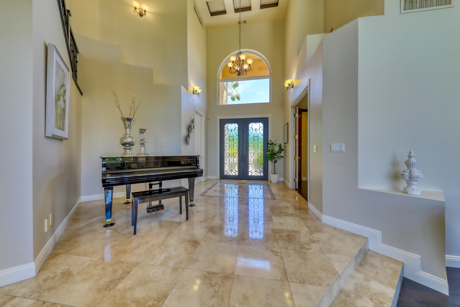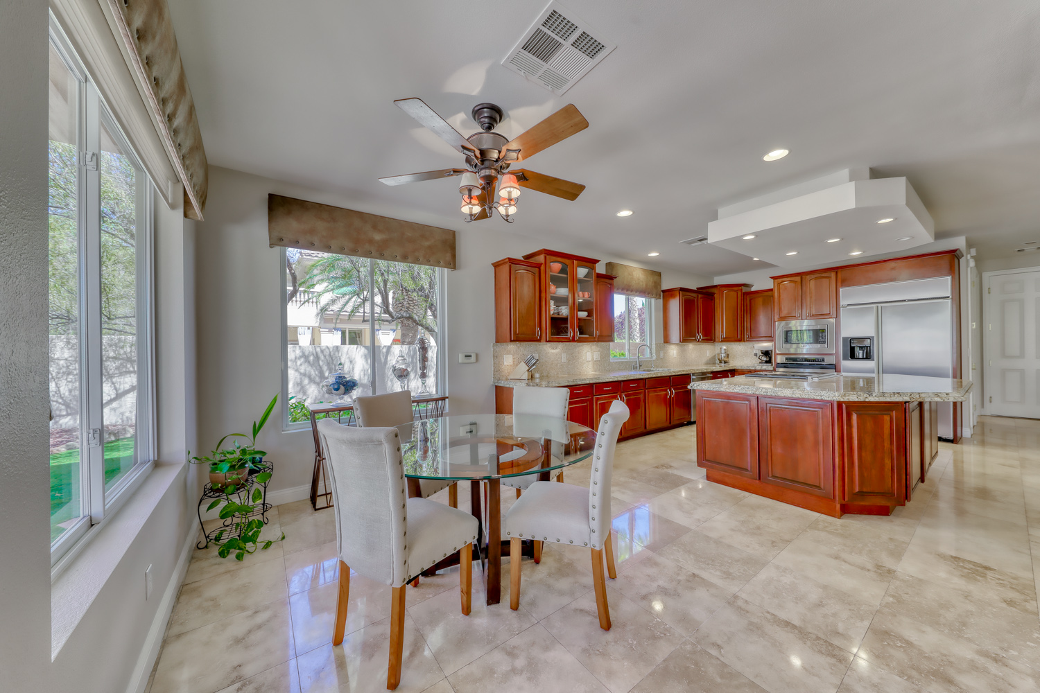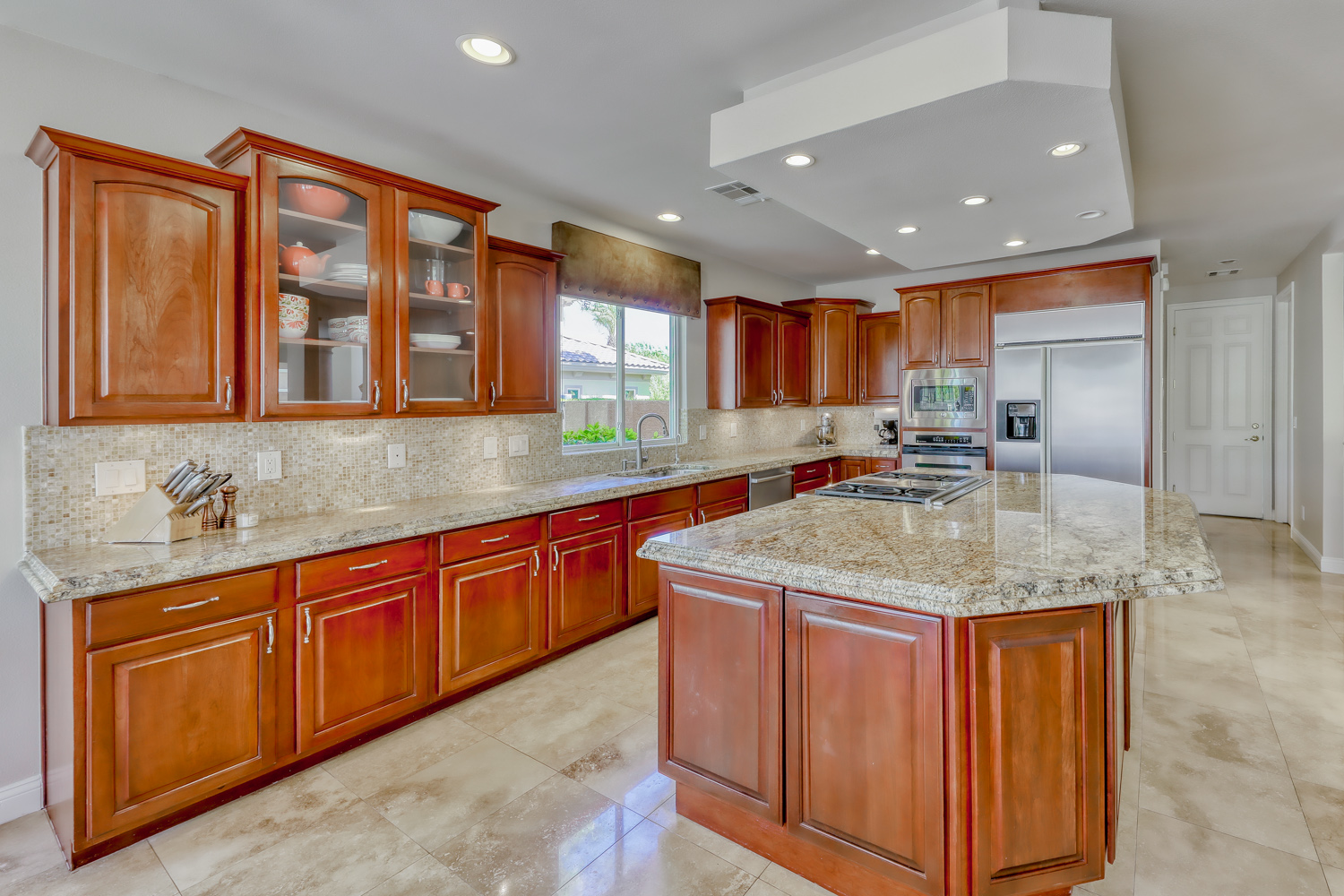 The Impressive Grand Entry with crème of marfil marble floors, coffered ceilings, and a wrought iron staircase all overlook the gorgeous step-down formal living room with an amazing stone floor-to-ceiling fireplace. Formal dining area has huge picture windows that overlook the tropical pool and shaded lounge area, with rock waterfall. Large gourmet kitchen features an enormous center island, custom granite counters and cherry wood cabinets with pullouts and a Sunny Kitchen nook.