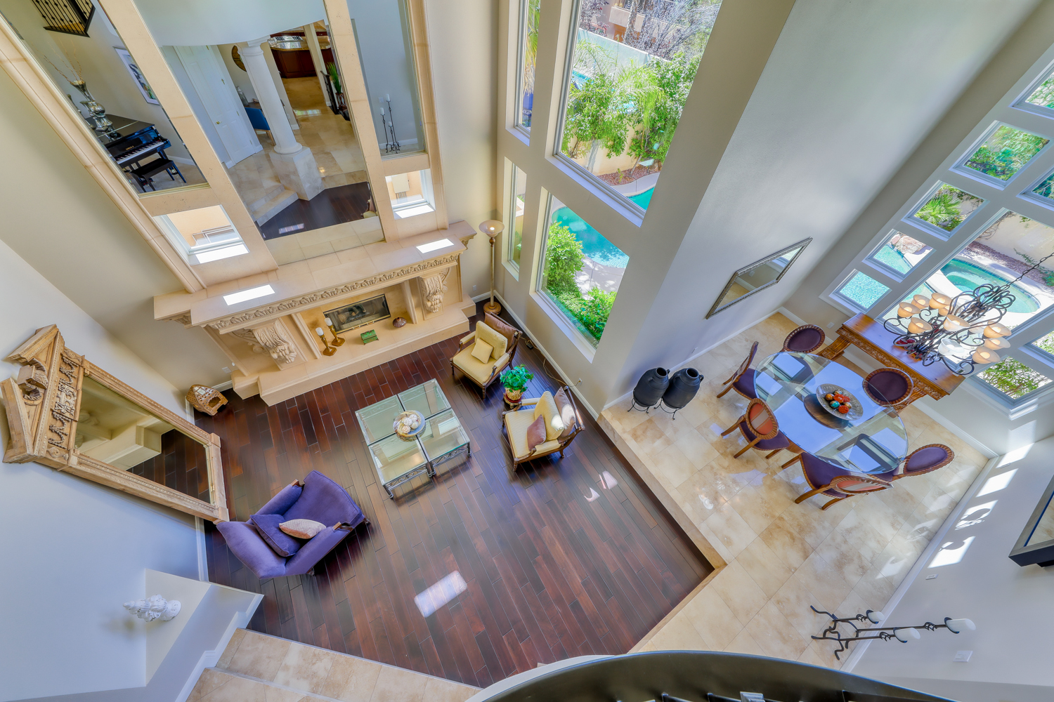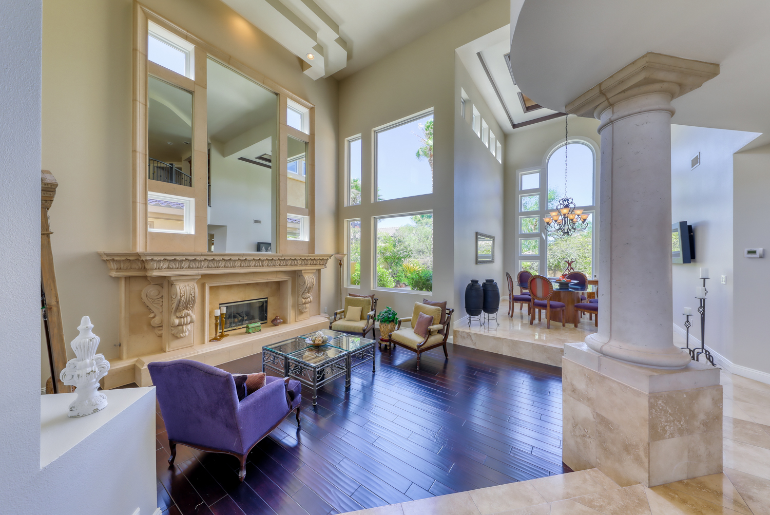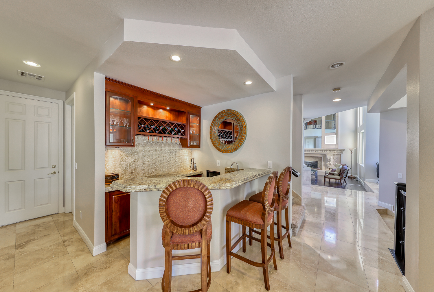 The Impressive Grand Entry with crème of marfil marble floors, coffered ceilings, and a wrought iron staircase all overlook the gorgeous step-down formal living room with an amazing stone floor-to-ceiling fireplace. Formal dining area has huge picture windows that overlook the tropical pool and shaded lounge area, with rock waterfall. Large gourmet kitchen features an enormous center island, custom granite counters and cherry wood cabinets with pullouts and a Sunny Kitchen nook.