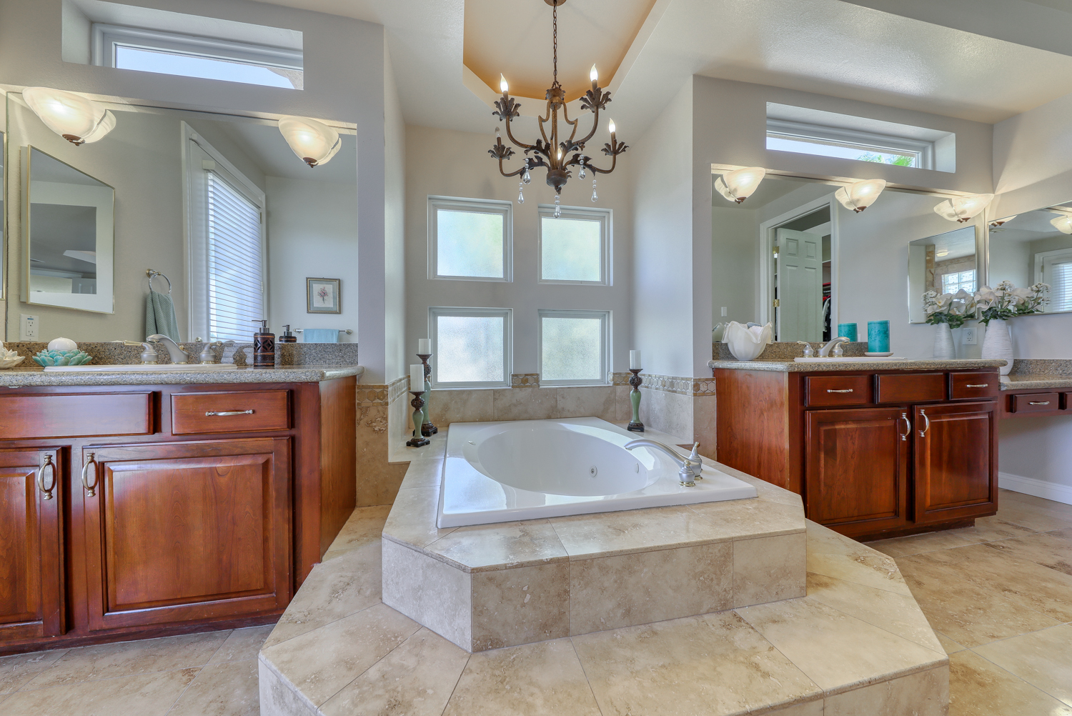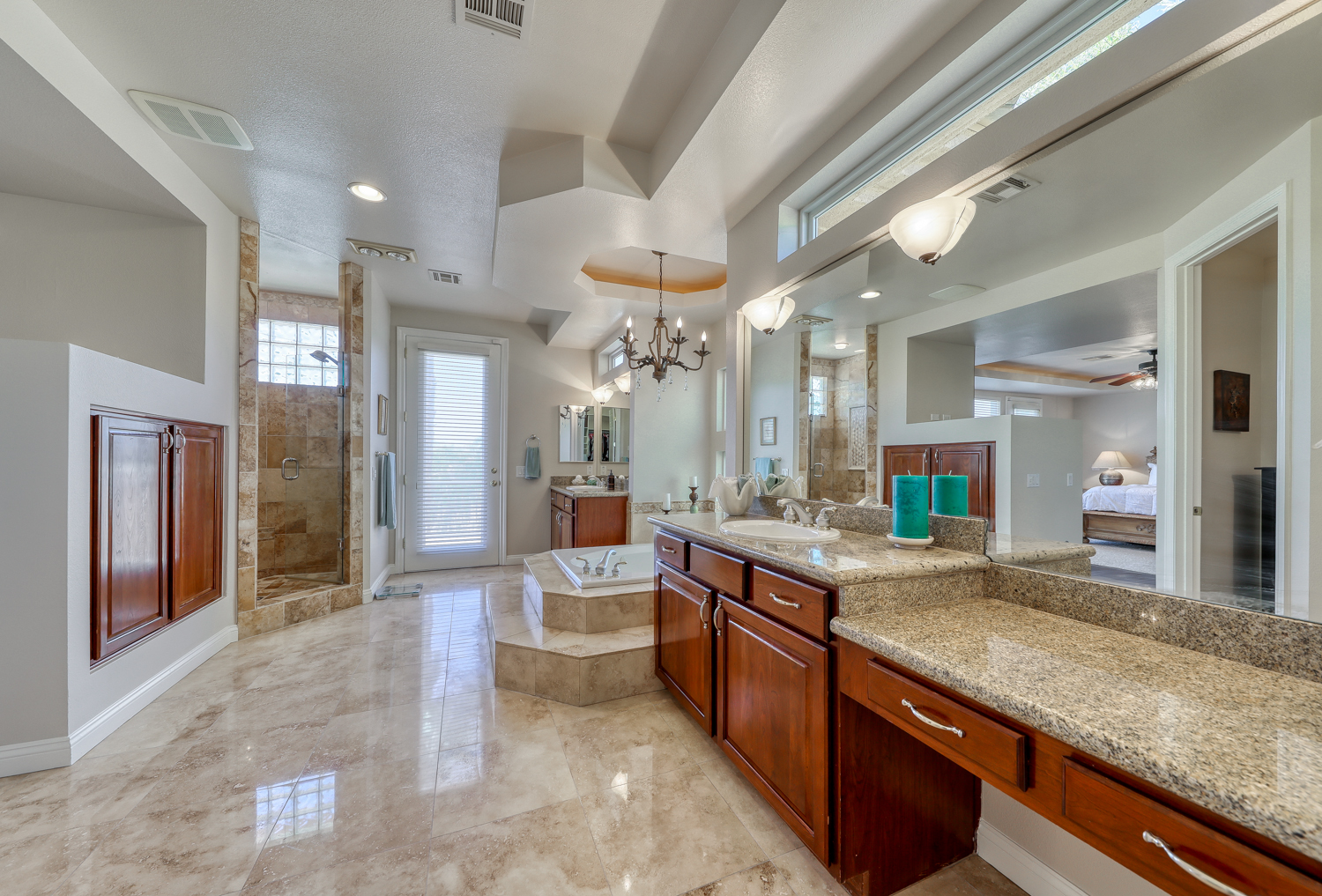 The upstairs features a split floor plan including a huge master suite with its own private balcony and double-sided fireplace that separates the master from the ensuite bath. Master bath is luxurious with custom granite and marble finishes. A large walk-in shower, master walk-in closet and a romantic jetted tub provides a great opportunity to relax and soak the day away.