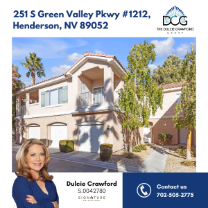 Listing Blogs Featured Photos (12) By Dulcie Crawford|2025-02-07T10:07:02-08:00February 7th, 2025| Share This Story, Choose Your Platform! FacebookXRedditLinkedInWhatsAppTumblrPinterestVkEmail Dulcie Crawford NV Lic #S.0042780 Signature Real Estate Group Buyers: 702.505.2775 Sellers: 702.505.2775 Office: 702.568.2530 Get Directions to My Office: 2200 Paseo Verde Pkwy Suite 300A, Henderson, NV 89052 FREE Real Estate Market Report Get in Touch