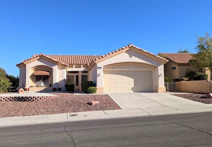 Located in the HIGHLY desirable Sun City Summerlin 55+ Community. Very sought-after open floor-plan w/ brightly lit living room, dining area and connected breakfast bar kitchen. Lots of neutral tile floors through property and custom-built storage space. Kitchen features Whitewash Oak cabinets with white appliances and gas range stove. Dining area has bay windows.
