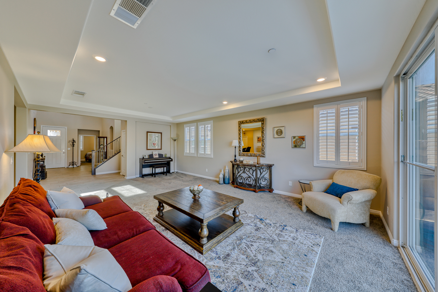 Located in The Estates Gated community of Inspirada. The oversized brick-paver driveway and a 3-car garage lead you into this like-new home including 5 beds, loft, and 4.5 bathrooms. This KB Home’s Original Owners includes many upgrades including added Energy efficiency, custom stair rails and Maple Aristokraft Cabinets throughout & contemporary wood plank-style tile flooring. Located on large almost a quarter acre lot that backs to the community walking paths and affords gorgeous Mountain Views and privacy. The home has a main floor guest suite, separate formal dining and living area that lead you out to the gorgeous backyard deck and pool/spa area. Plantation shutters in the lower floor with coffered ceilings in the living room. The kitchen boasts Granite counters, custom 42’ Maple cabinets, plus a massive island to entertain into your family room. There is a large walk-in pantry, built in Beverage refrigerator and Whirlpool Pro- Smart Stainless Steel Appliances. Lots of gourmet cooking space to enjoy daily meals with your family. Upstairs is a spacious bonus entertainment loft, huge guest bedrooms, and a primary suite with a sitting area and convenient Walk in Closet that adjoins with the upstairs laundry room. The primary bathroom includes luxurious en-suite soaking tub, European height double vanities, and spacious walk-in shower and closet. The backyard is Huge with a combination of grass play yard, contemporary pool with a raised spa and wet deck. The 22 Thousand gallon Pool features Lap Lane and upgraded multi-colored LED lights that can be controlled remotely. Enjoy the professionally landscaped yard with breathtaking view of the Black Mountain range.