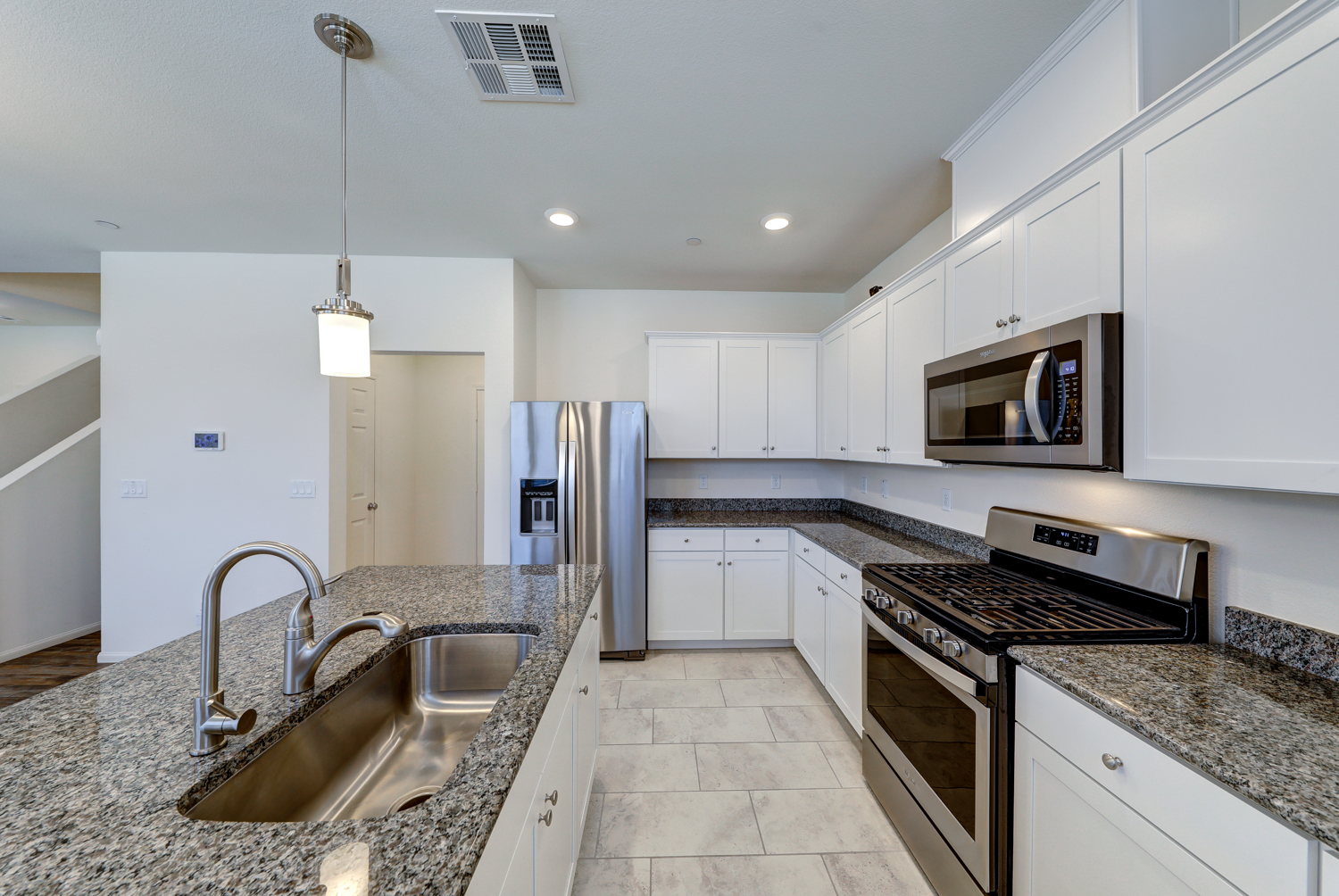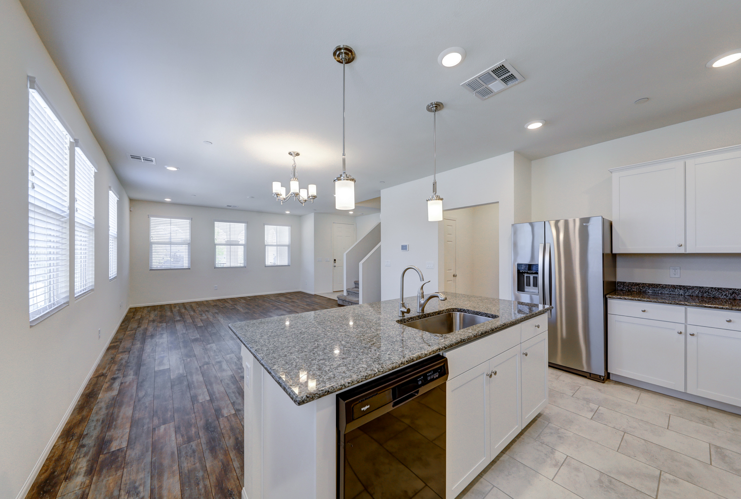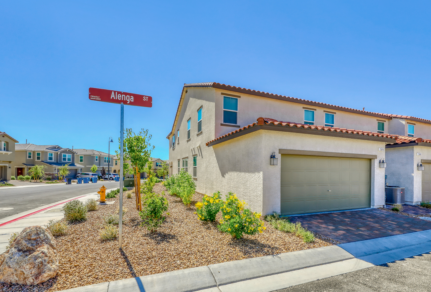 Sophisticated & Like New KB Townhome with 4 bedrooms and 2 car garage located in Inspirada master plan community. Over 1800 sqft of spacious living space, with designer ceramic wood plank style tile floors, trendy grey and white concept kitchen with modern white flat panel cabinets, Grey Granite counter tops showcase under mount basin stainless steel sink, pull out faucet, and stainless steel range and microwave. Large master suite, roomy enough for a sitting area and en suite bath with gorgeous white subway style overlay. Solid surface quartz style counter tops and upgraded luxury shower and tile surrounds. Secondary bedrooms are open and share a guest bathroom with extended vanity and linen closet. Convenient garage location off kitchen features a tankless water heater. Truly a home and community you will forever enjoy.
