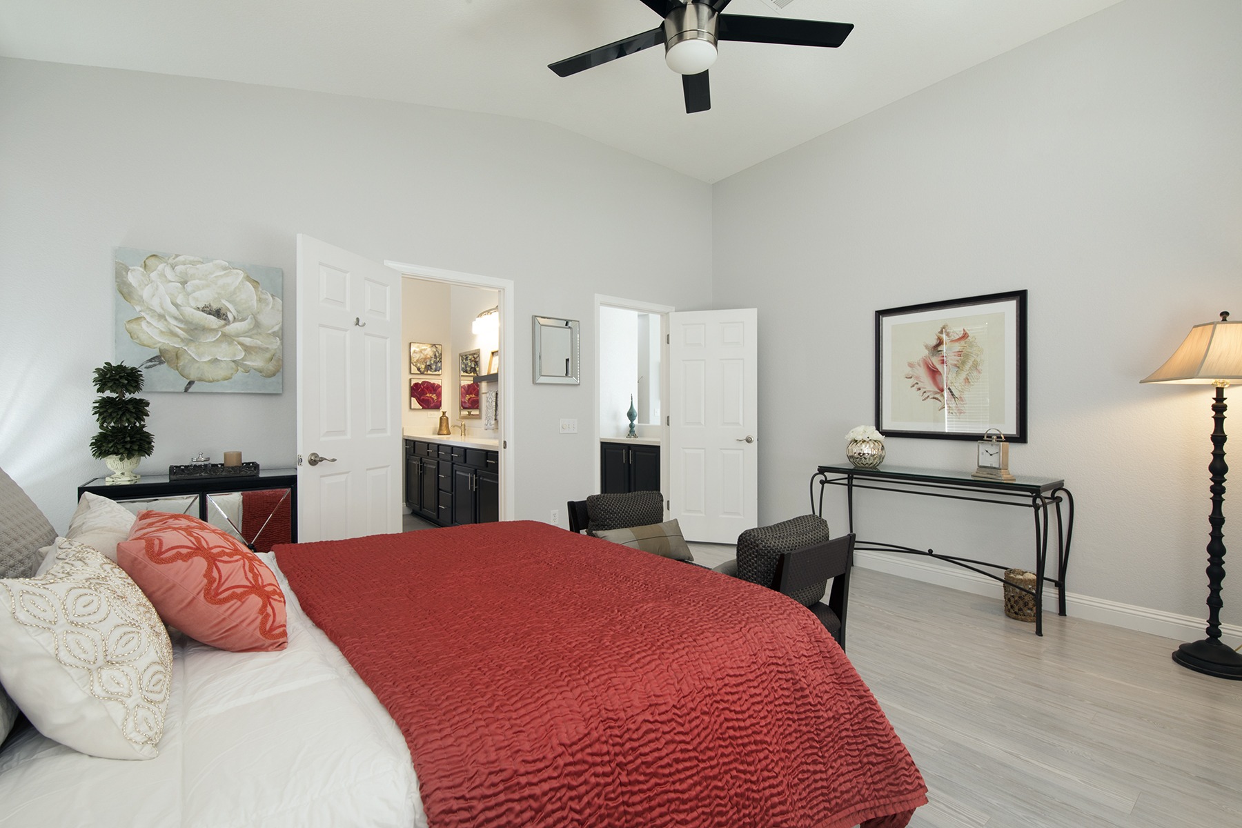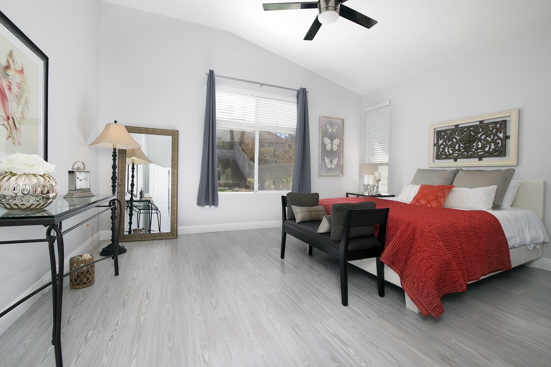 Vaulted ceilings with new ceiling fans, light fixtures, and newer interior and exterior paint. New hardware throughout. Pergo MAX Premier laminate wood style flooring throughout and Daltile glazed porcelain tile in the bathrooms and 5” baseboards. Great room with fireplace and media niche. Almost new water softener, water heater and garage door. The fridge, washer and dryer are also included. Spacious master bedroom with walk in closet and renovated ensuite master bath with white quartz counters, and double sinks.