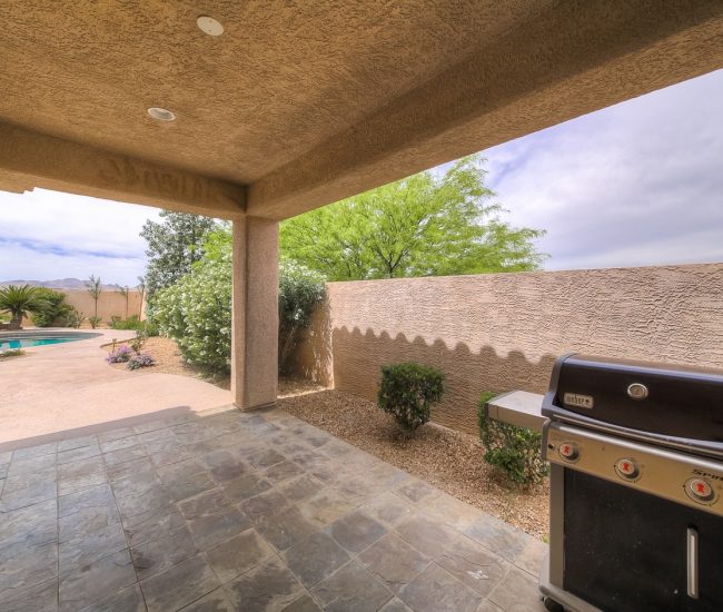Slate tile covered patio and lush landscaping in backyard. Stunning desert oasis Pebble Tech pool/ spa with waterfall and in ground cleaning system. Oversized lot w/ elevated view deck and fire pit. Brand new water softener & water purifier system both included.