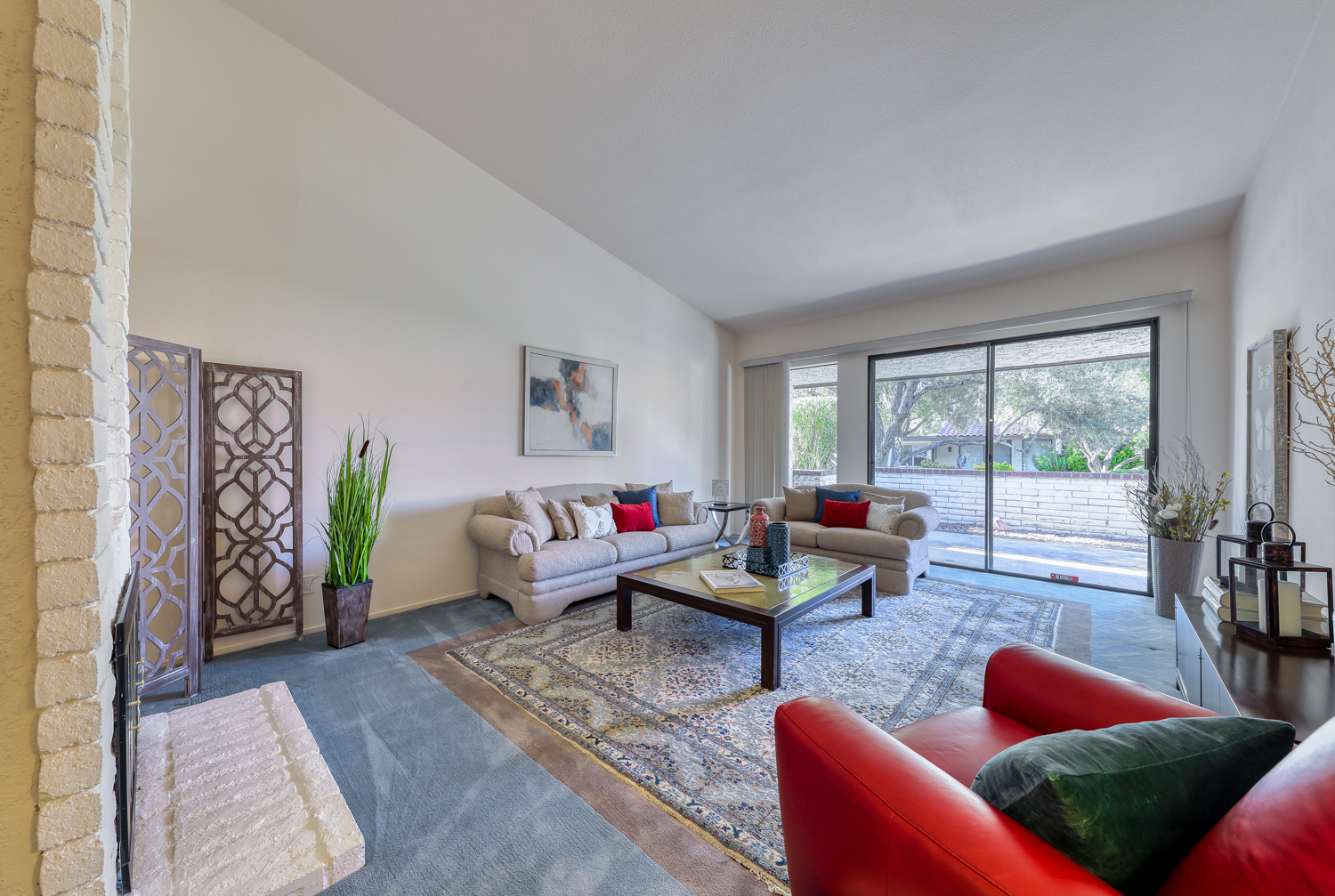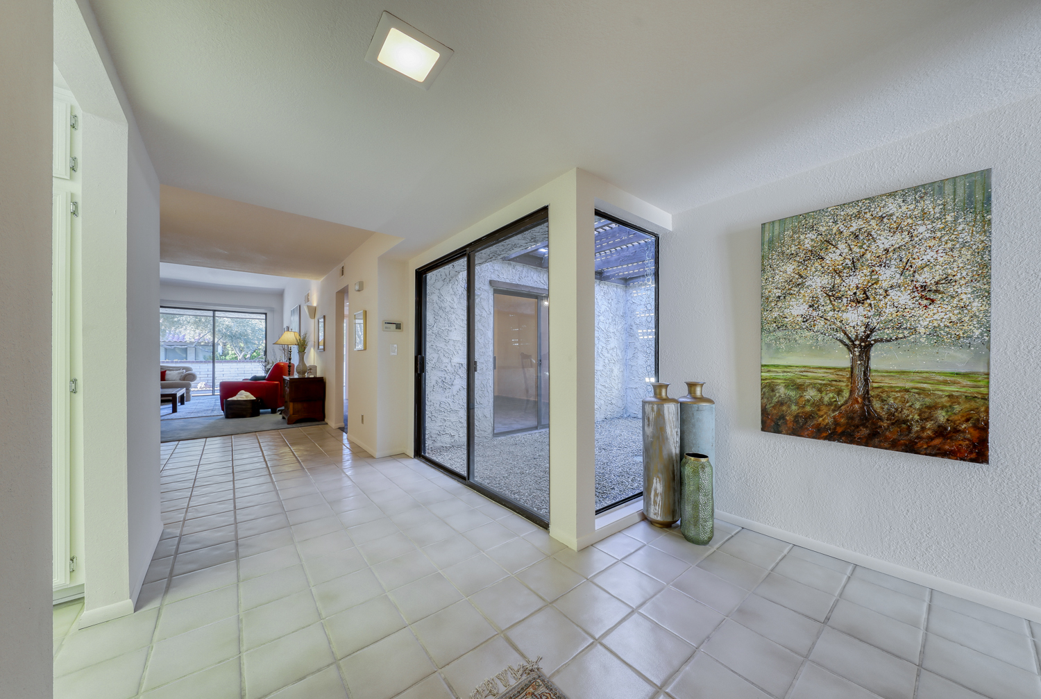 This Classic Mission-style Townhome with two bedrooms, two bathrooms and den, features its own private, gated courtyard entry and 5 sets of sliding glass doors to allow inside/outside living. Enjoy the park-like green belt common area from the large back patio, accessible from the Living Room and 2nd Bedroom Suite.