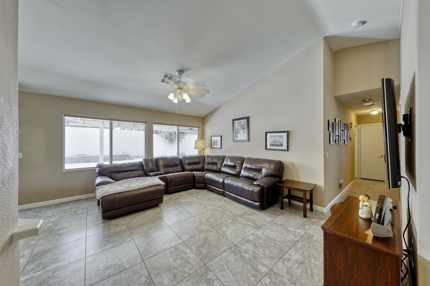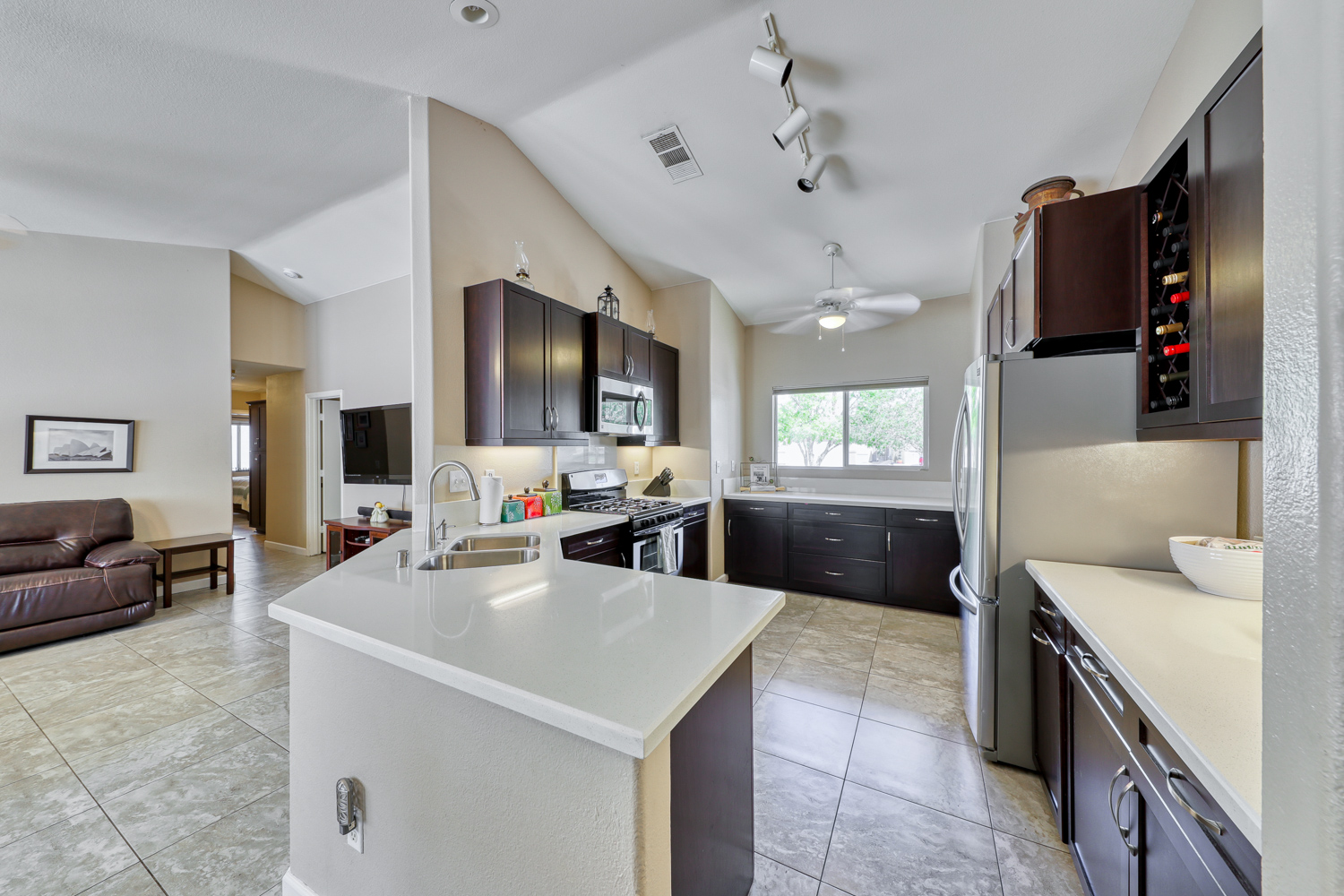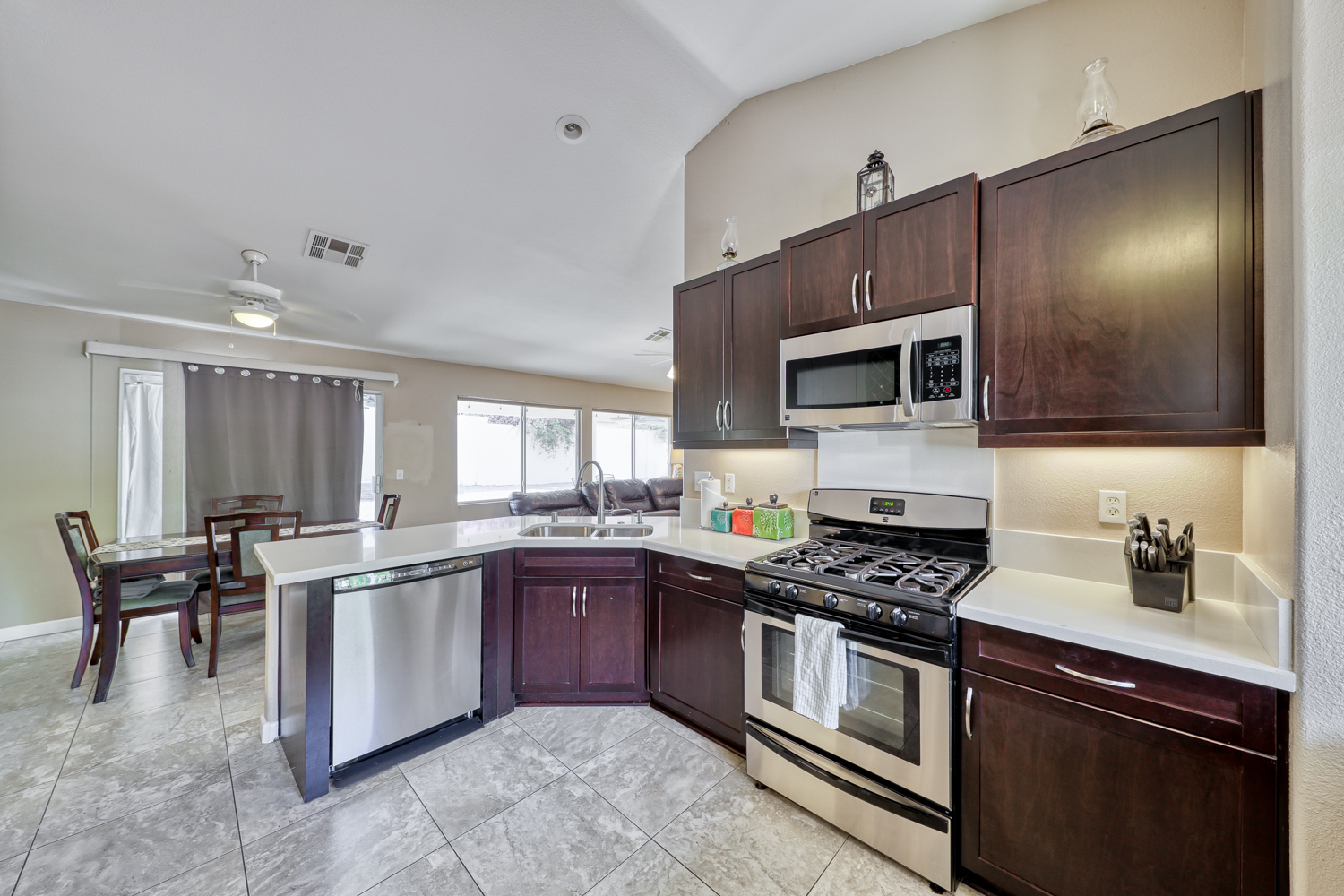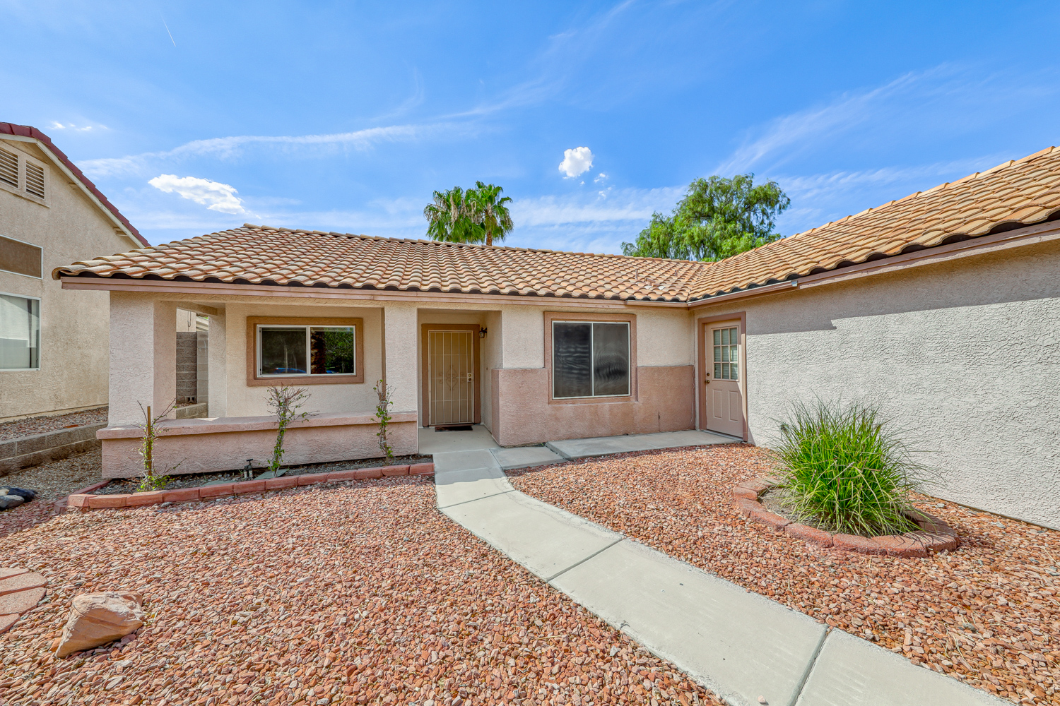Single story 3-bedroom, 2 bath, 2-car garage home in Green Valley, Henderson area. Newly renovated with porcelain tile floors throughout the home. Covered front porch provides shade to relax outside. Vaulted ceilings in family room w/ open concept great room to kitchen’s sit down breakfast bar. Reconfigured kitchen layout w/ extra deep storage & large new windows in kitchen nook. Includes Stainless Steel Kenmore appliances & 5-burner cooktop slide in gas range. White speckled quartz countertop throughout kitchen & bathrooms and all new dark chestnut contemporary cabinets w/ pull outs & soft closed drawers. Main bedroom includes 2 walk-in closets, double sinks w/ shower & tub combo. Backyard is easy maintenance desert landscaping w/ brand new stucco walls. Includes a full length covered patio. Home is centrally located to schools, parks, restaurants, and shopping areas. $369,900