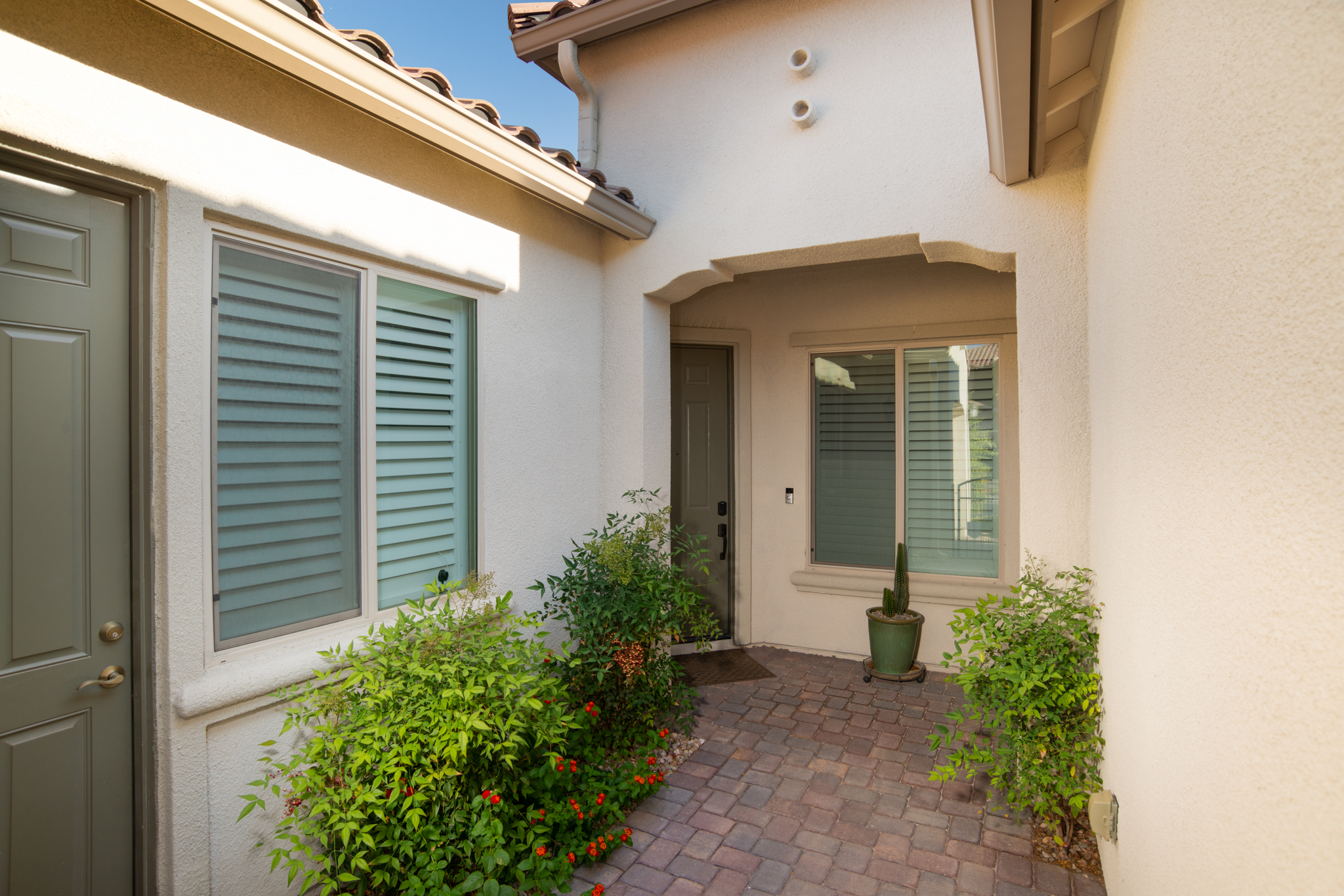 Stunning one-story home in The Cove at Southern Highlands. Features a hard to find private Entry Guest Quarters Suite. Located on a Corner lot with 3 beds, 3.5 baths, 1 den, and 3-car garage. Be welcomed by a front entry courtyard and bright entry foyer. Large great room perfect for entertaining & includes contemporary stone surround fireplace. Multi-sliding Skyline glass panel doors in the great room that opens out to the covered patio & professional Desert landscaped backyard. Surround Sound Speaker system w/ receiver, gorgeous shutters, Smart Surveillance Alarm, and Designer Wood Plank Tile floors throughout the home and carpet in bed rooms. Luxurious kitchen with oversized custom pantry. Kitchen Aid stainless steel appliances including Convection ovens and Under-mount sink. Custom white cabinet upgrades and Granite slab countertops all around kitchen & island. Primary suit includes walk-in tile surround modern shower w/ bench seating and double sink vanity. Large Pool sized backyard has covered patio and offers nice privacy and shade. Used as a secondary home and in like new condition.