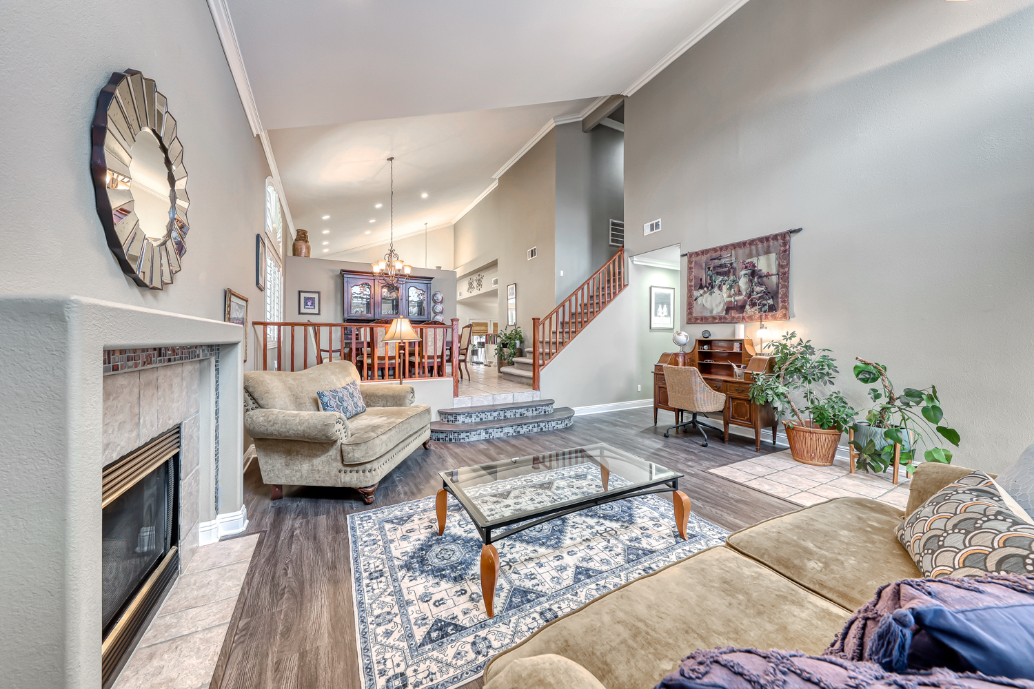 The step-down family room leads to a private bedroom, 3/4 bath, & large laundry room with sink & backyard access. The spacious primary suite has a sitting area, private balcony, XL walk-in closet, 2-sided fireplace, & an ensuite bath with separate shower and soaking tub.