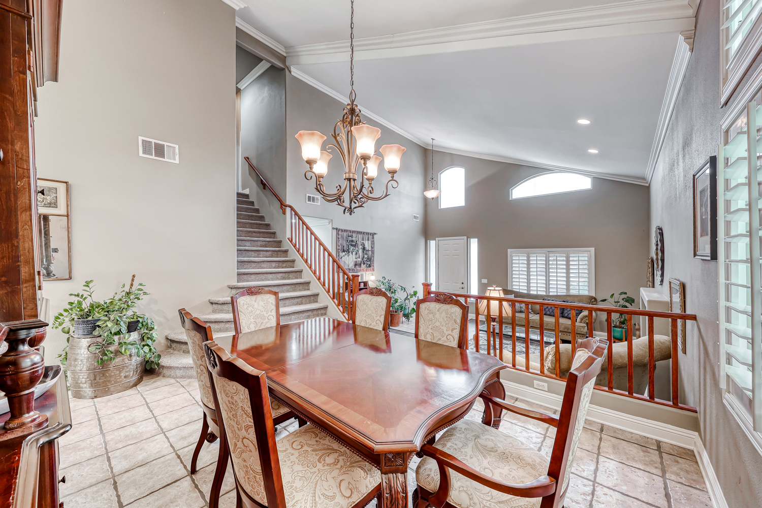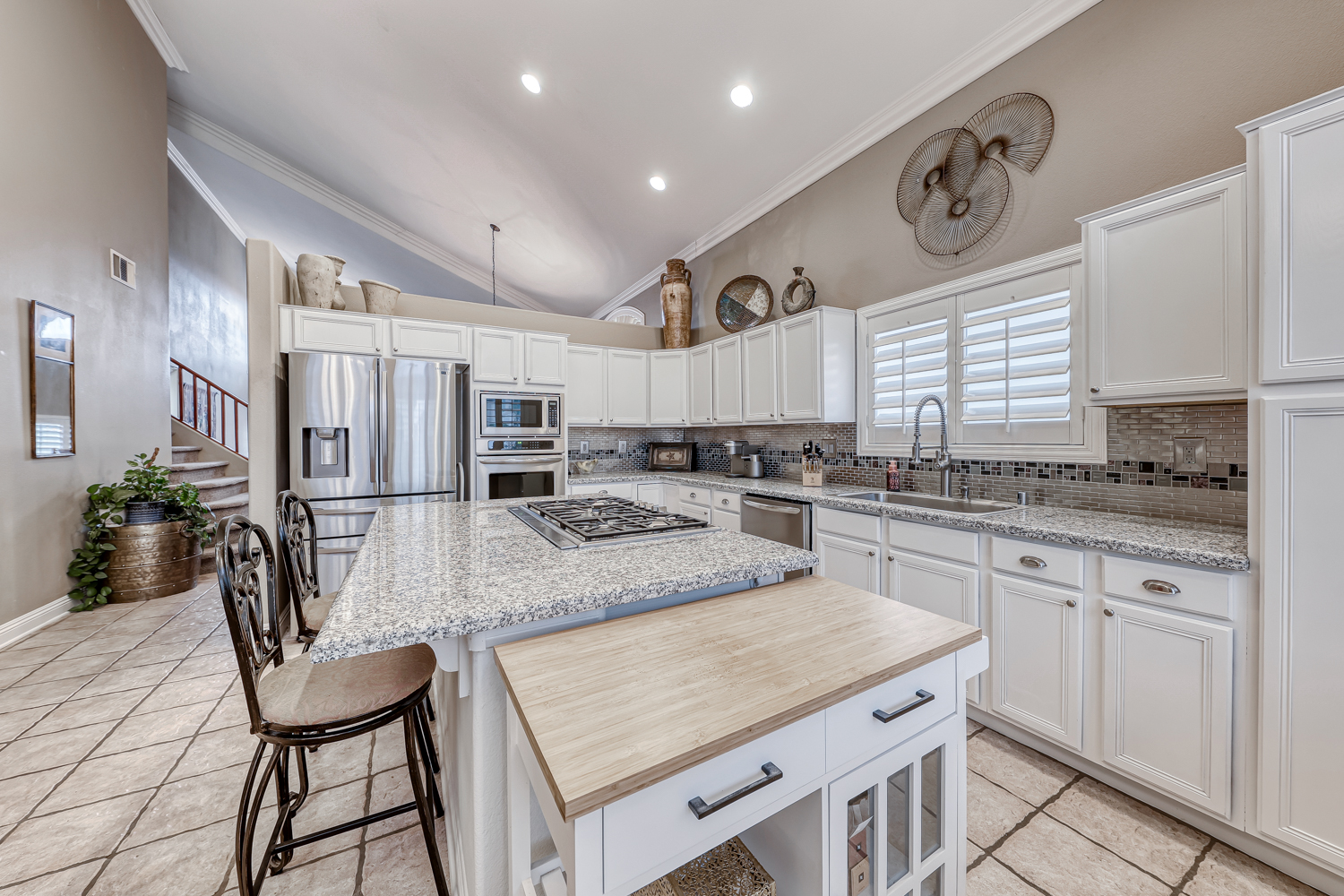 The formal living & dining areas feature vaulted ceilings, while the gourmet island kitchen has granite counters, stainless steel appliances, & a 6-burner built-in cooktop. The kitchen has reconditioned white cabinets & a large sit-down nook overlooking the tropical backyard.