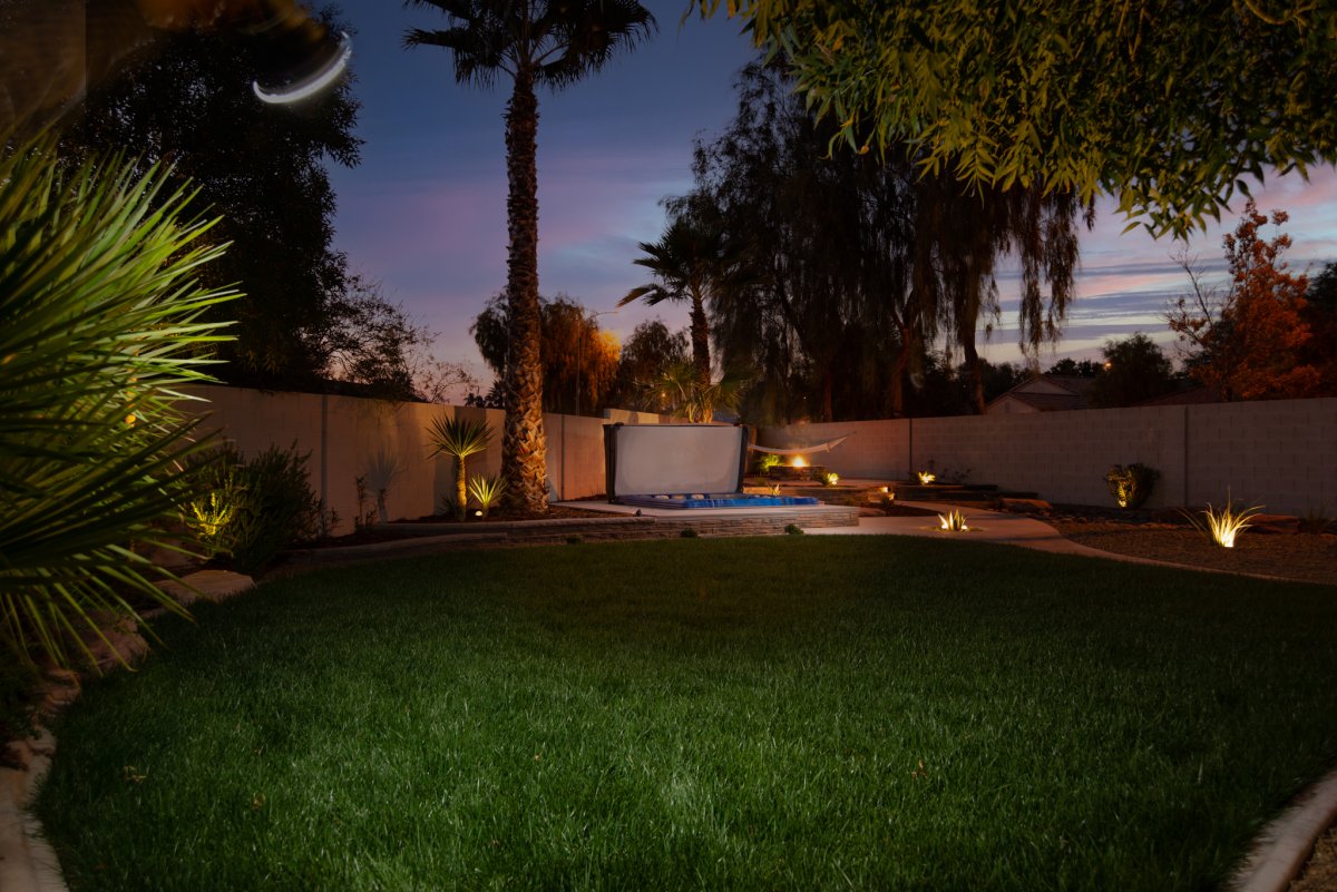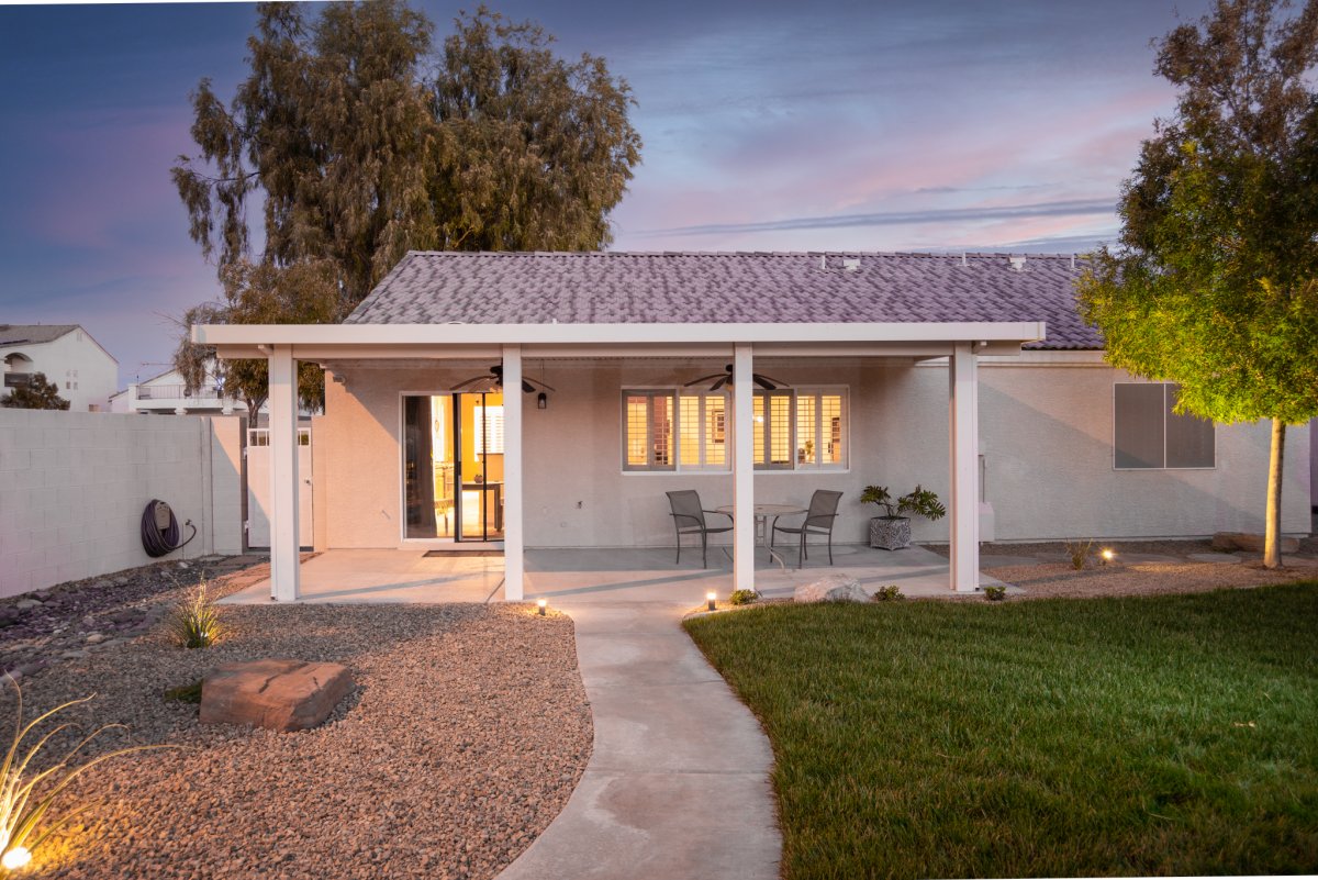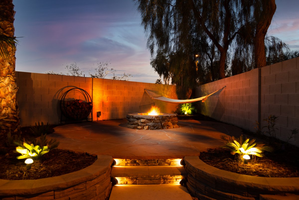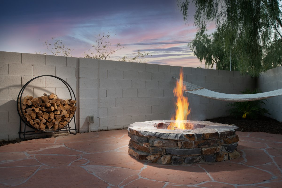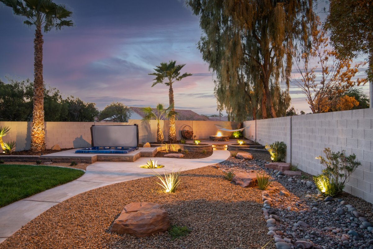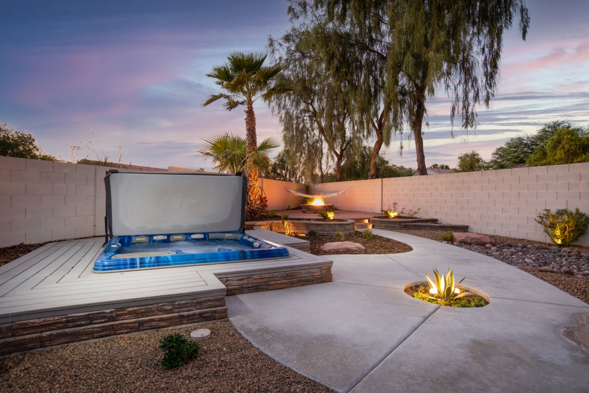 Backyard is garden paradise featuring a covered patio, separate storage shed w/ electrical hook ups, and a step up fire pit lounge complete with Hammock and flagstones accents. The gorgeous Pro landscaping includes grassy area, and desert landscaping to give it the feel of your own private park, but still is low maintenance, Piped in sounds with the rock speakers & enjoy the cool desert nights in the Semi Sunk Hot Tub.