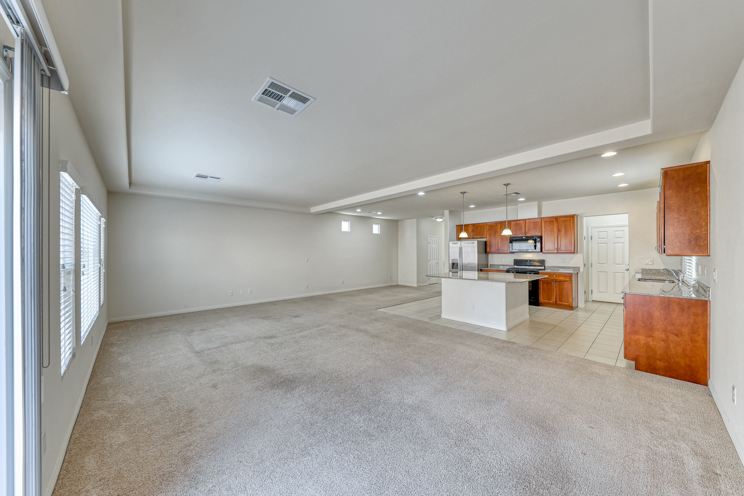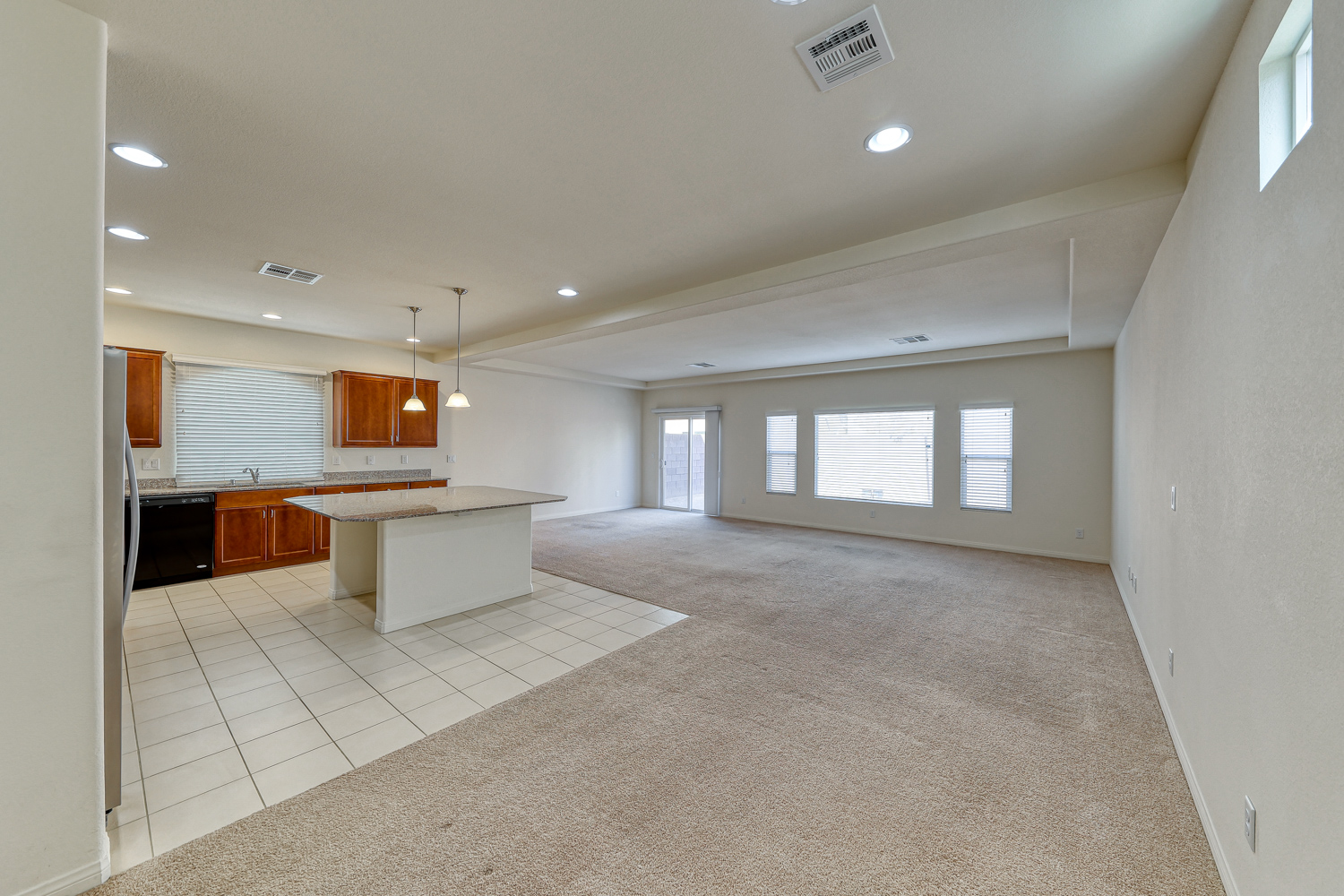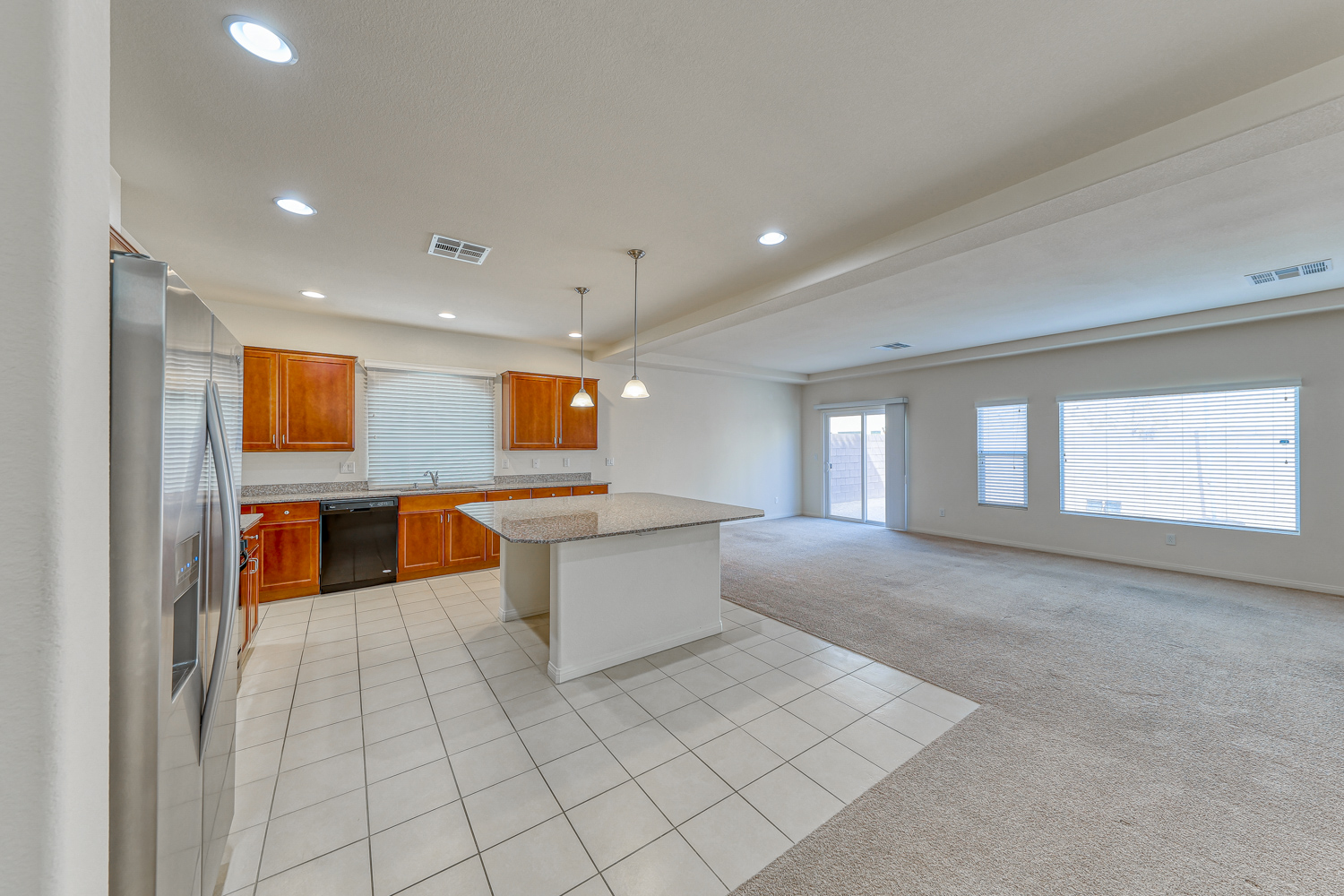 Large family room is also open to the kitchen for perfect family entertainment. Large sliding glass doors lead to a spacious backyard.