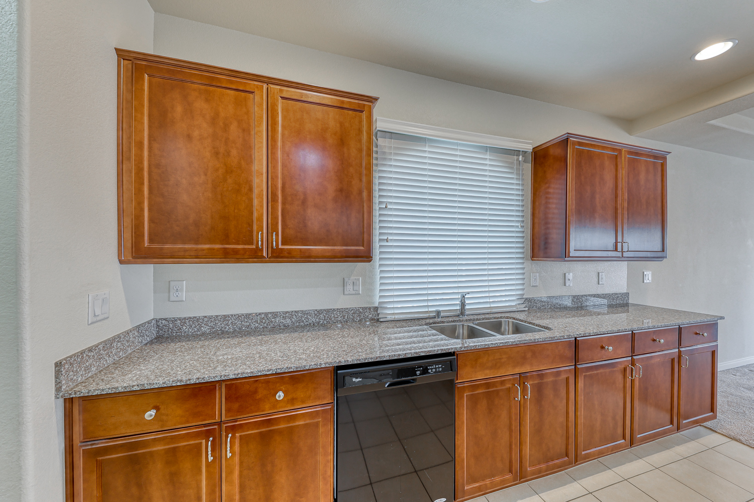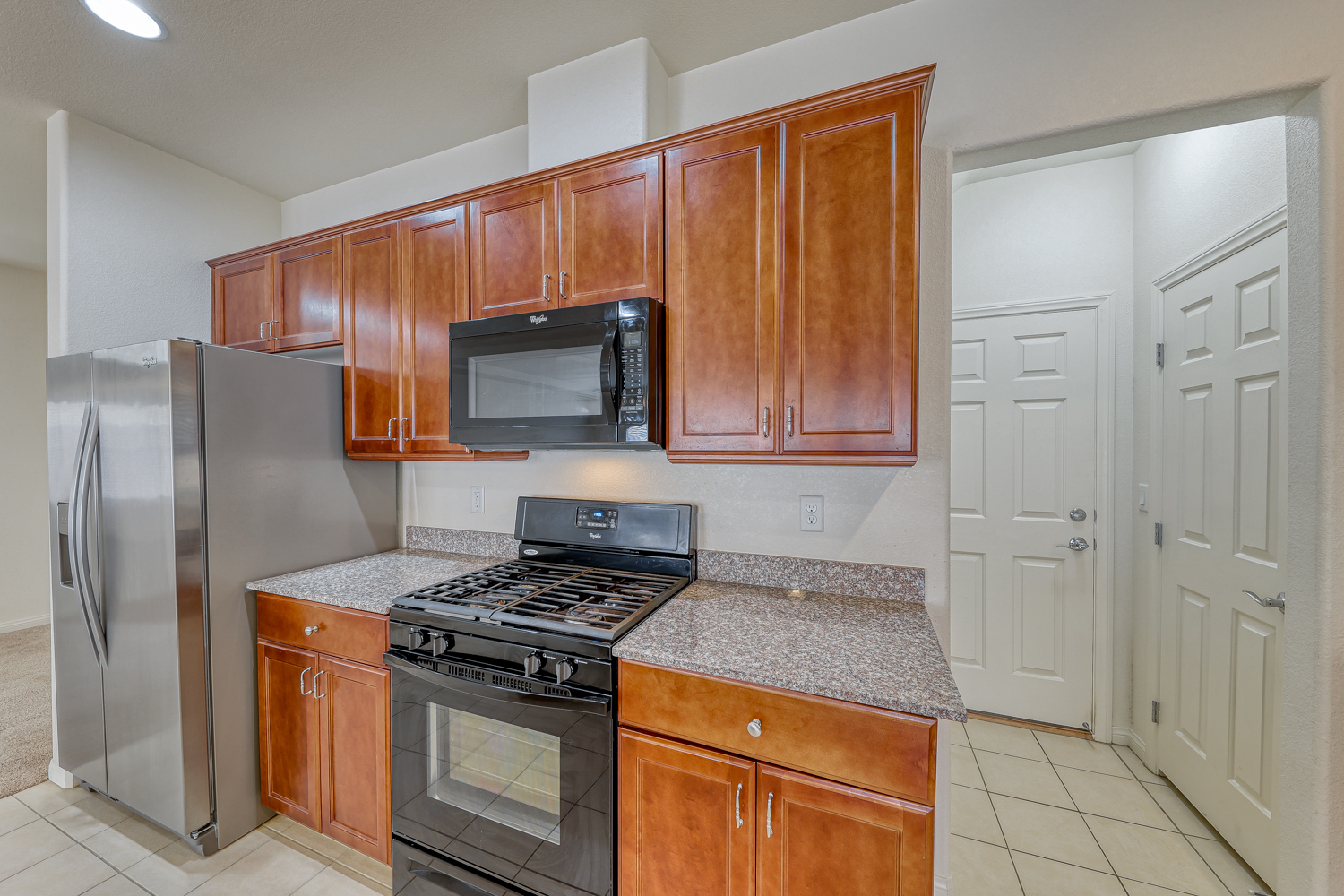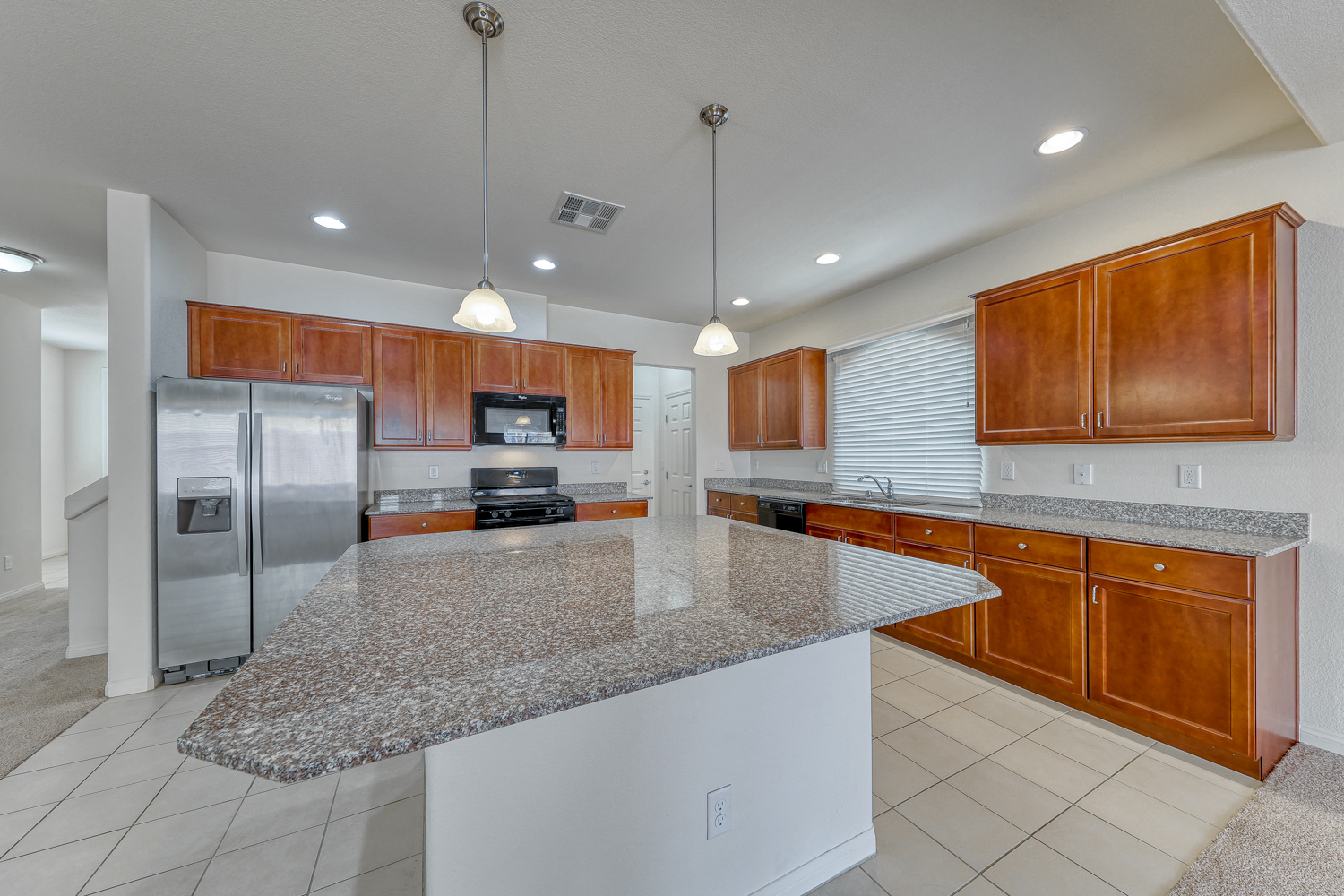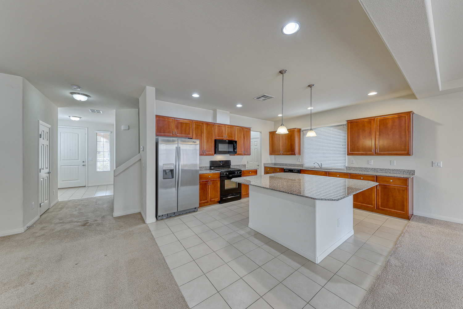 Vaulted ceiling entryway welcomes you to the formal dining area and open kitchen concept. Family style layout has a large sit-down island with granite and features beautiful cherry wood style cabinets. Upgraded Whirlpool appliance package features a gas cooktop range, microwave and dishwasher.