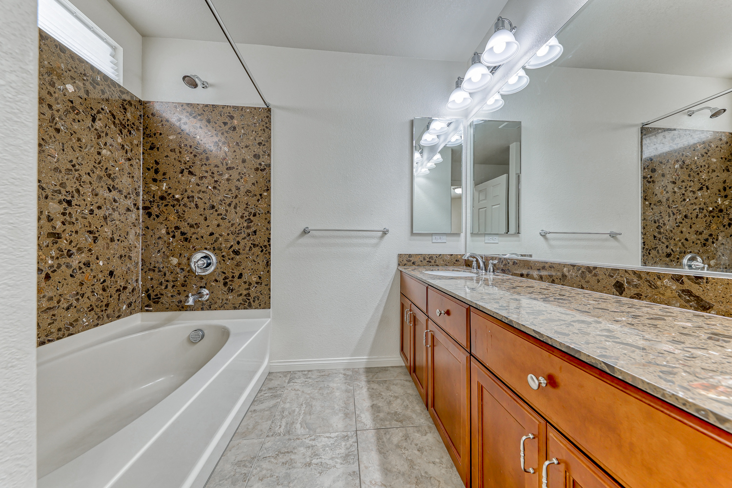 Private large primary suite features its own ensuite bathroom with walk-in shower and garden tub, double sinks and upgraded galactic brown cultured marble countertops.