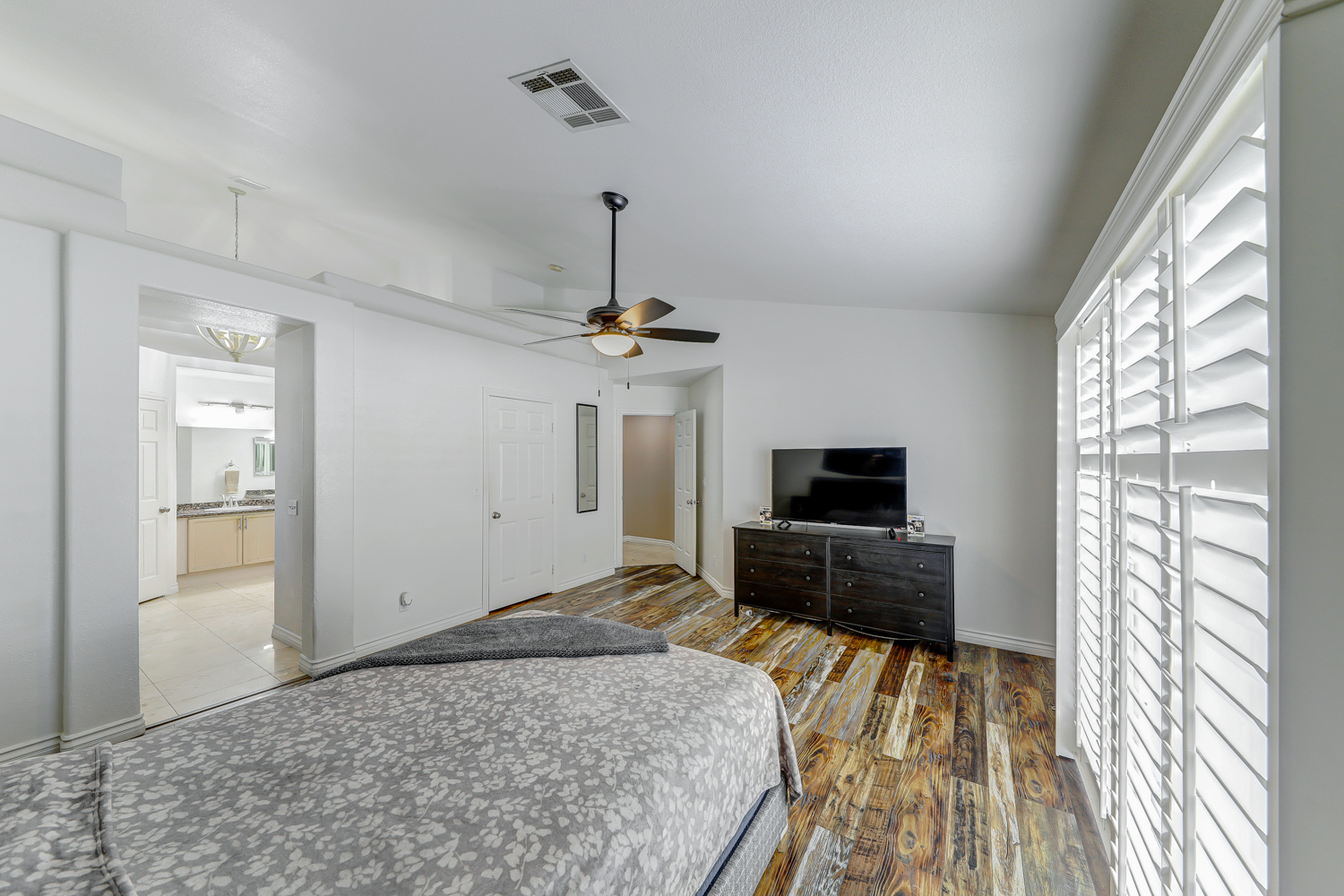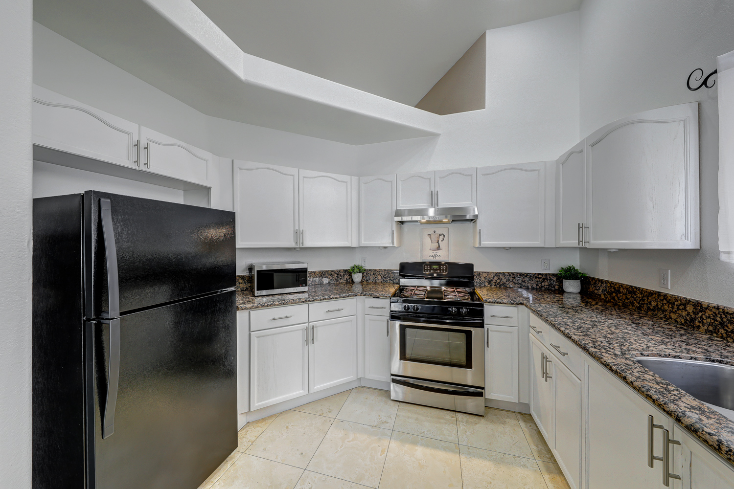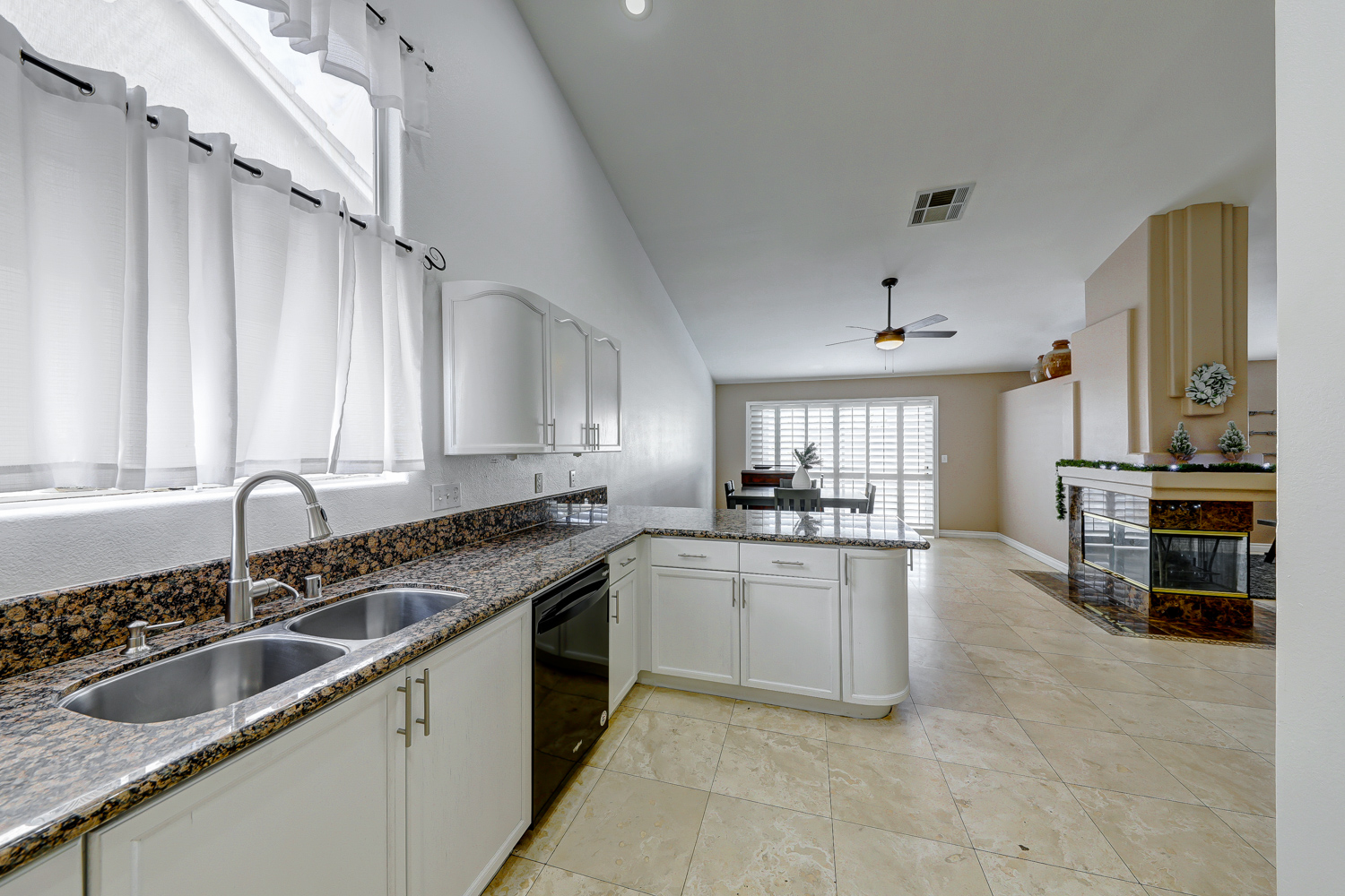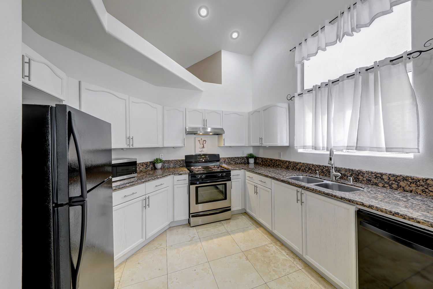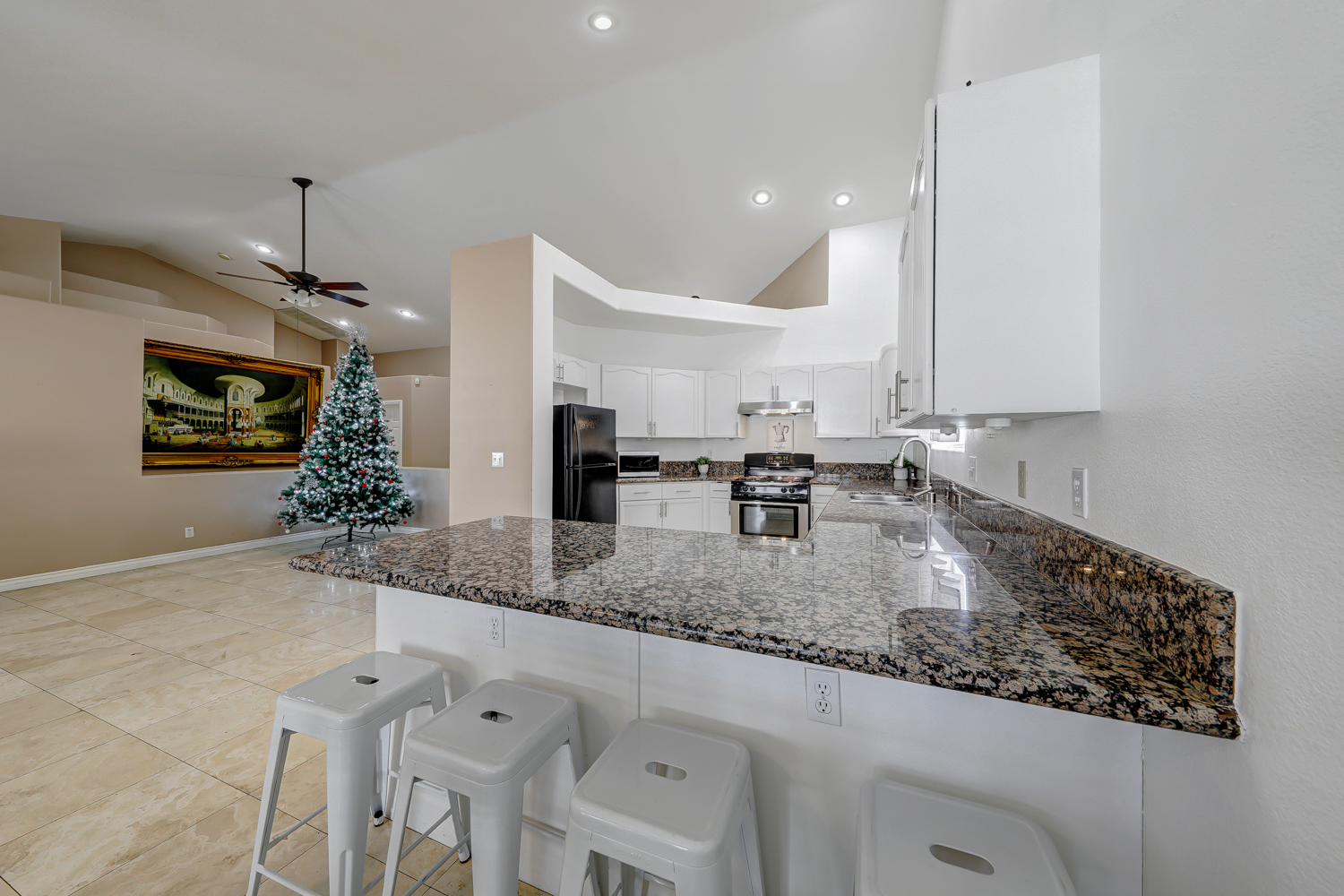 Cozy kitchen with stainless steel stove, granite countertops, fresh white cabinets, undermount sink, and breakfast bar with recess lighting. Spacious eat-in kitchen nook is large enough to seat six. Generous main suite with ensuite main bath, custom marble walk-in shower and tub, granite counters and large walk-in closet, white plantation shutters, and designer two-tone paint. Private and spacious backyard is ready to entertain and has enough space to build a pool. Solar System is included. Palm Gardens Community Amenities include a Playground, Basketball & Tennis courts.