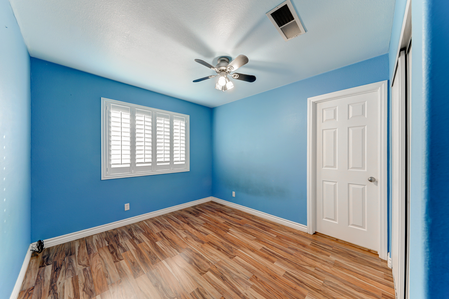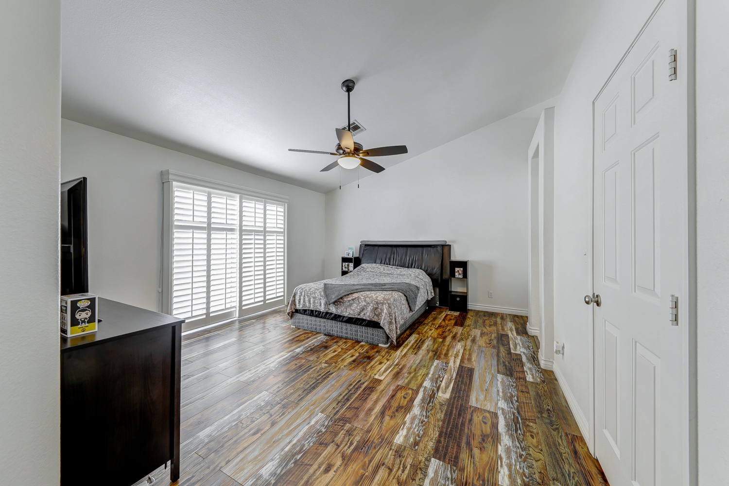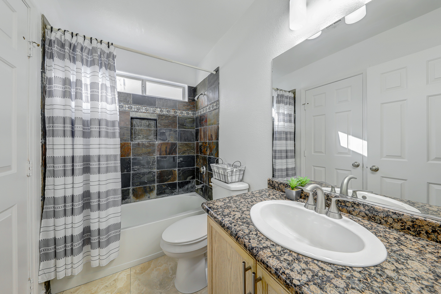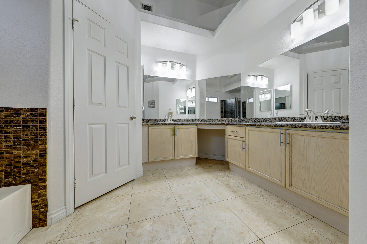 Cozy kitchen with stainless steel stove, granite countertops, fresh white cabinets, undermount sink, and breakfast bar with recess lighting. Spacious eat-in kitchen nook is large enough to seat six. Generous main suite with ensuite main bath, custom marble walk-in shower and tub, granite counters and large walk-in closet, white plantation shutters, and designer two-tone paint. Private and spacious backyard is ready to entertain and has enough space to build a pool. Solar System is included. Palm Gardens Community Amenities include a Playground, Basketball & Tennis courts.