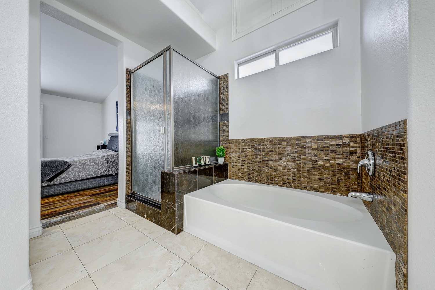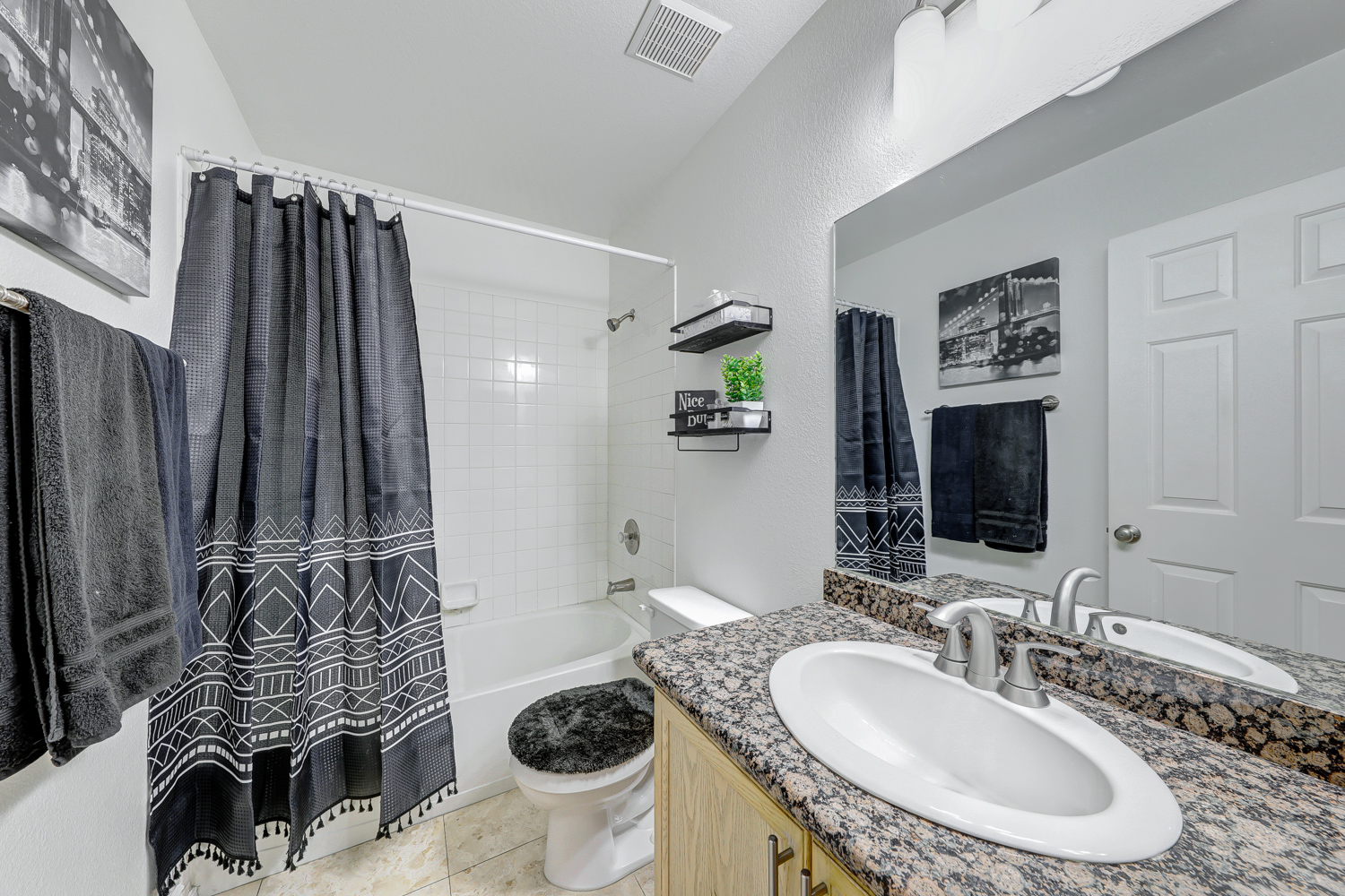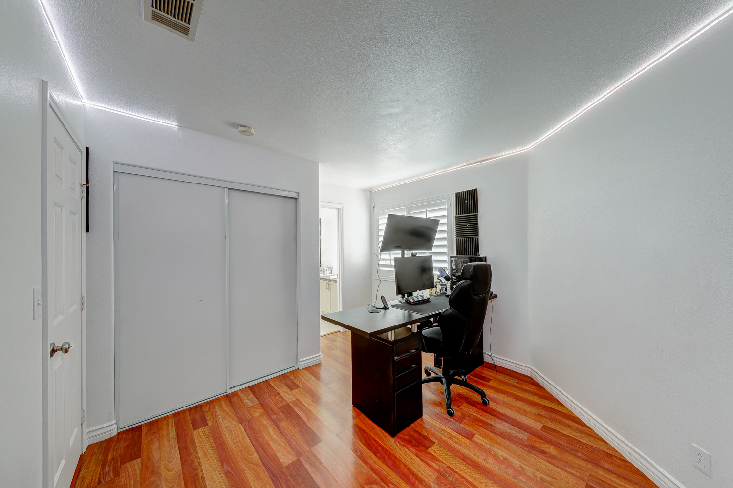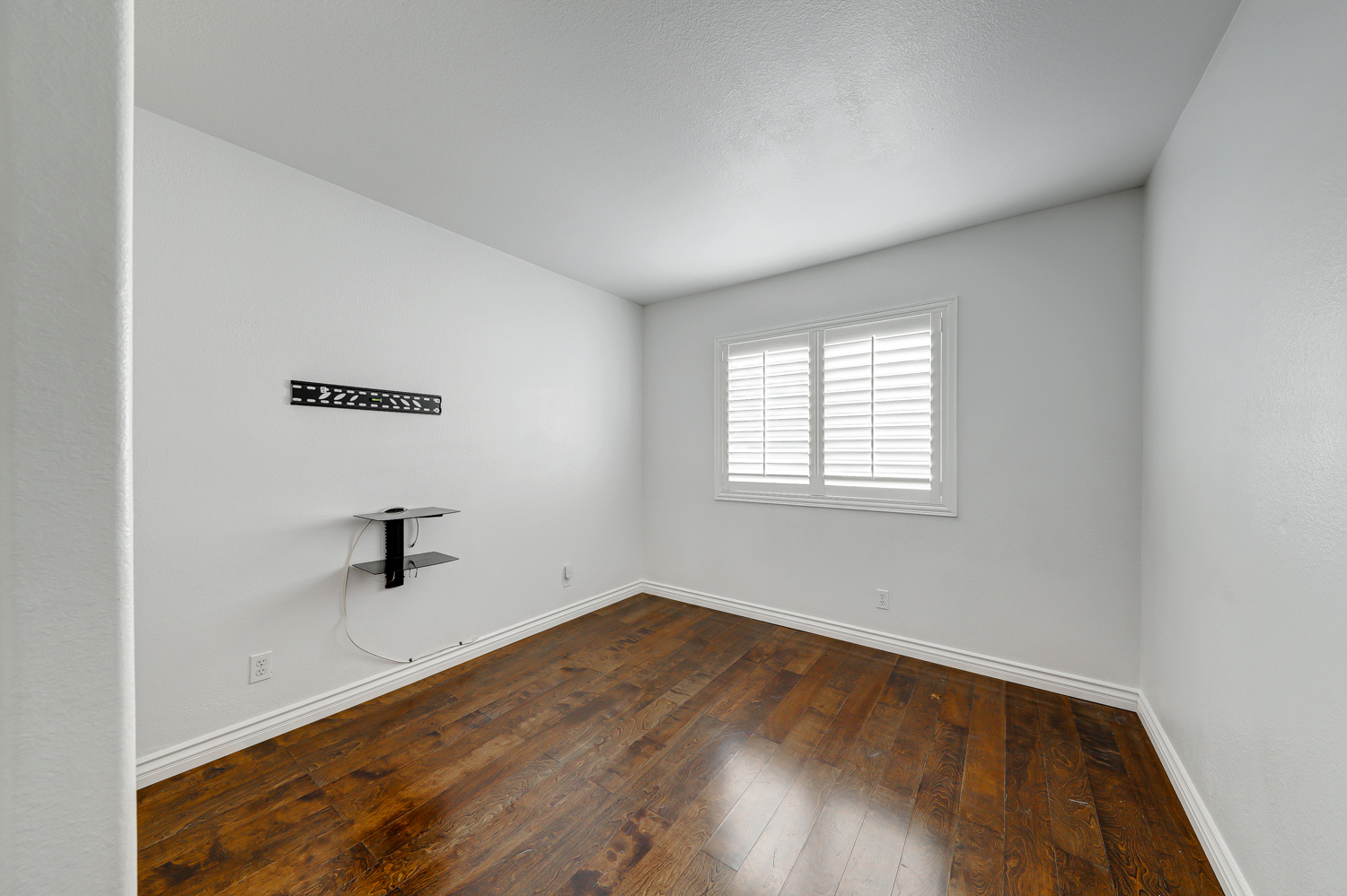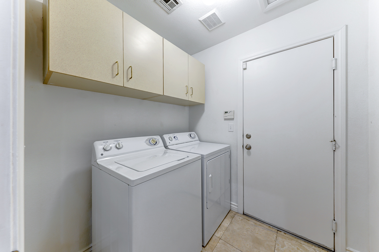Cozy kitchen with stainless steel stove, granite countertops, fresh white cabinets, undermount sink, and breakfast bar with recess lighting. Spacious eat-in kitchen nook is large enough to seat six. Generous main suite with ensuite main bath, custom marble walk-in shower and tub, granite counters and large walk-in closet, white plantation shutters, and designer two-tone paint. Private and spacious backyard is ready to entertain and has enough space to build a pool. Solar System is included. Palm Gardens Community Amenities include a Playground, Basketball & Tennis courts.