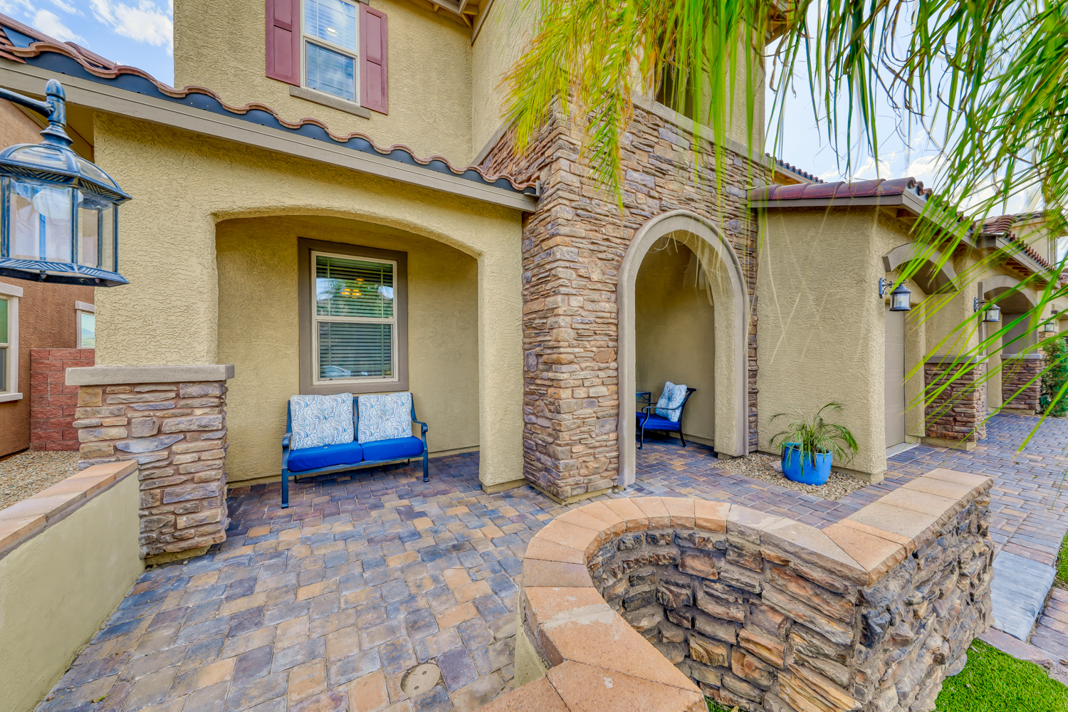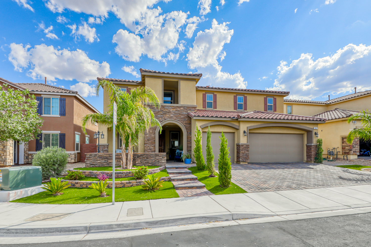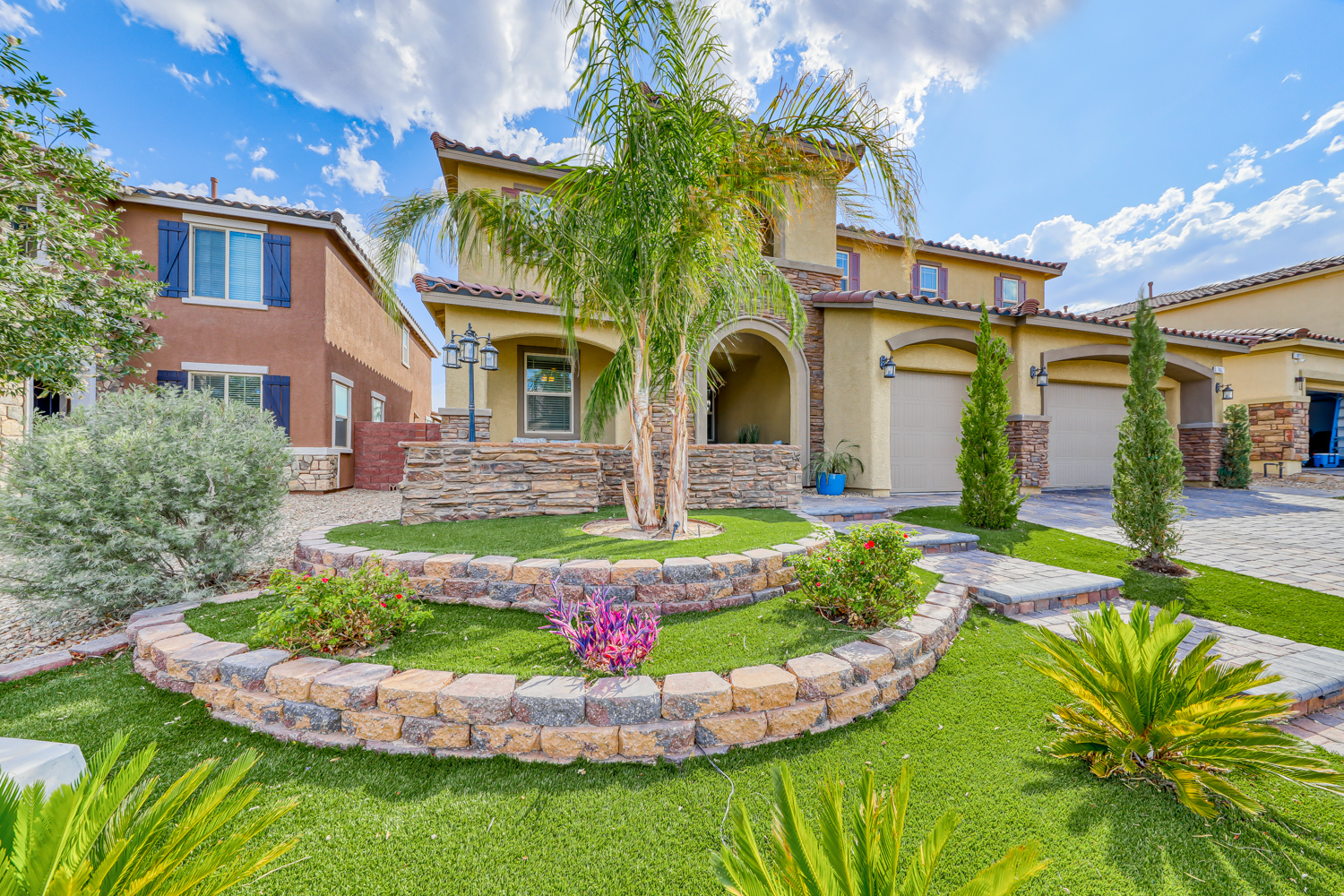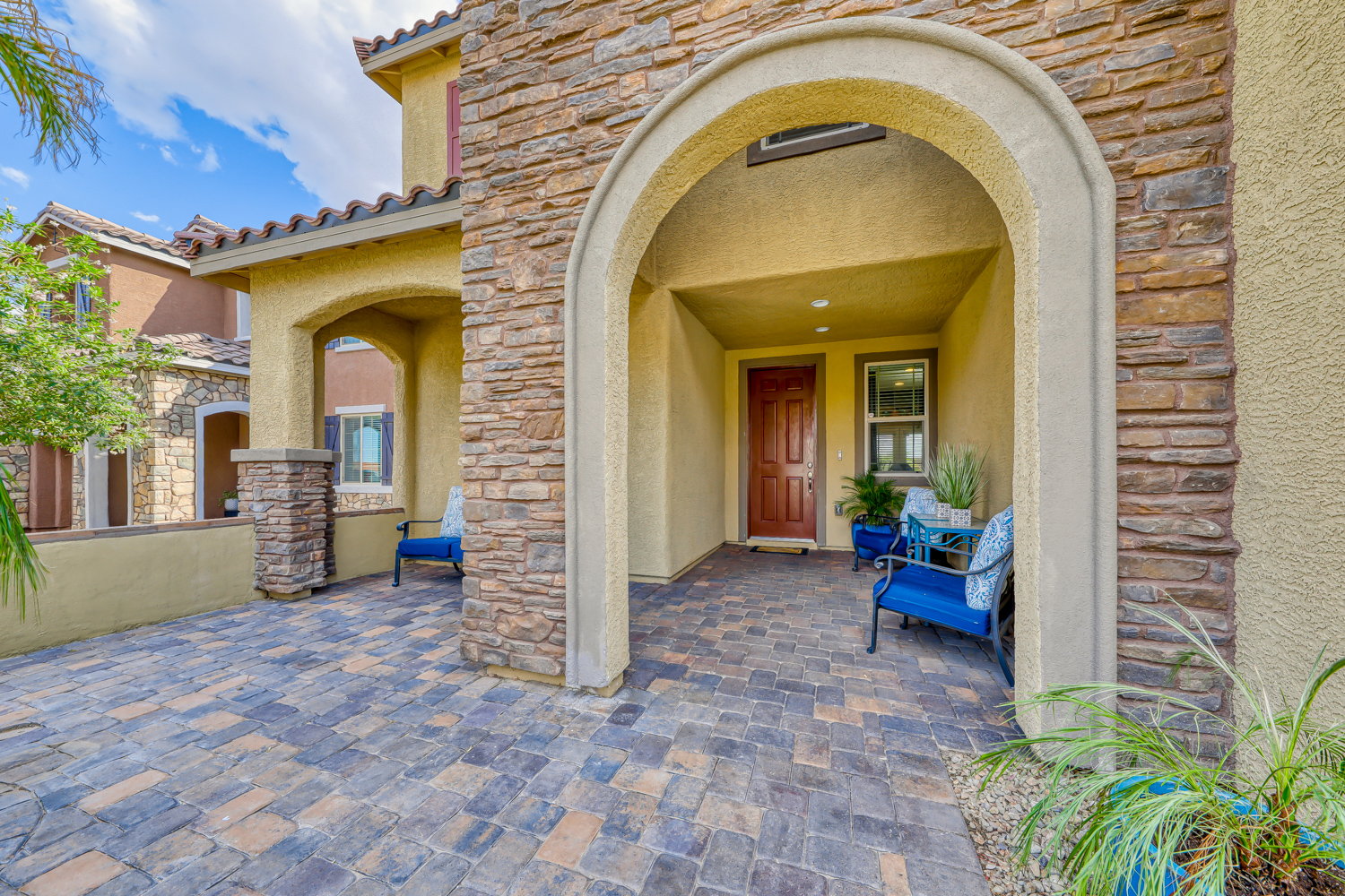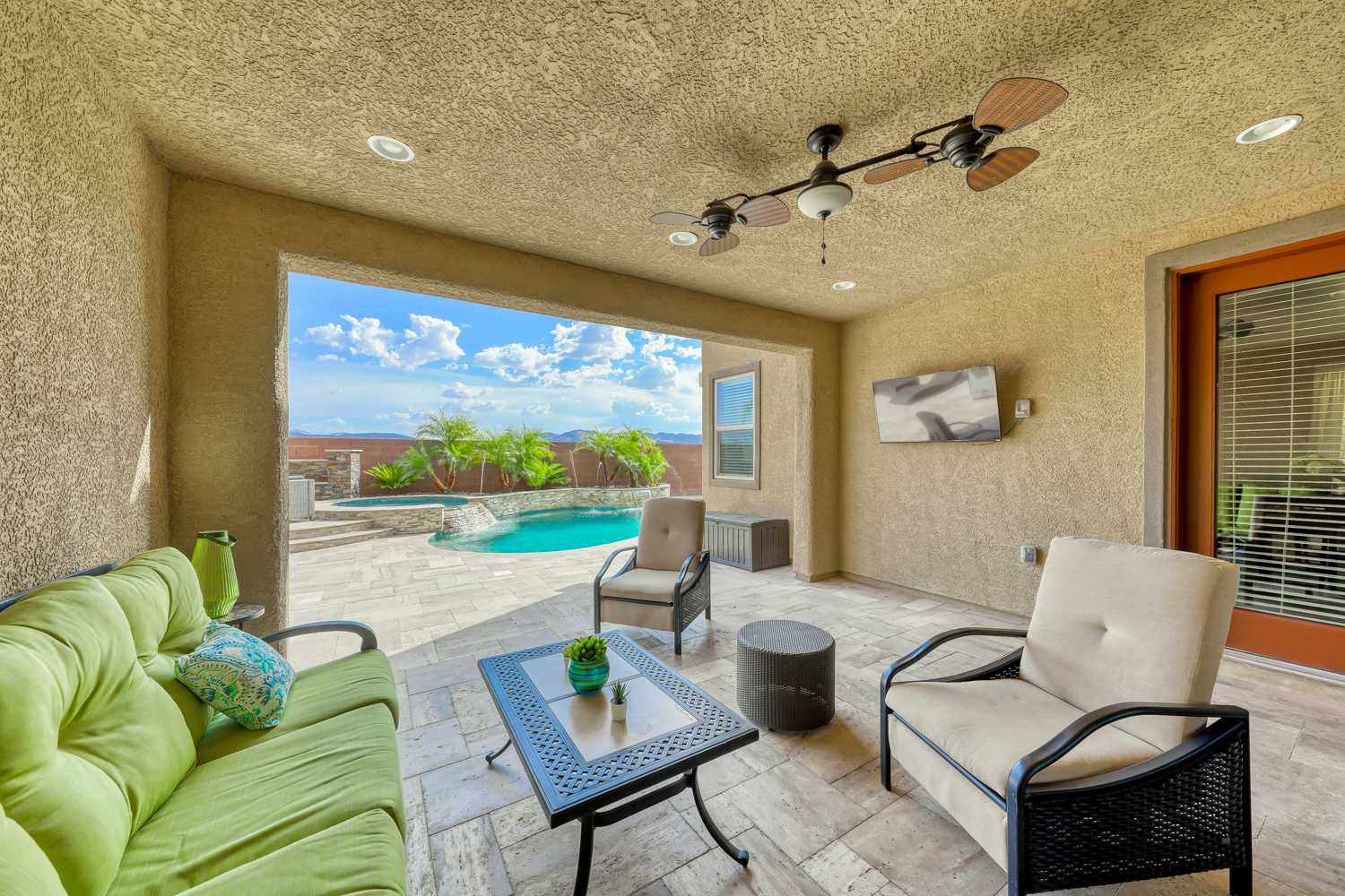 A sizeable covered front porch leads to the paver walkway. Large private backyard backs to future expanded Mountain’s Edge Regional Park area. Resort Style backyard w/ fully tiled travertine hard surface deck area, covered patio with pre-wired outdoor TV and Surround Sound.
