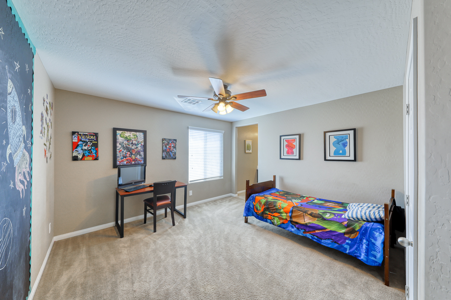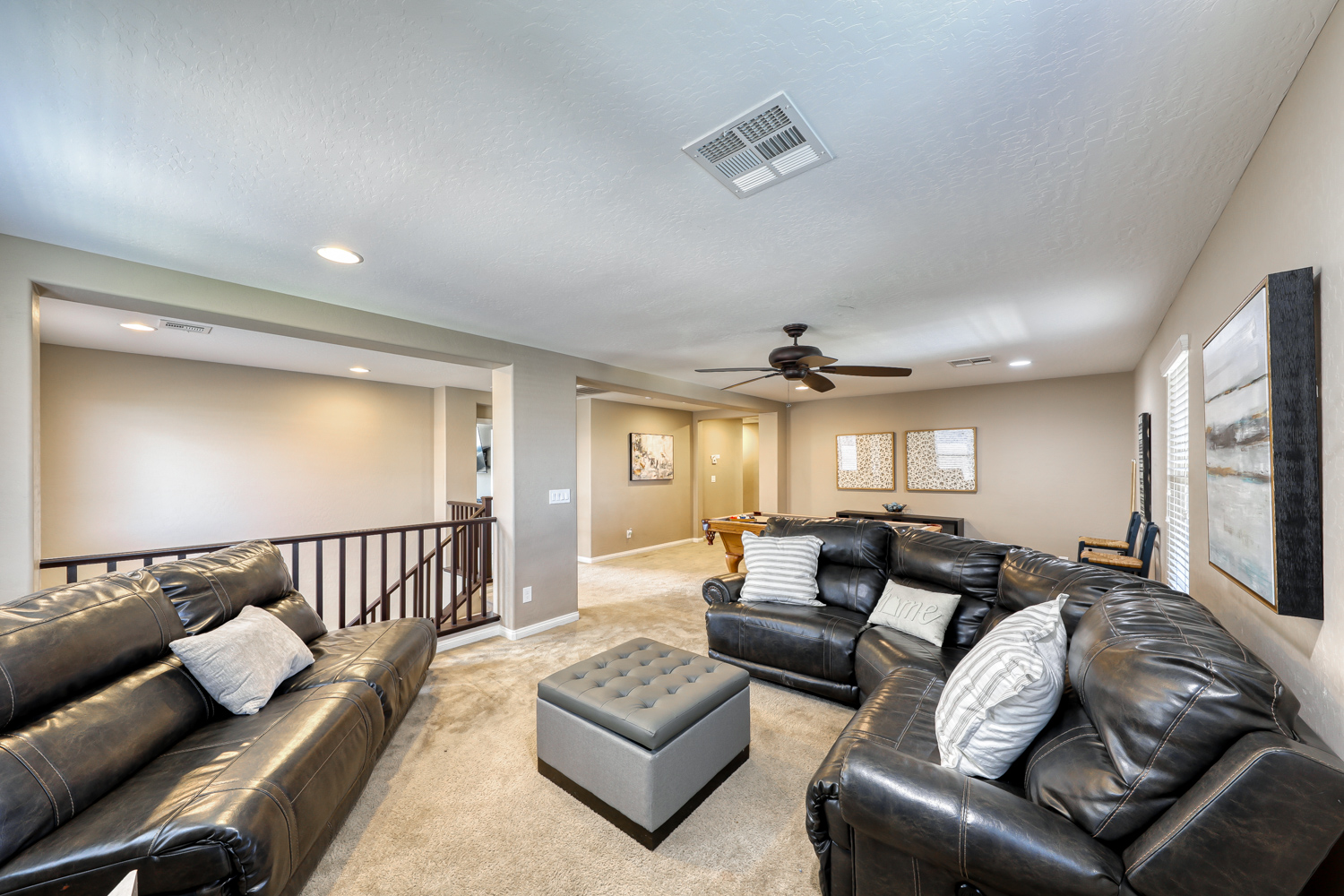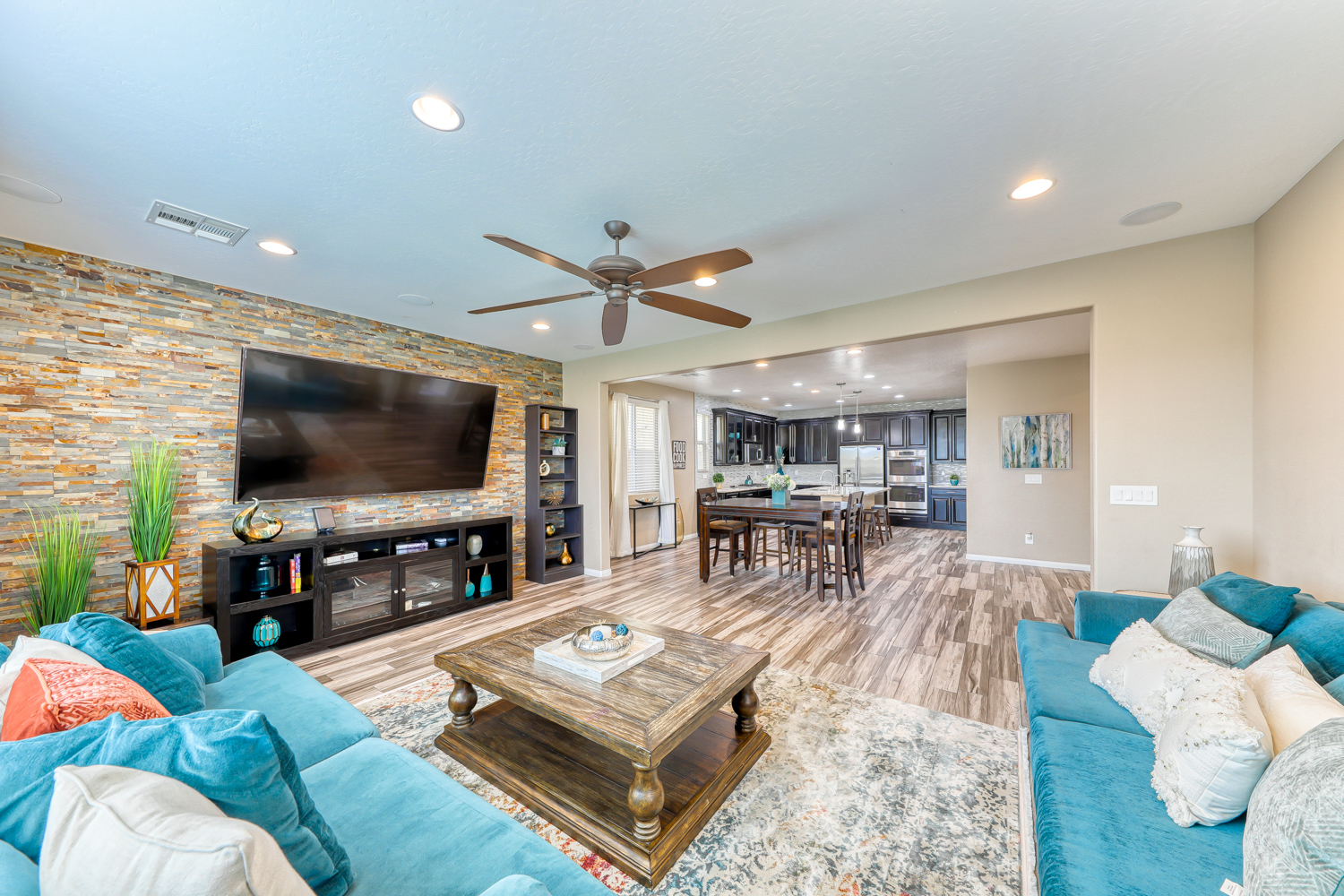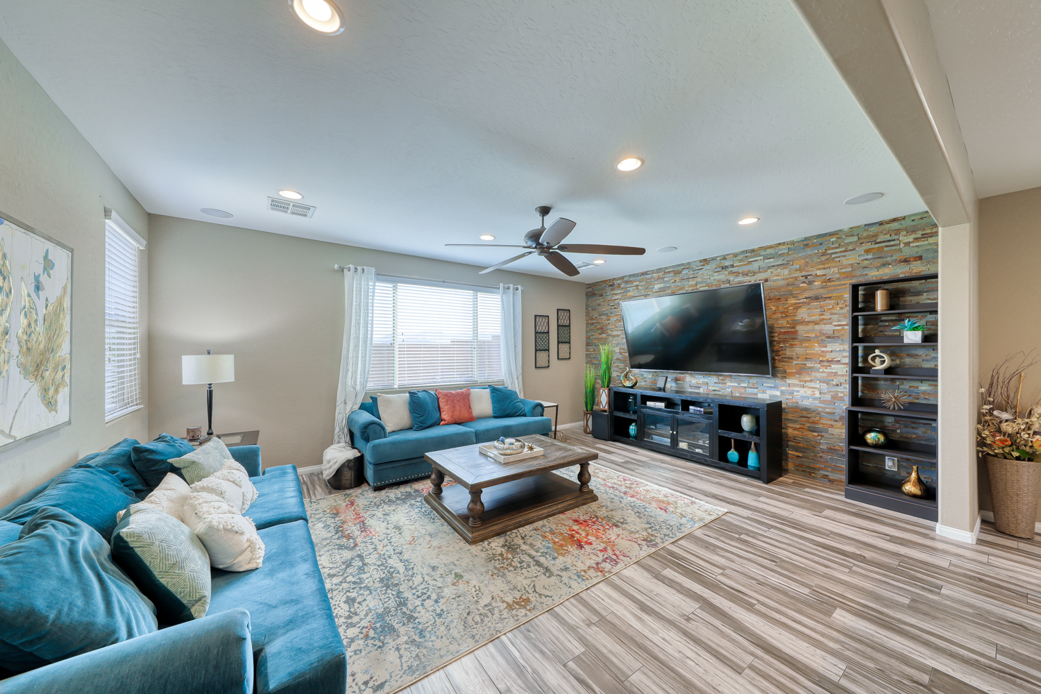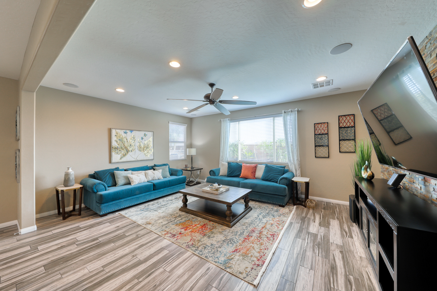 A sizeable covered front porch leads to the paver walkway. Large private backyard backs to future expanded Mountain’s Edge Regional Park area. Resort Style backyard w/ fully tiled travertine hard surface deck area, covered patio with pre-wired outdoor TV and Surround Sound.