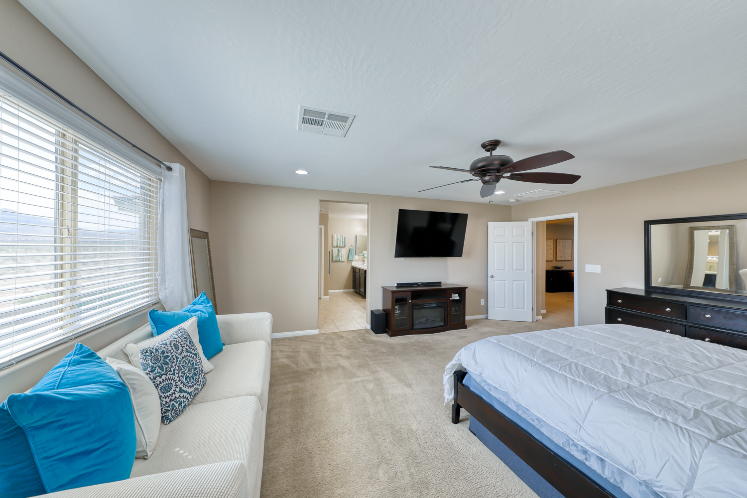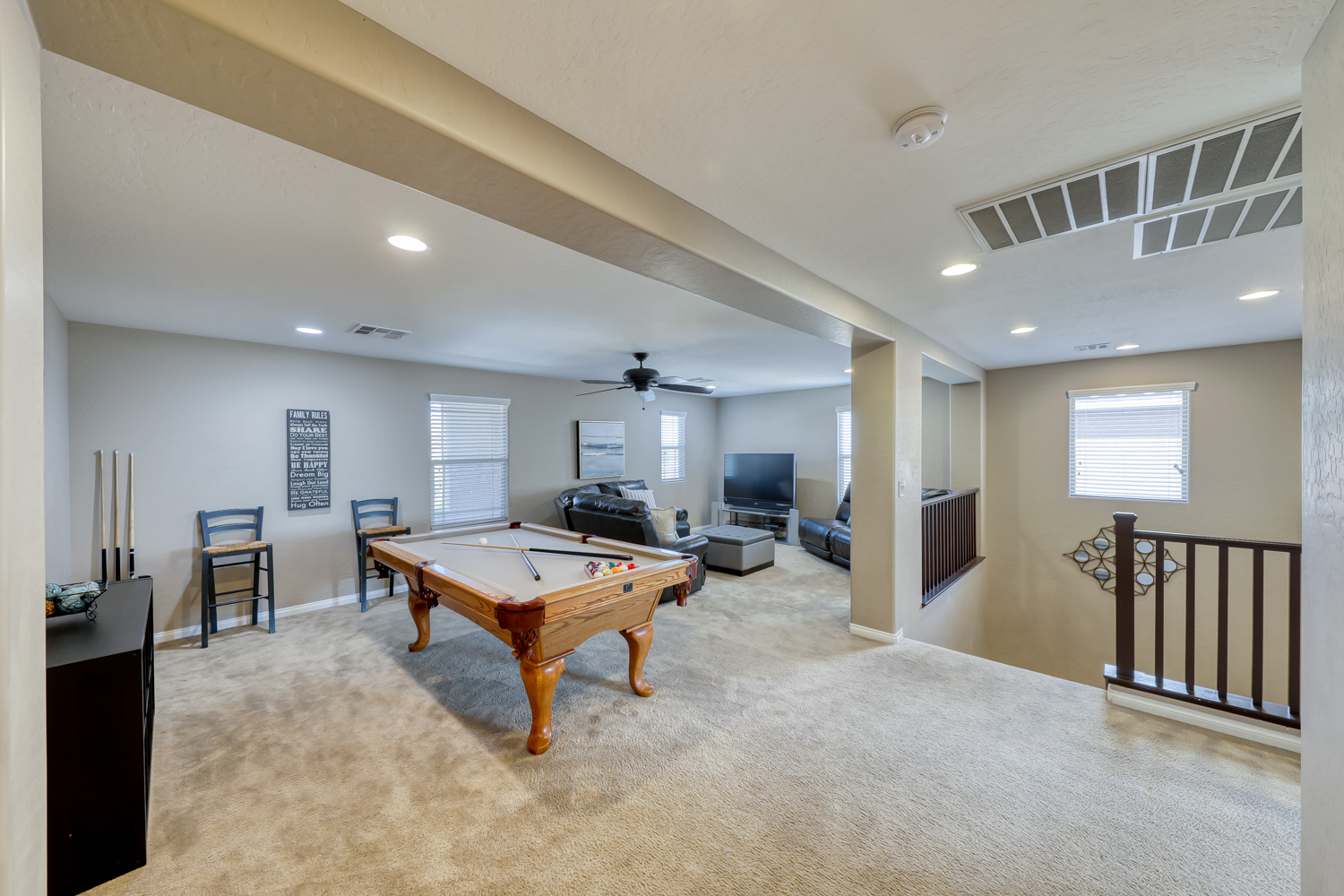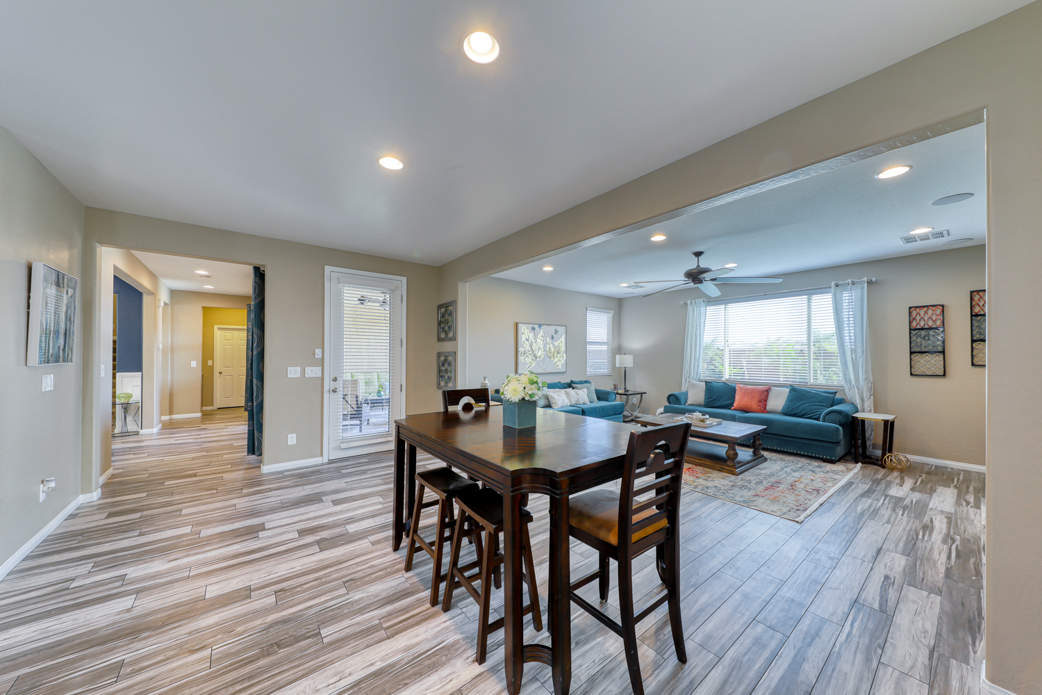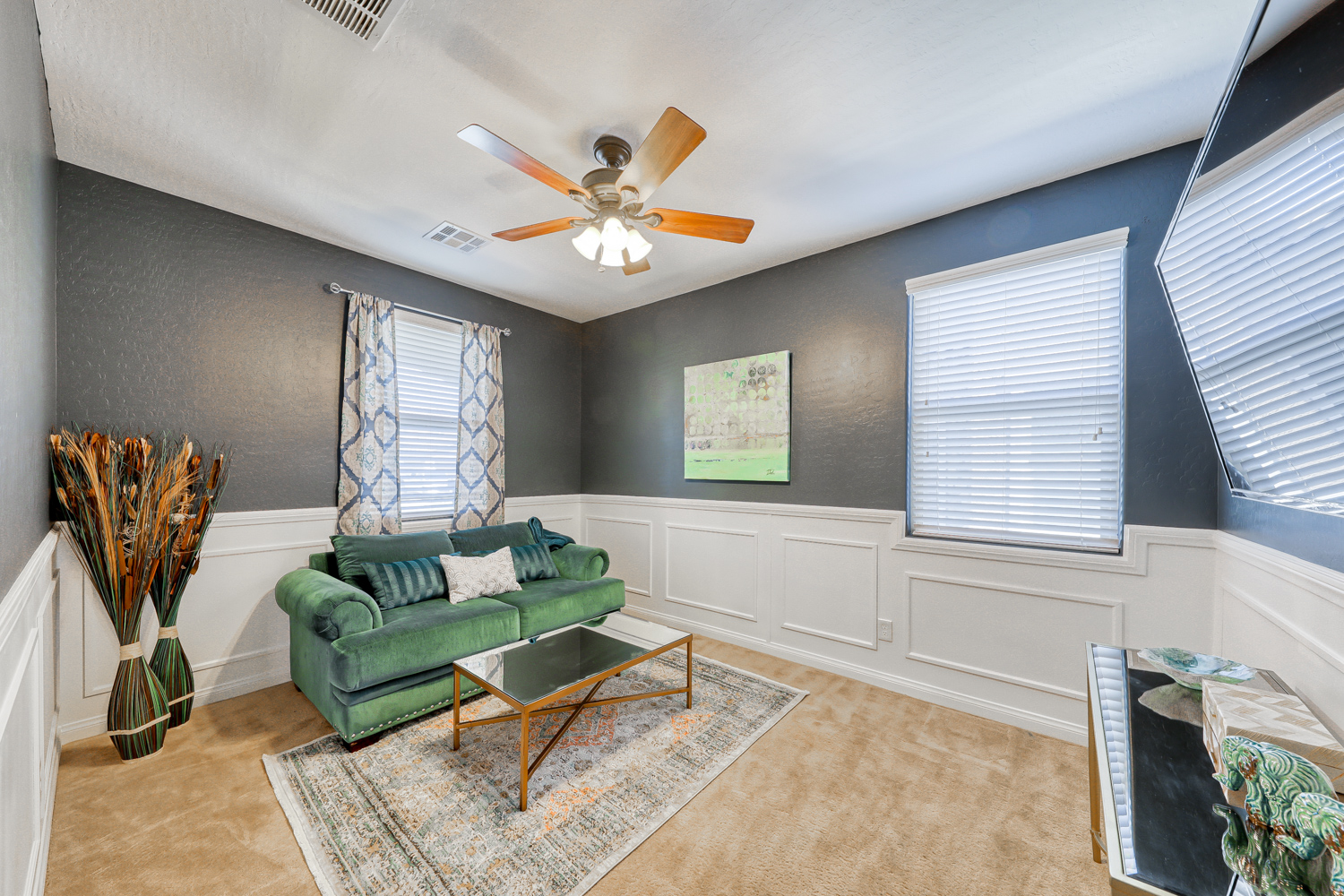 Ceramic wood plank-style flooring in all downstairs areas, carpet in bedrooms, and tile flooring in all bathrooms.