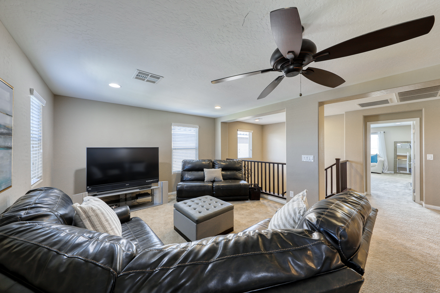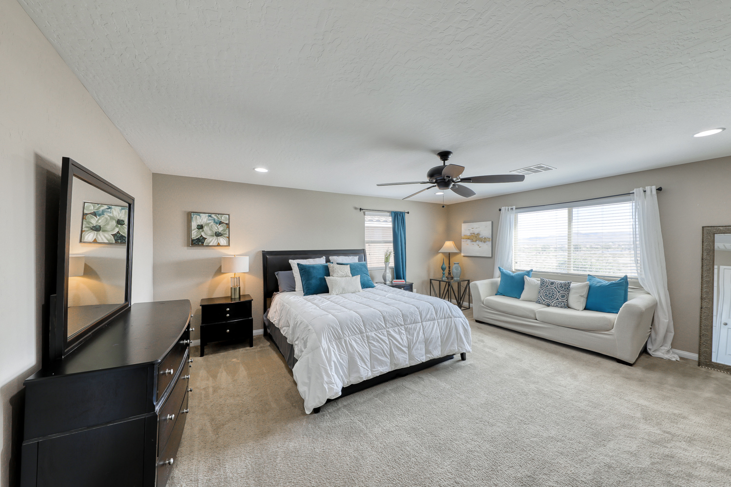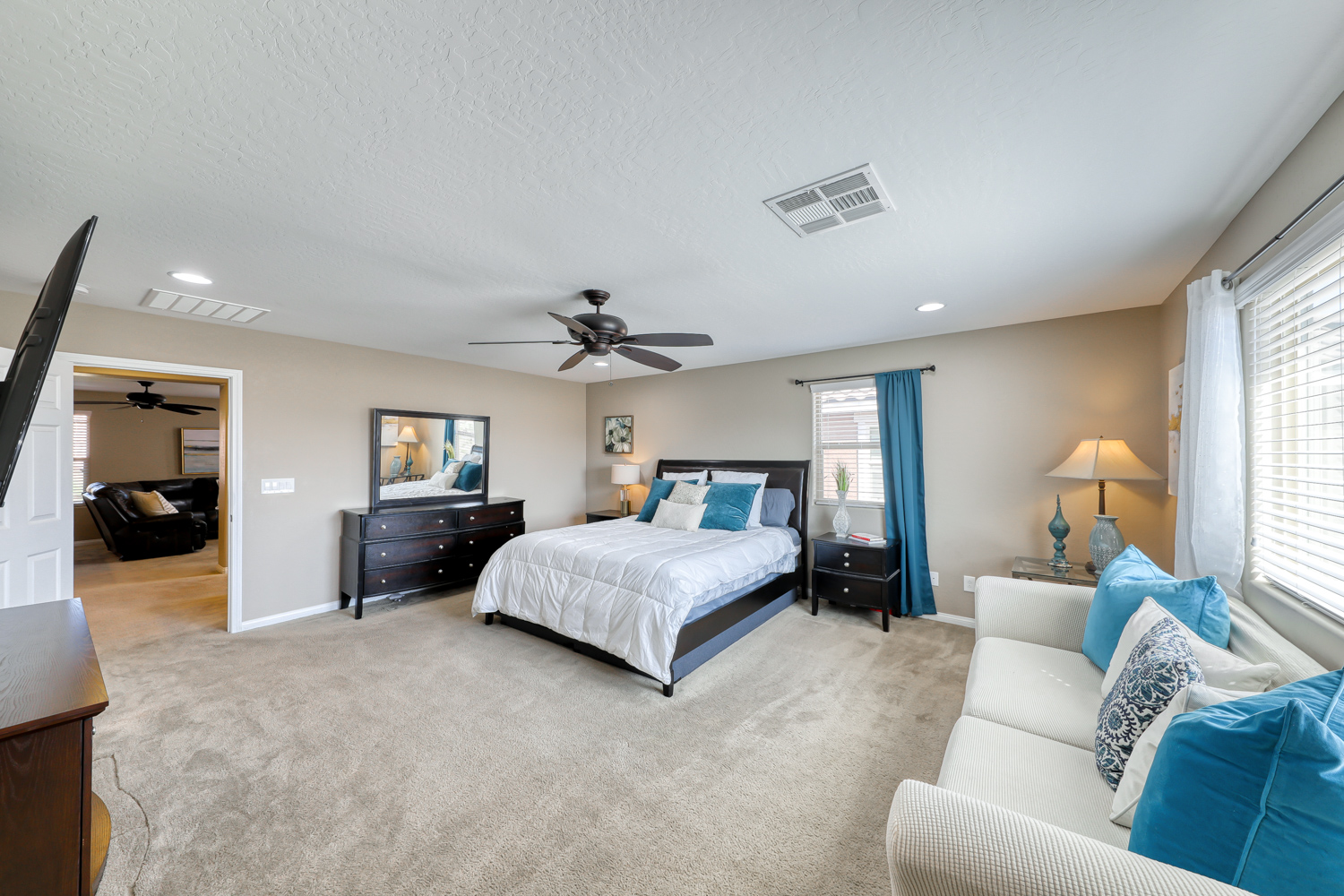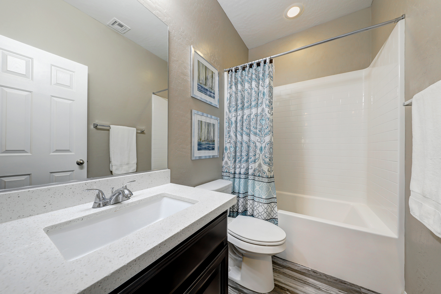 Ceramic wood plank-style flooring in all downstairs areas, carpet in bedrooms, and tile flooring in all bathrooms.