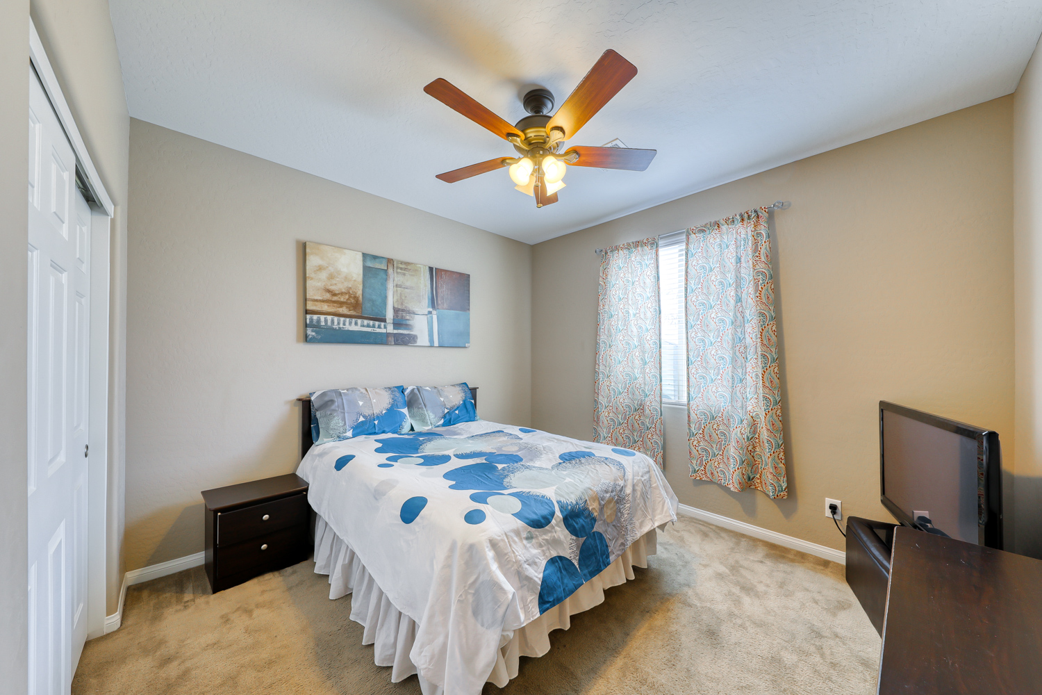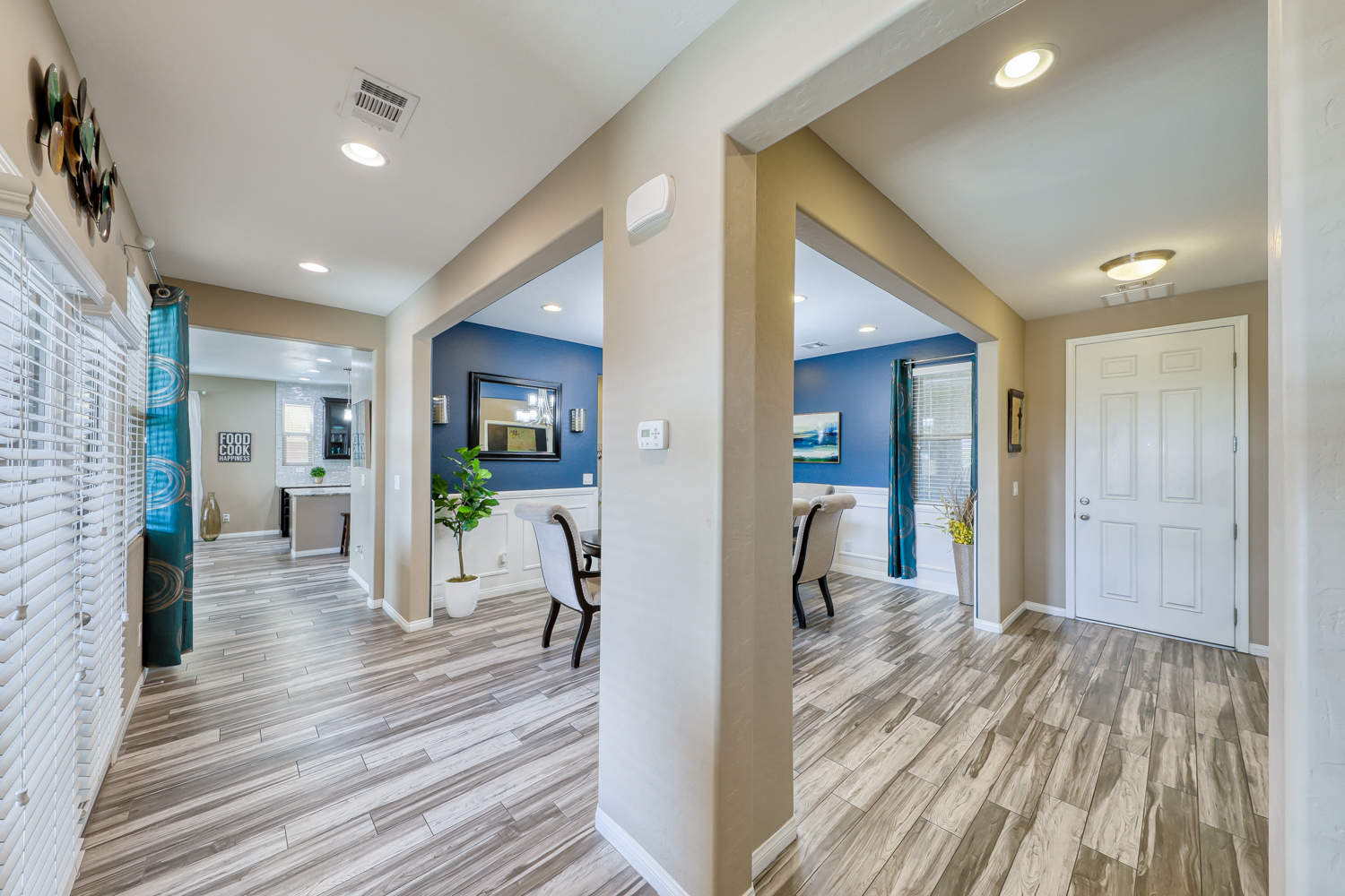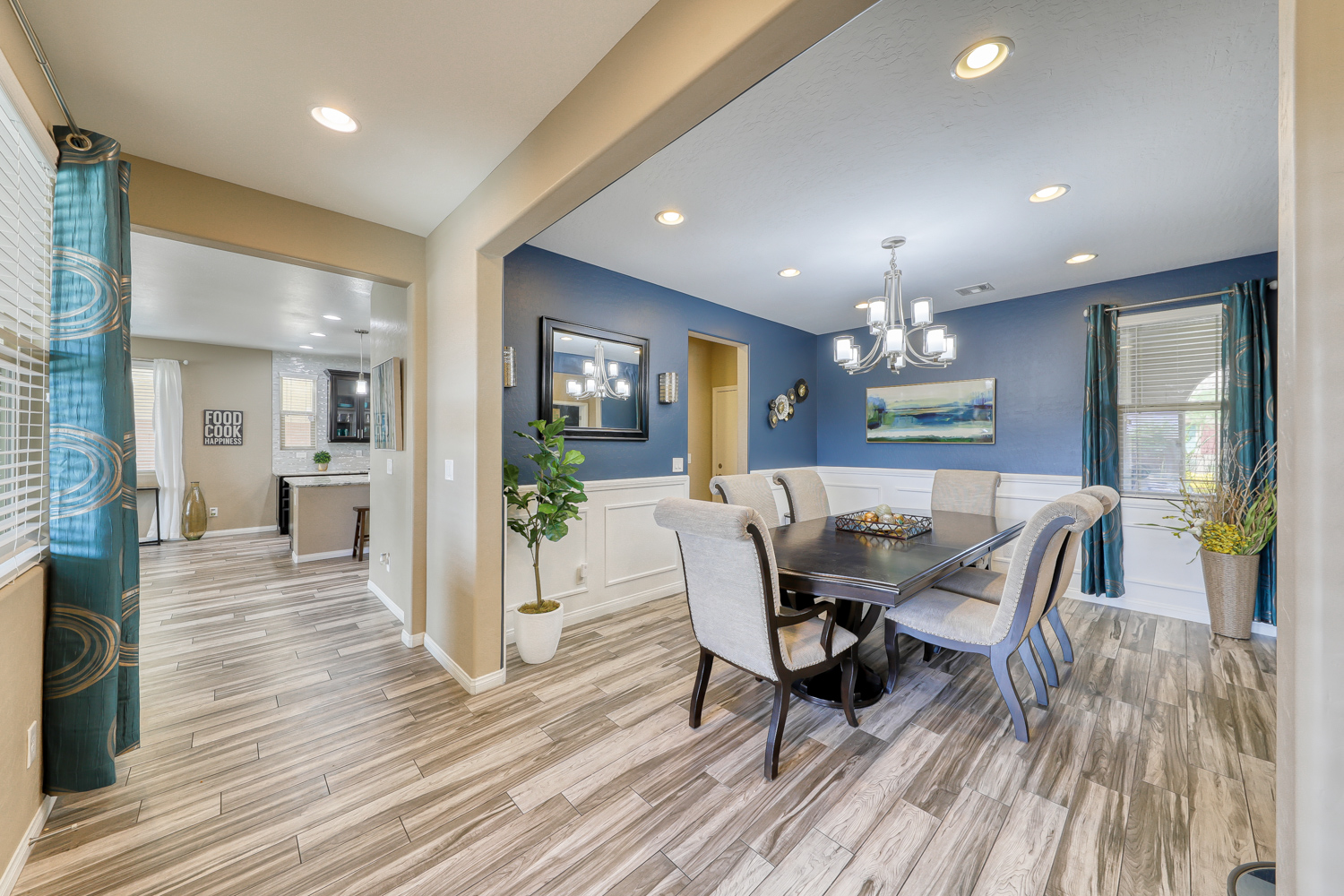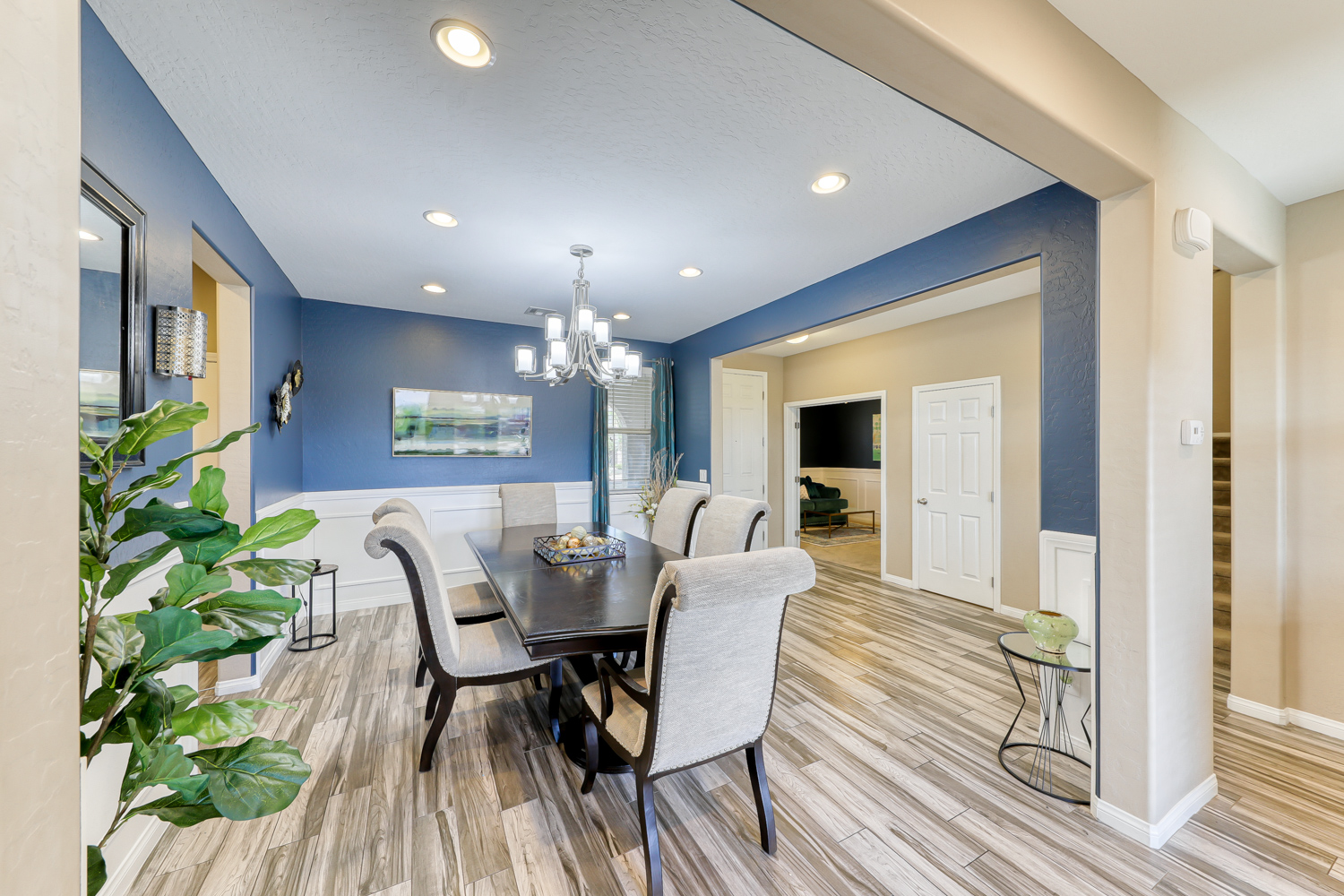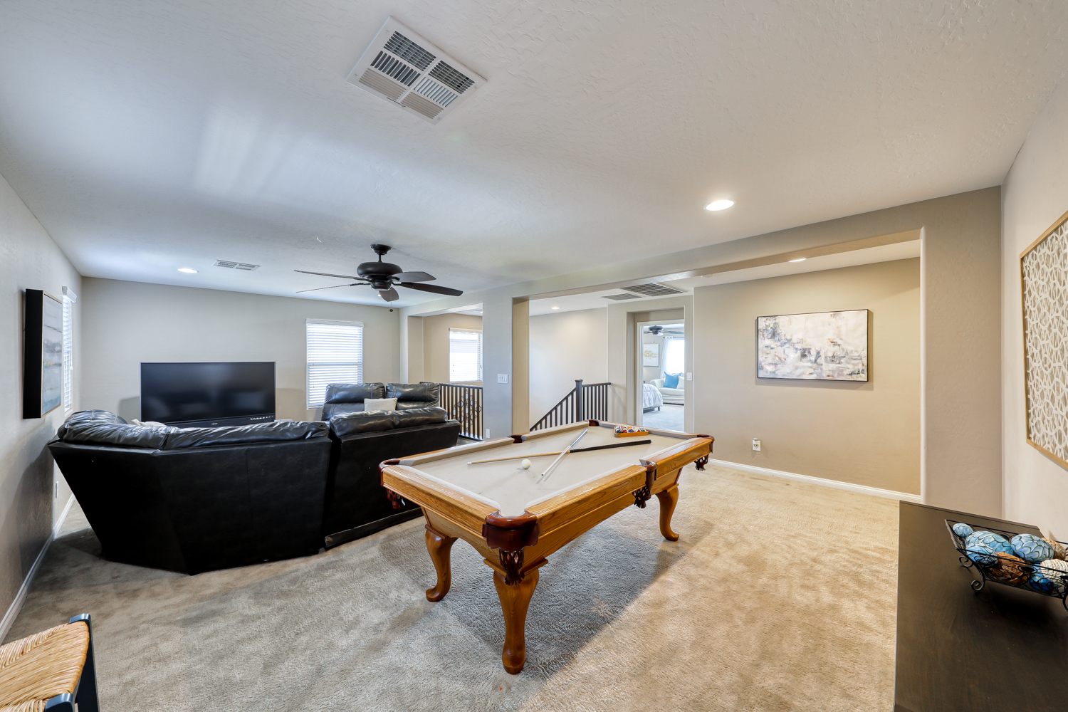 Ceramic wood plank-style flooring in all downstairs areas, carpet in bedrooms, and tile flooring in all bathrooms.