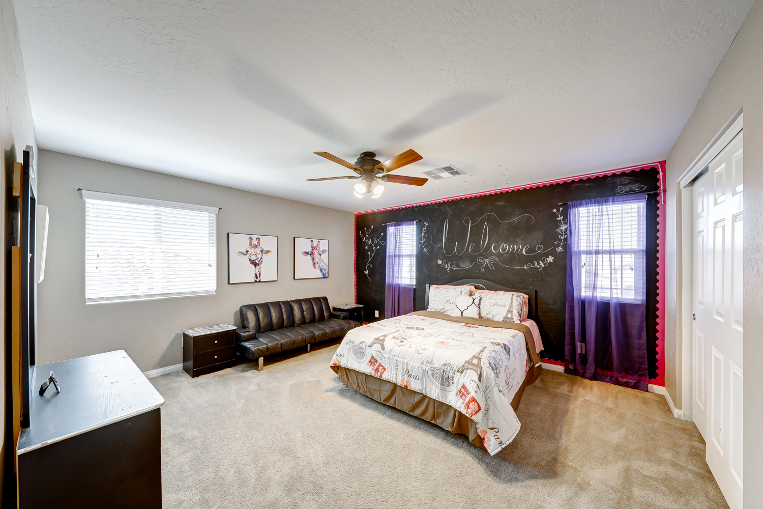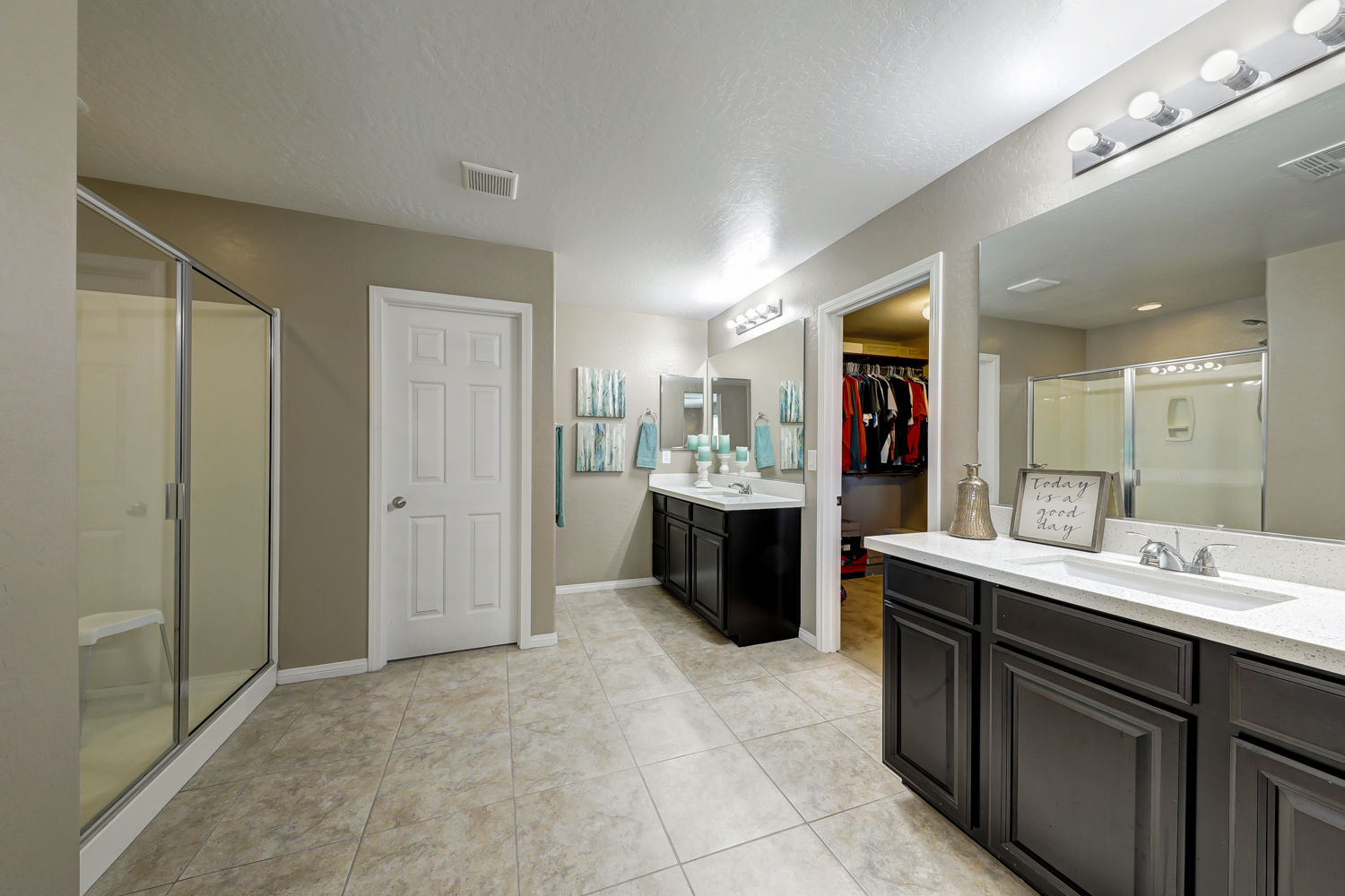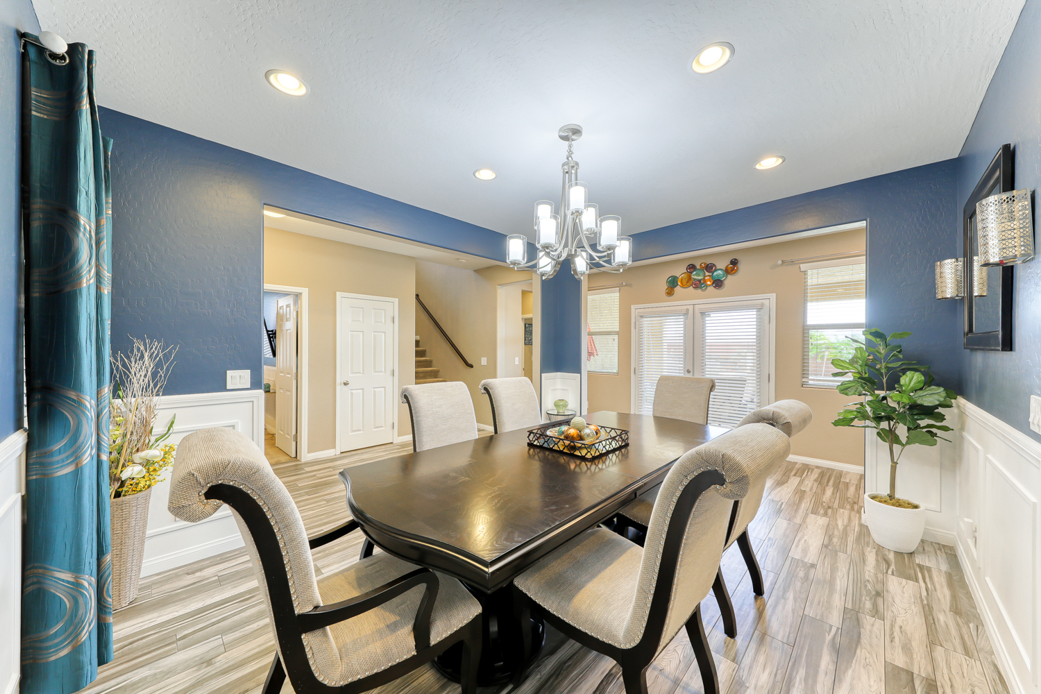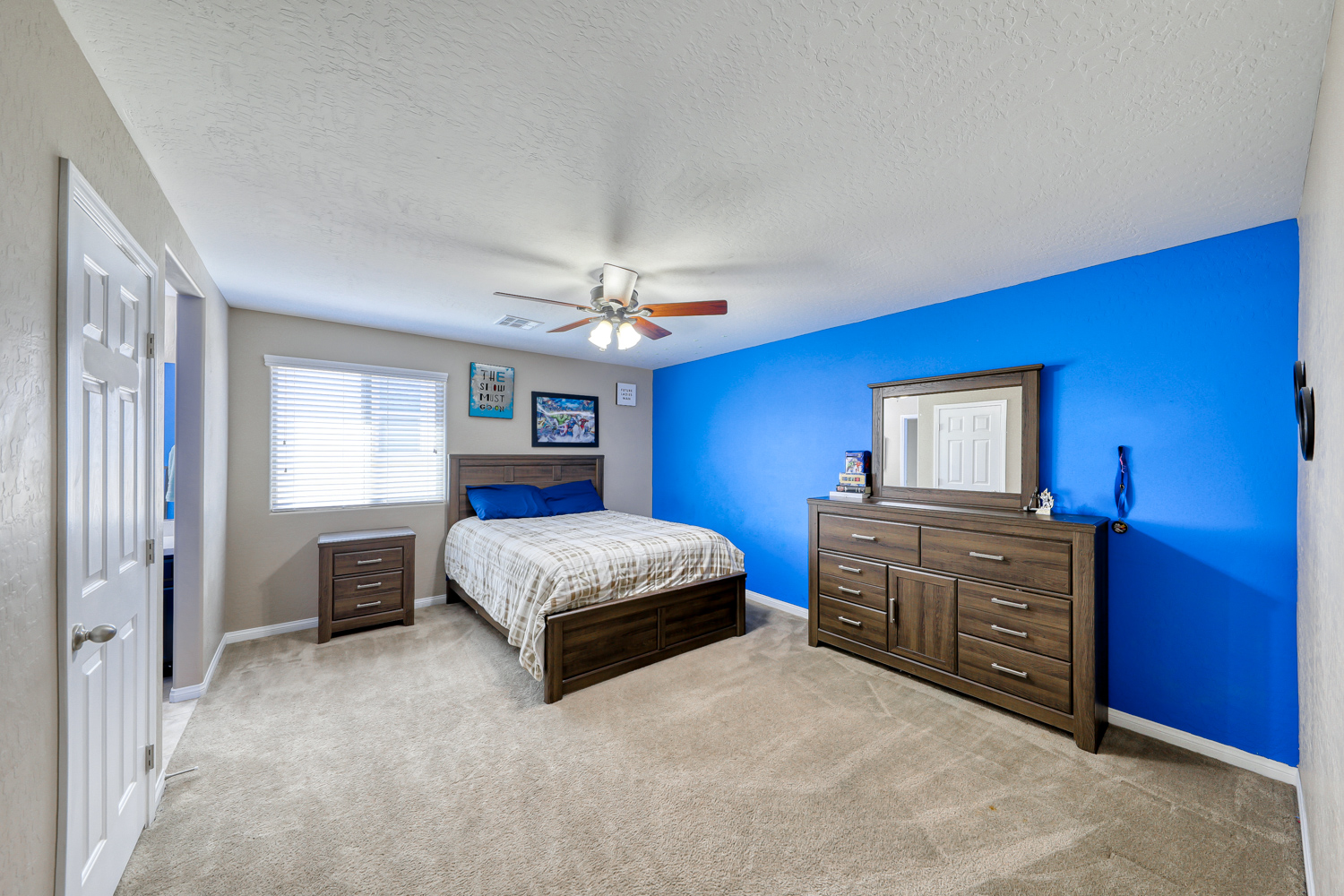 Ceramic wood plank-style flooring in all downstairs areas, carpet in bedrooms, and tile flooring in all bathrooms.