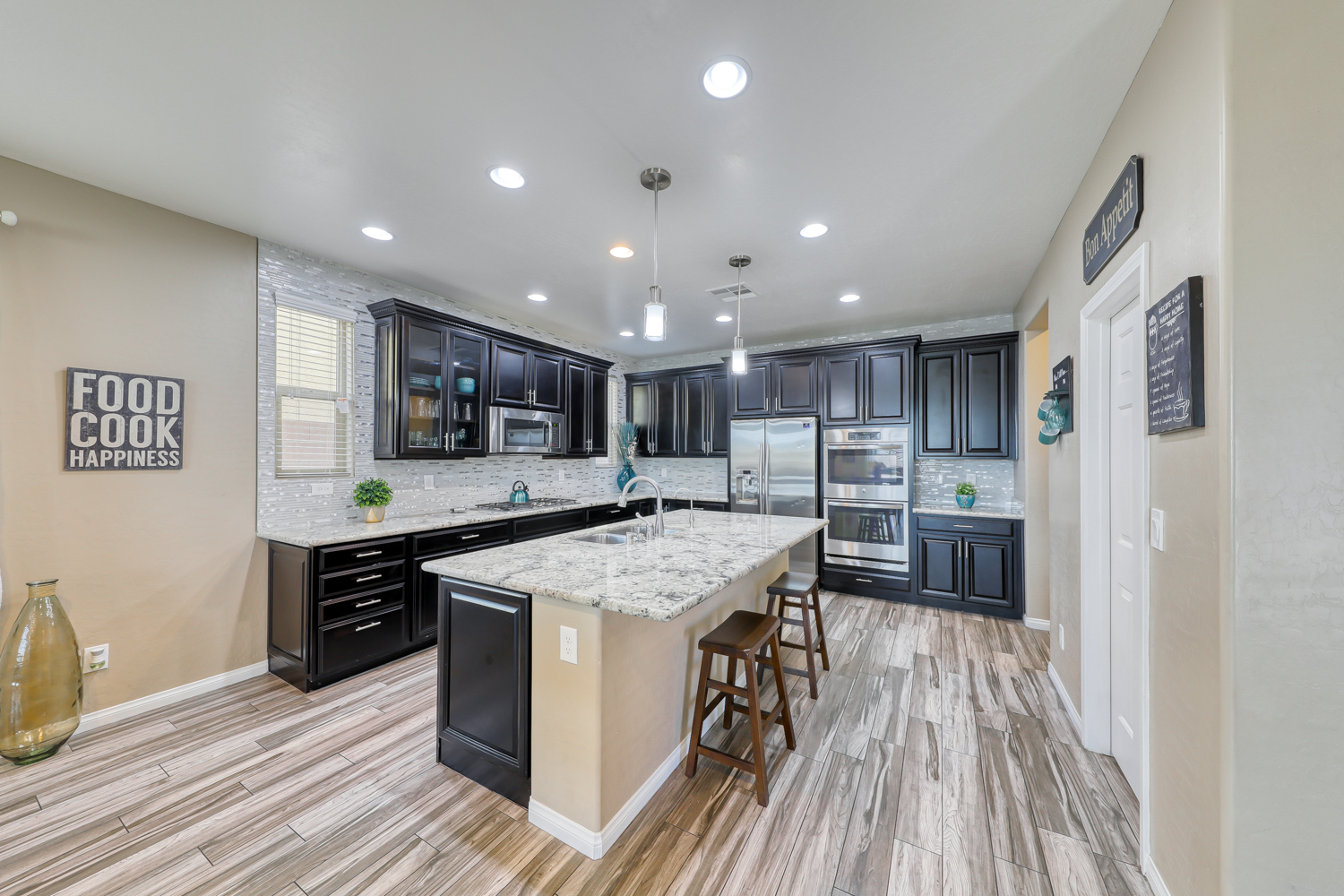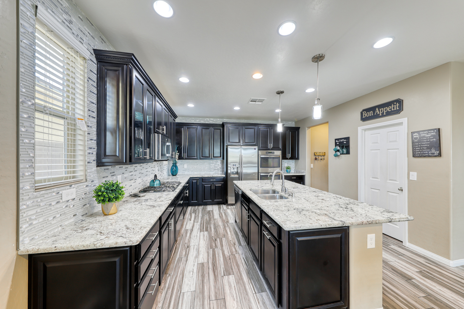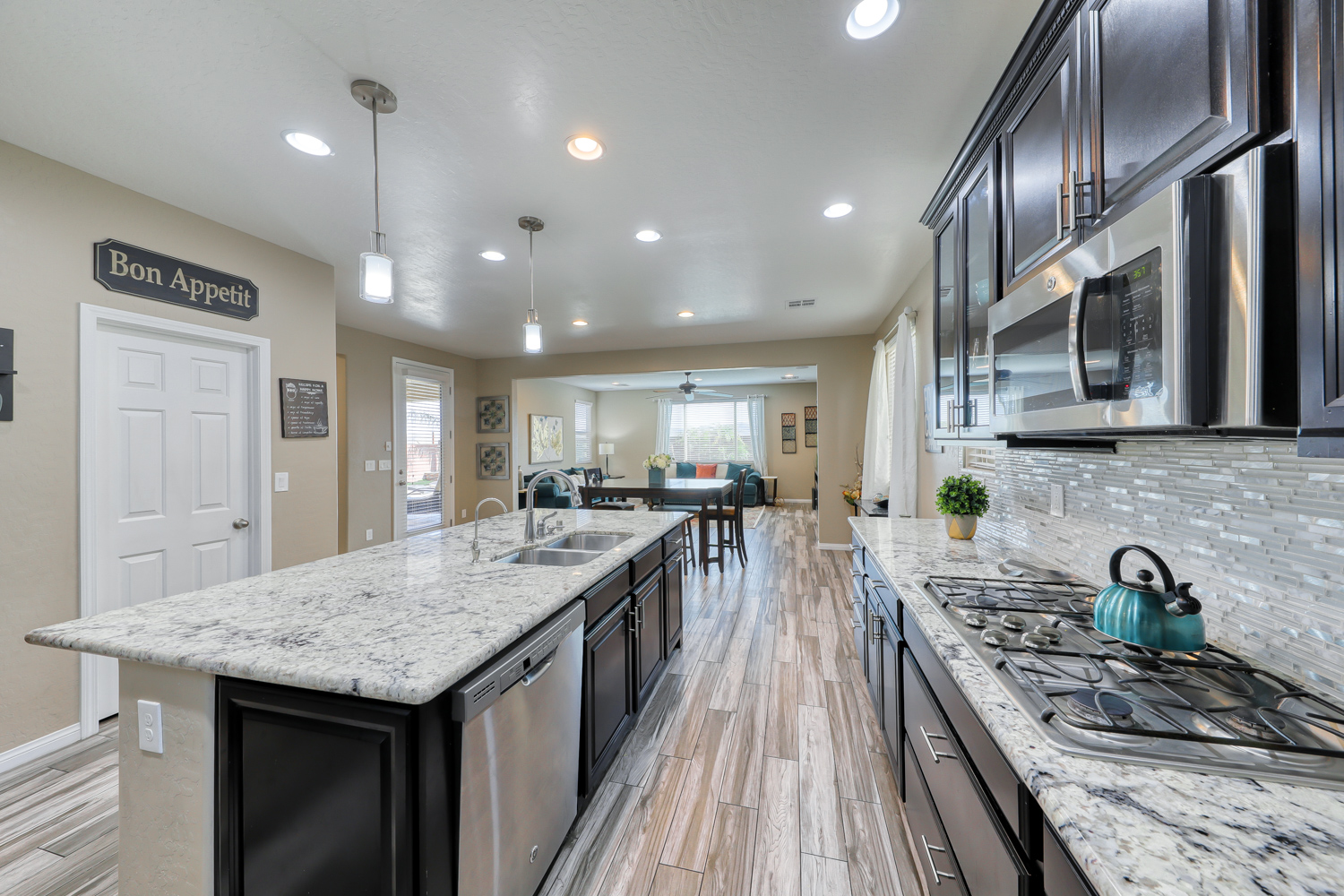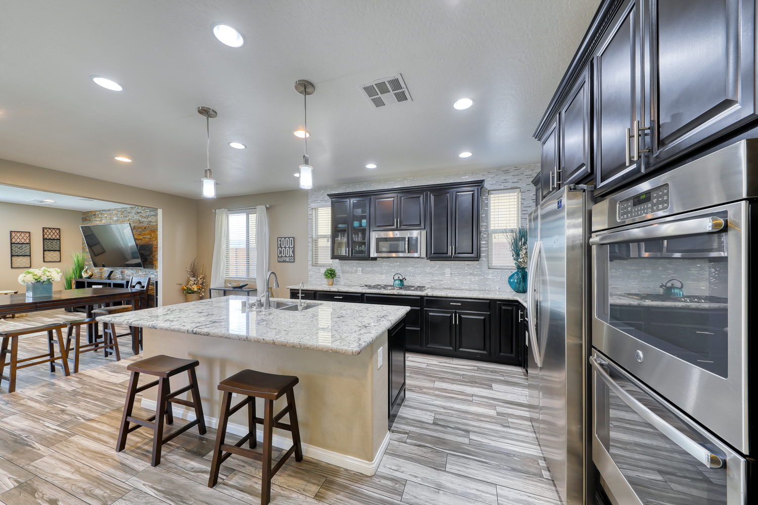Modern kitchen with glass tile and backsplash, gorgeous White Granite Counters, and Espresso 42 Inch cabinets. GE stainless steel (SS) Appliances with double oven and sit-down Island.