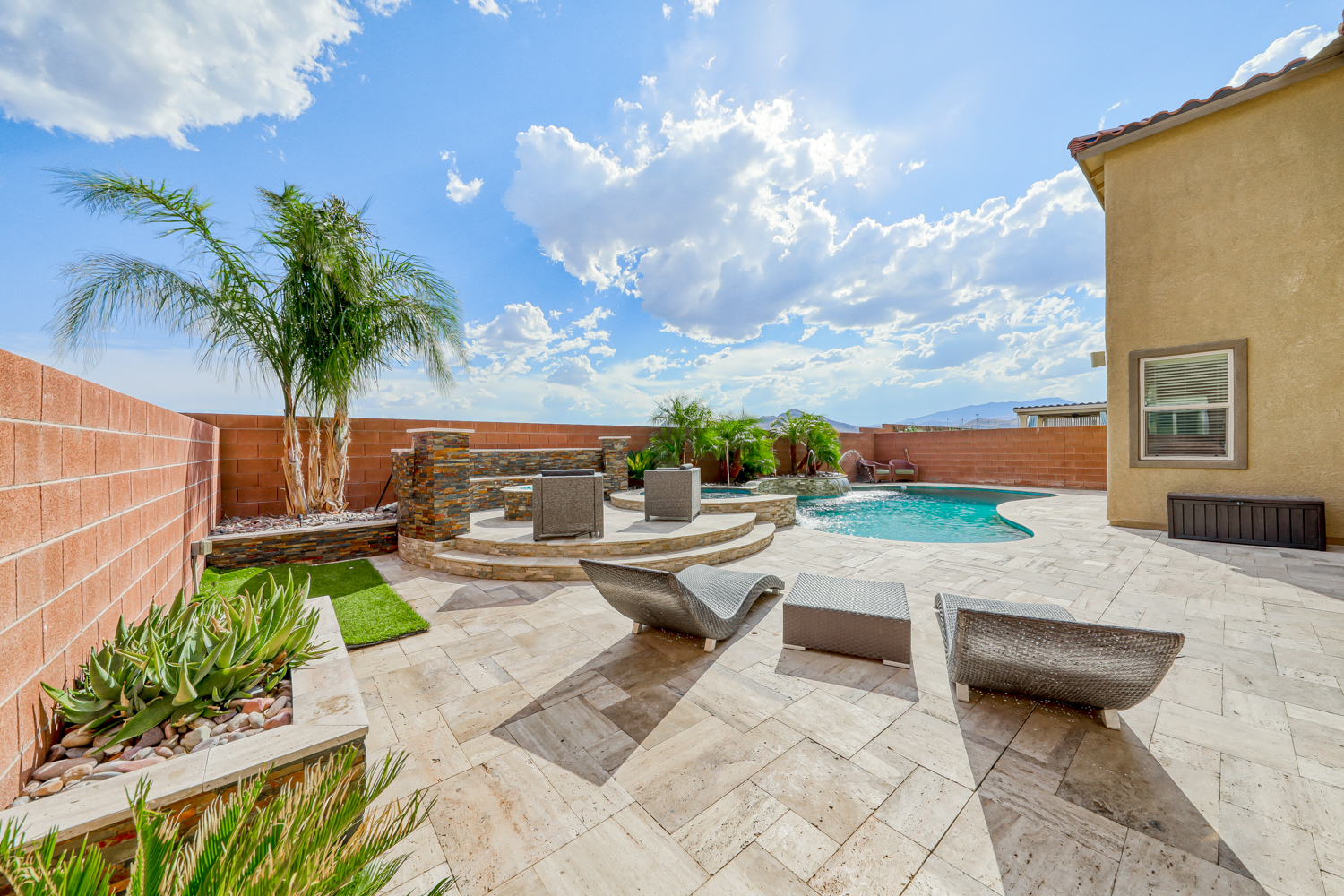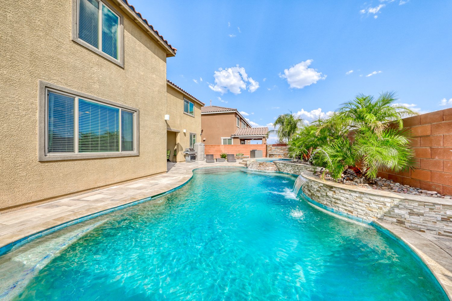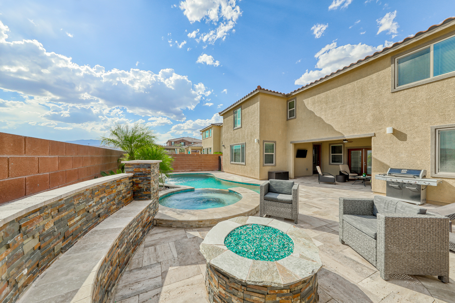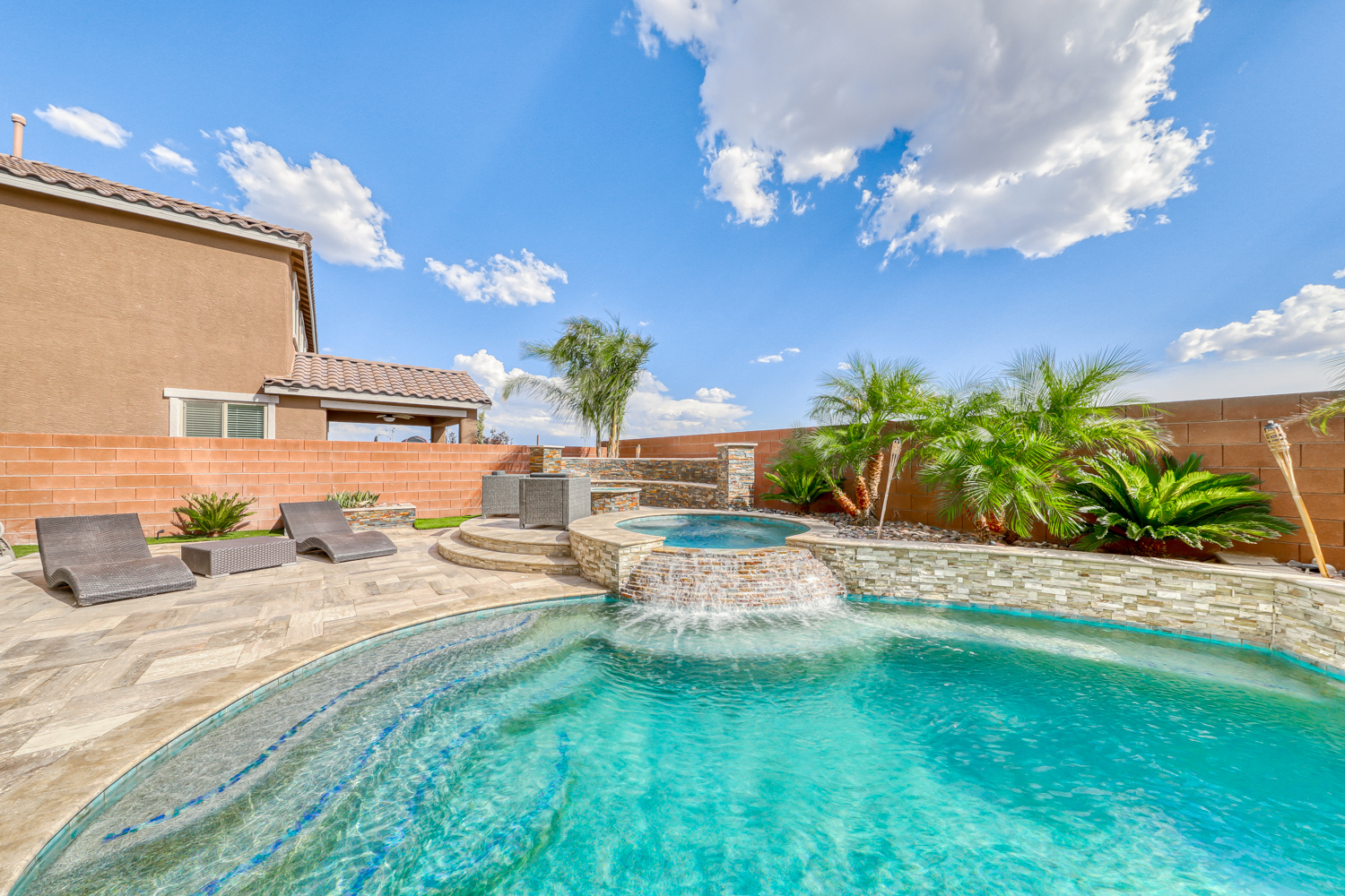 Backyard with stunning Tropical Pool and Spa w/ Stacked Stone Waterfall and sheer descent. Multiple benches & color-changing LED mini lights in the pool. Also includes a connected seating area with glass fire stone in a gas fire pit, perfect for hosting events under Mountain’s Edge Desert skies.